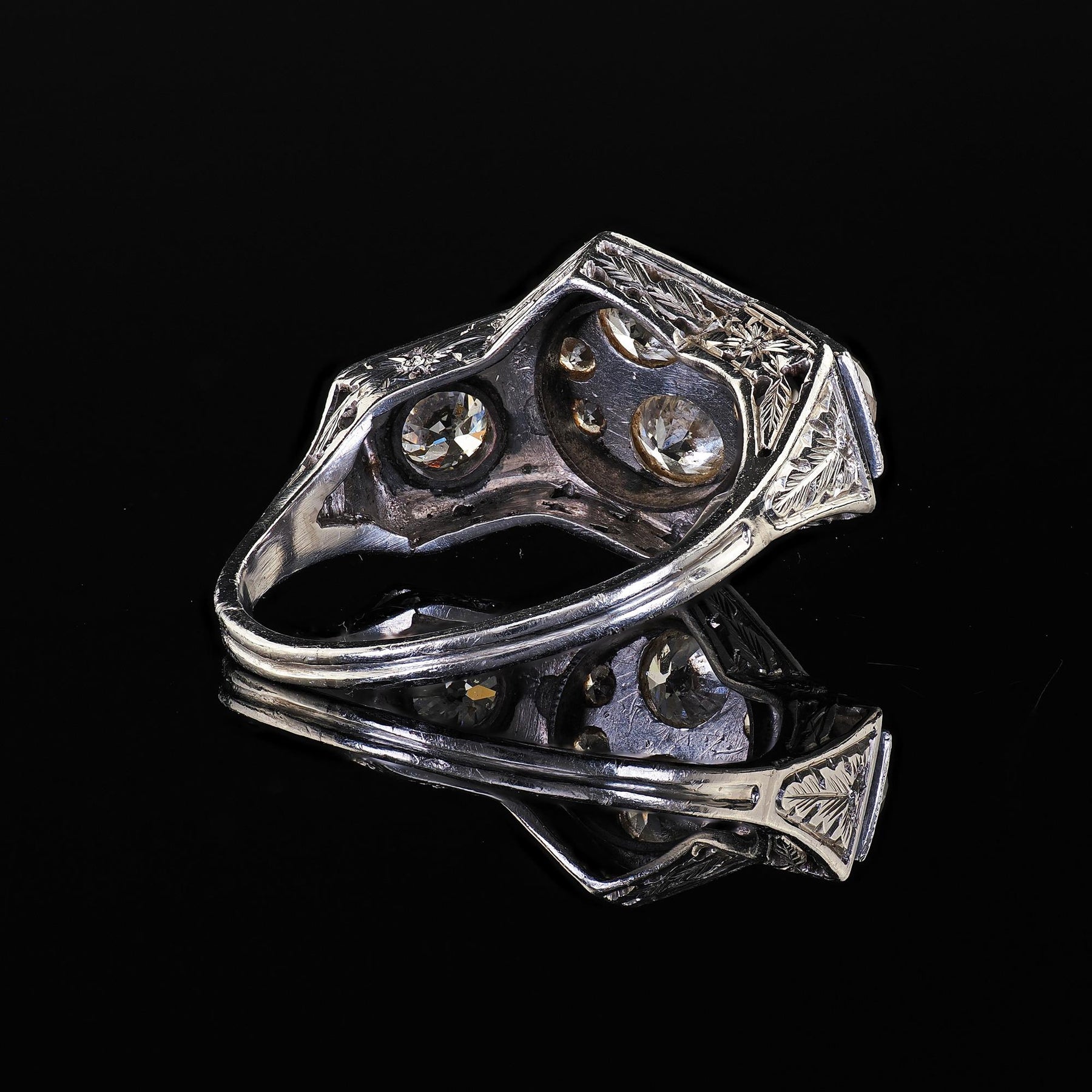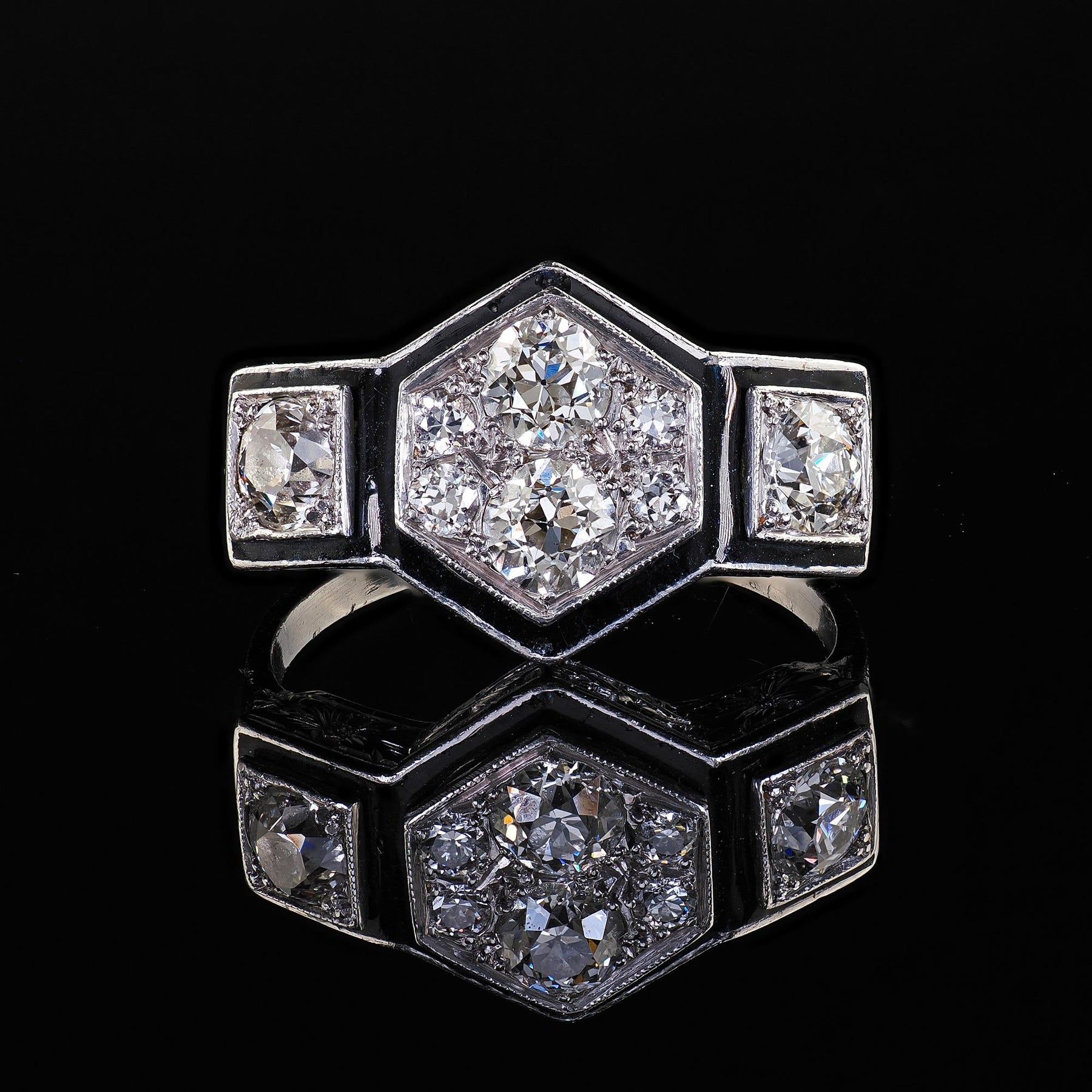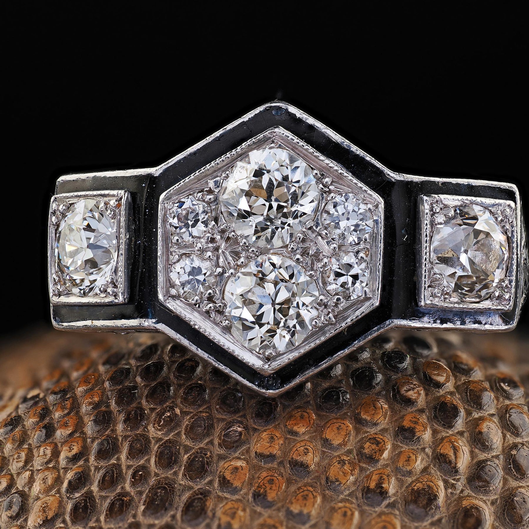 Beautiful Antique Art Deco Platinum Old Euro Diamond Enamel Three Stone Cluster Ring. This incredible antique art deco three stone diamond cluster ring is crafted in platinum. This beautiful ring features old European cut diamonds set in a breathtaking Art Deco mounting that has black enamel in between each section. The ring has beautiful filigree on the gallery and sits low on the finger.