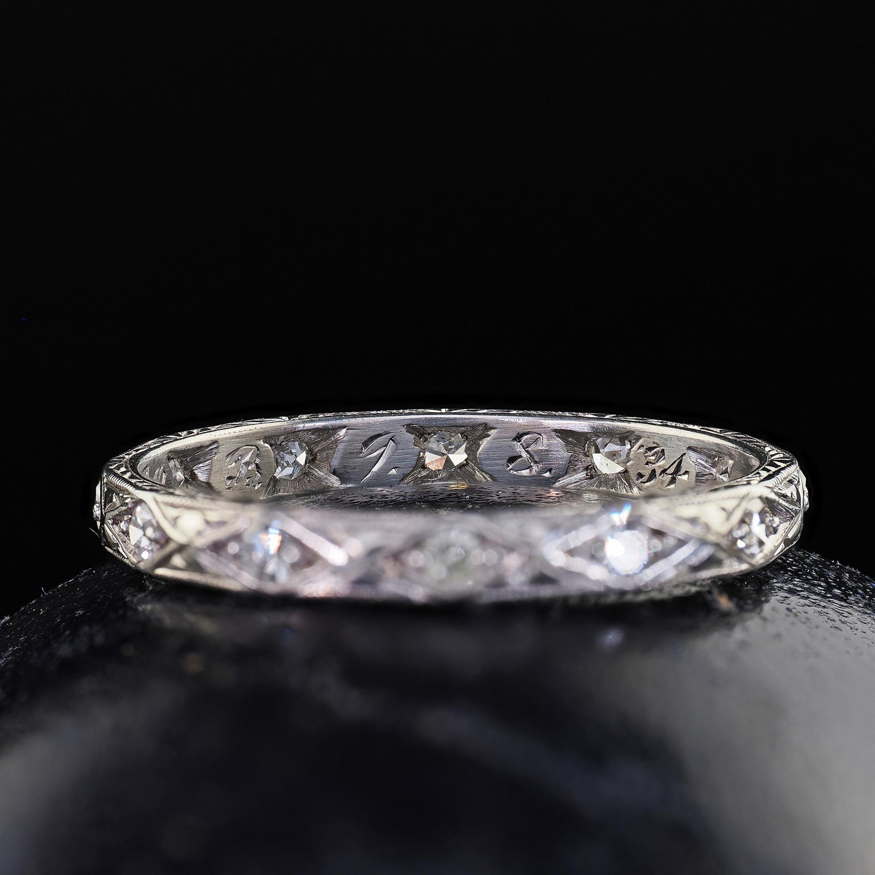 Beautiful Antique Art Deco Platinum Single Cut Diamond Engraved Eternity Band - Size 6. This beautiful Art Deco single cut diamond engraved eternity band is crafted in platinum. The ring has beautiful single cut diamonds set around the entire ring. They are set in a beautifully engraved Art Deco mounting. The inside of the band is engraved "A. R. T. to F. O. B. 9. 8. 34.". The ring is in good condition and sits low on the finger.