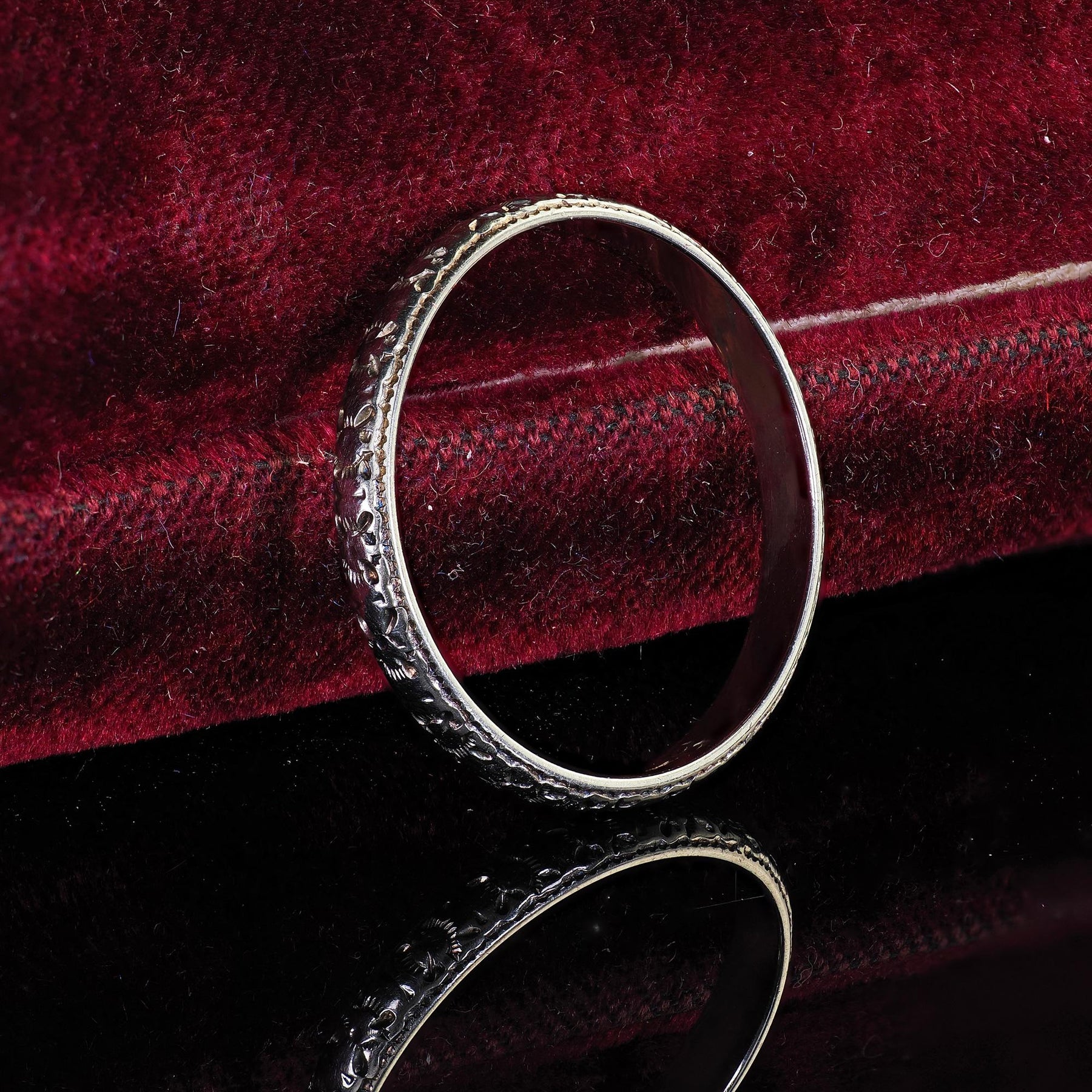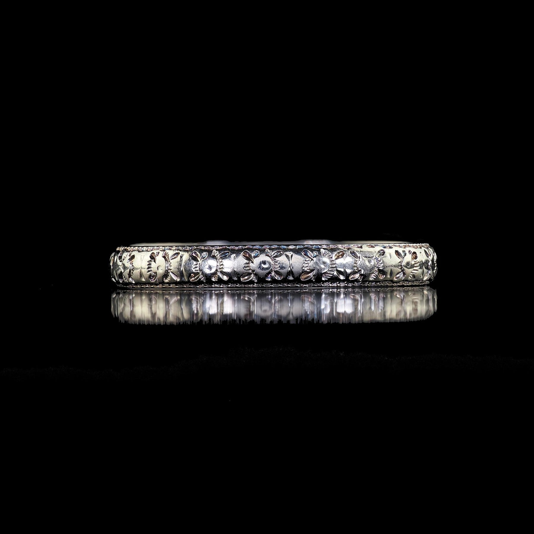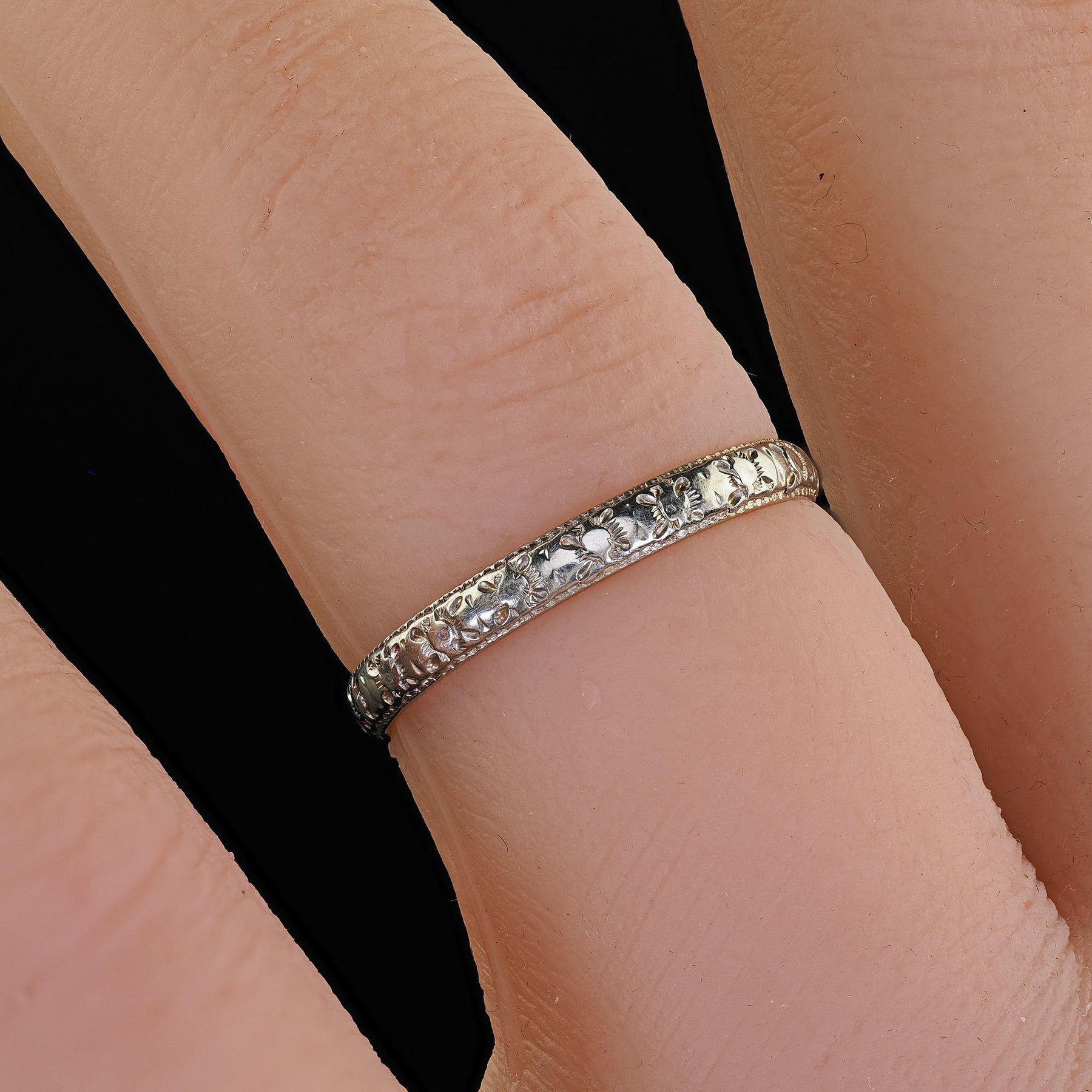 Antique Art Deco 18K White Gold Engraved Blossom Wedding Band Ring - Size 6 1/4