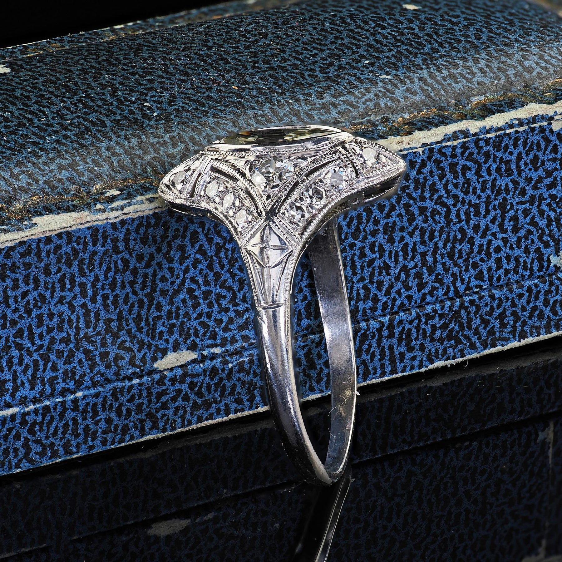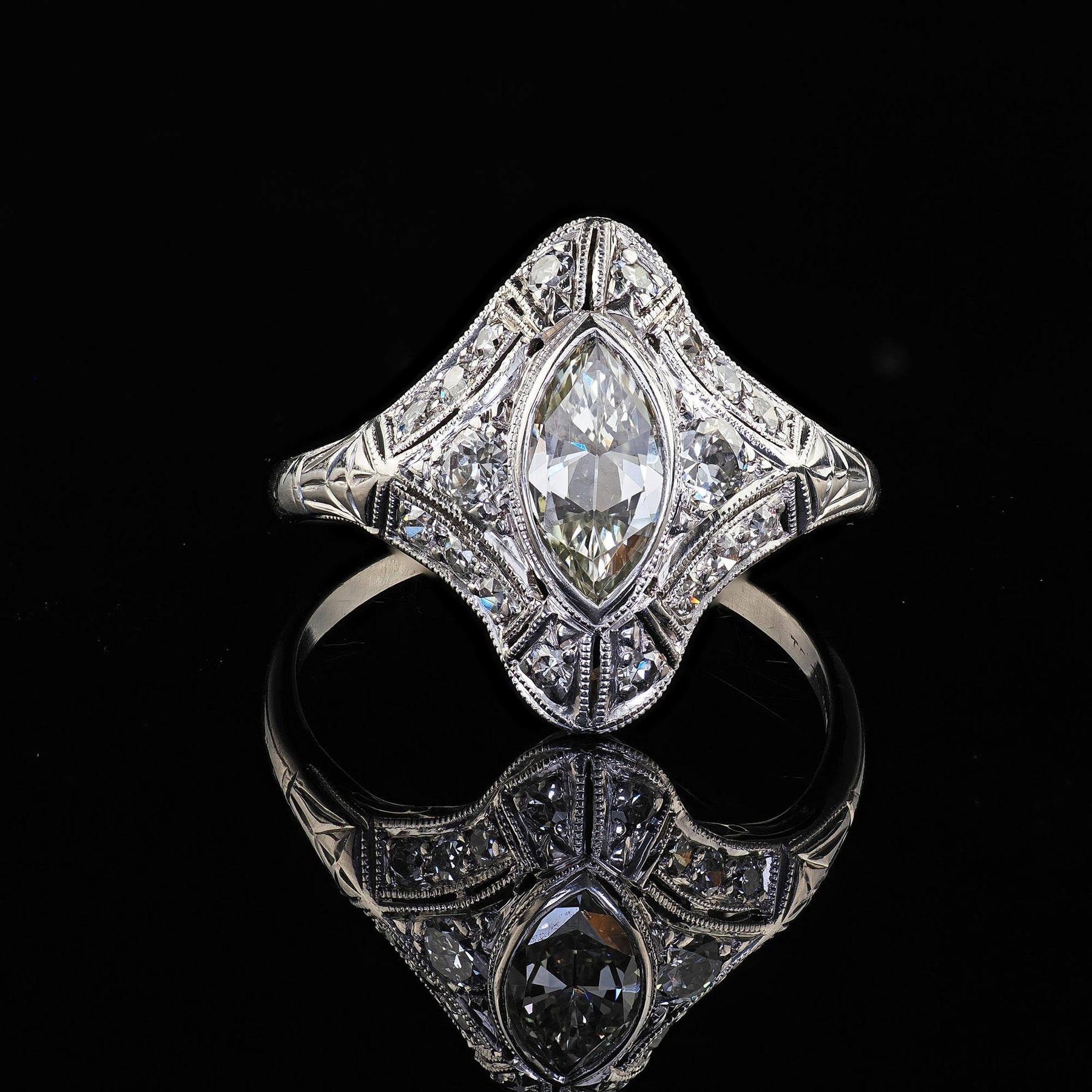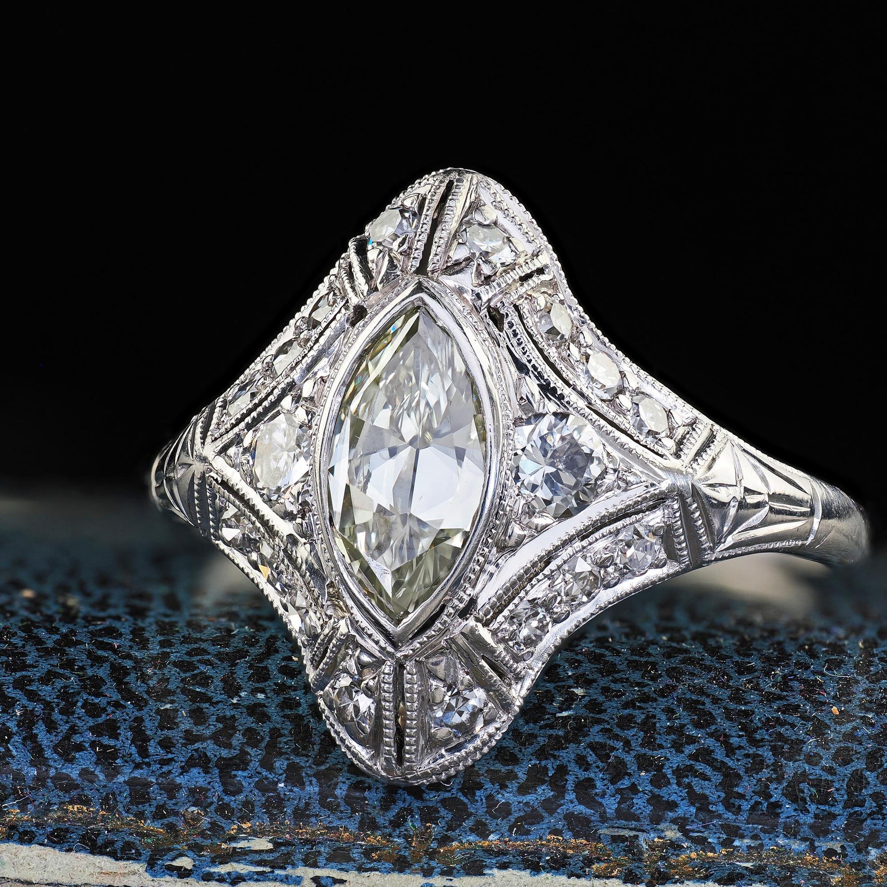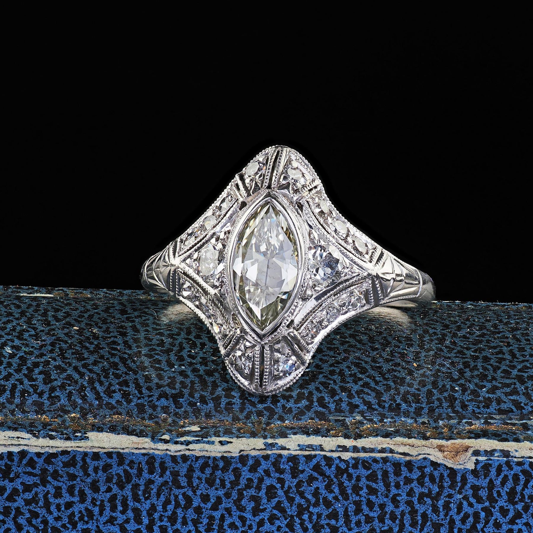 Beautiful Antique Art Deco Moskowitz Bros. Platinum Old Cut Marquise Diamond Ring - GIA. This gorgeous Moskowitz Bros. antique Art Deco shield ring is crafted in platinum. The ring features an old cut marquise diamond set in the center that has a GIA report. The ring has gorgeous engraving and old European cut diamonds set throughout the ring. The ring sits low on the finger and is in good condition.