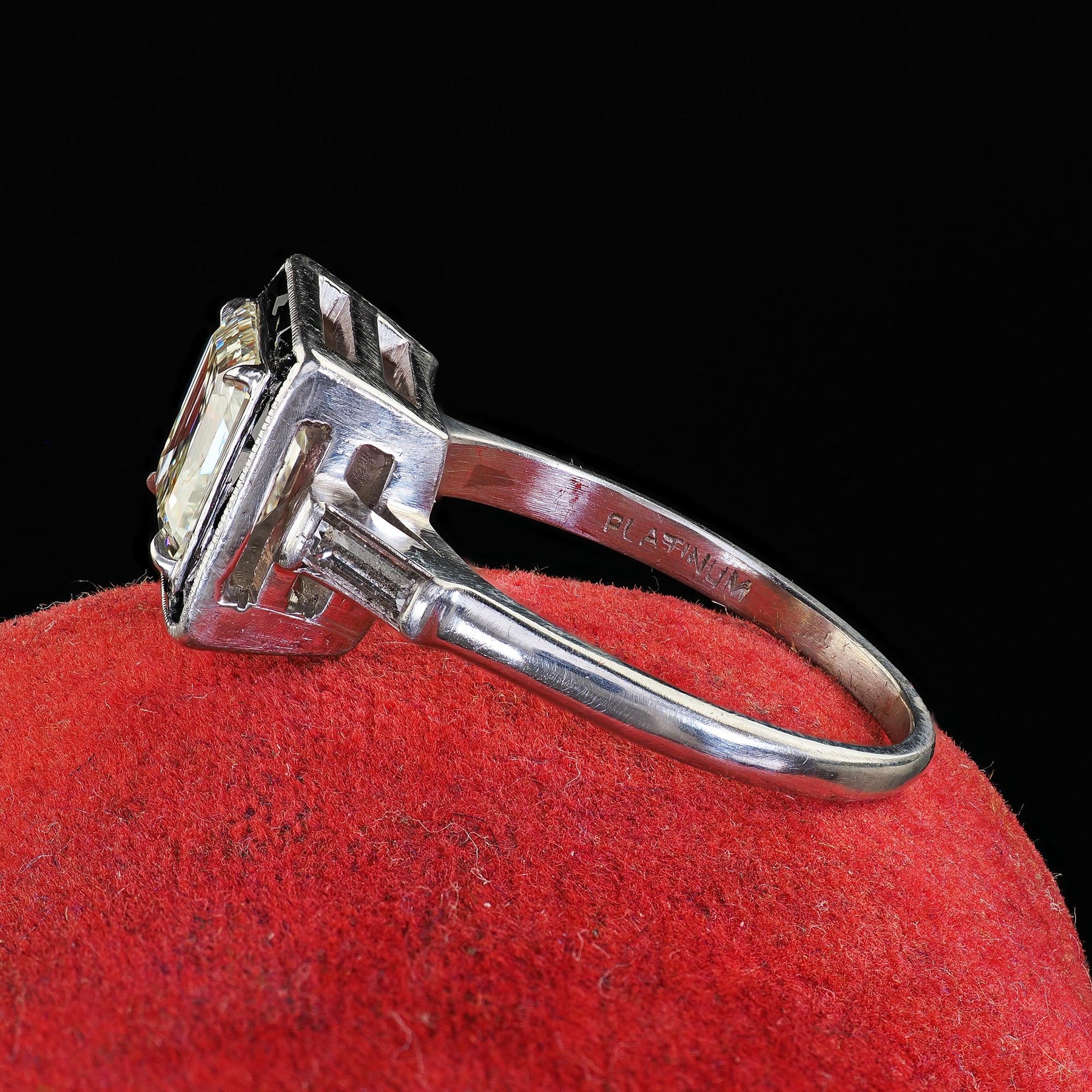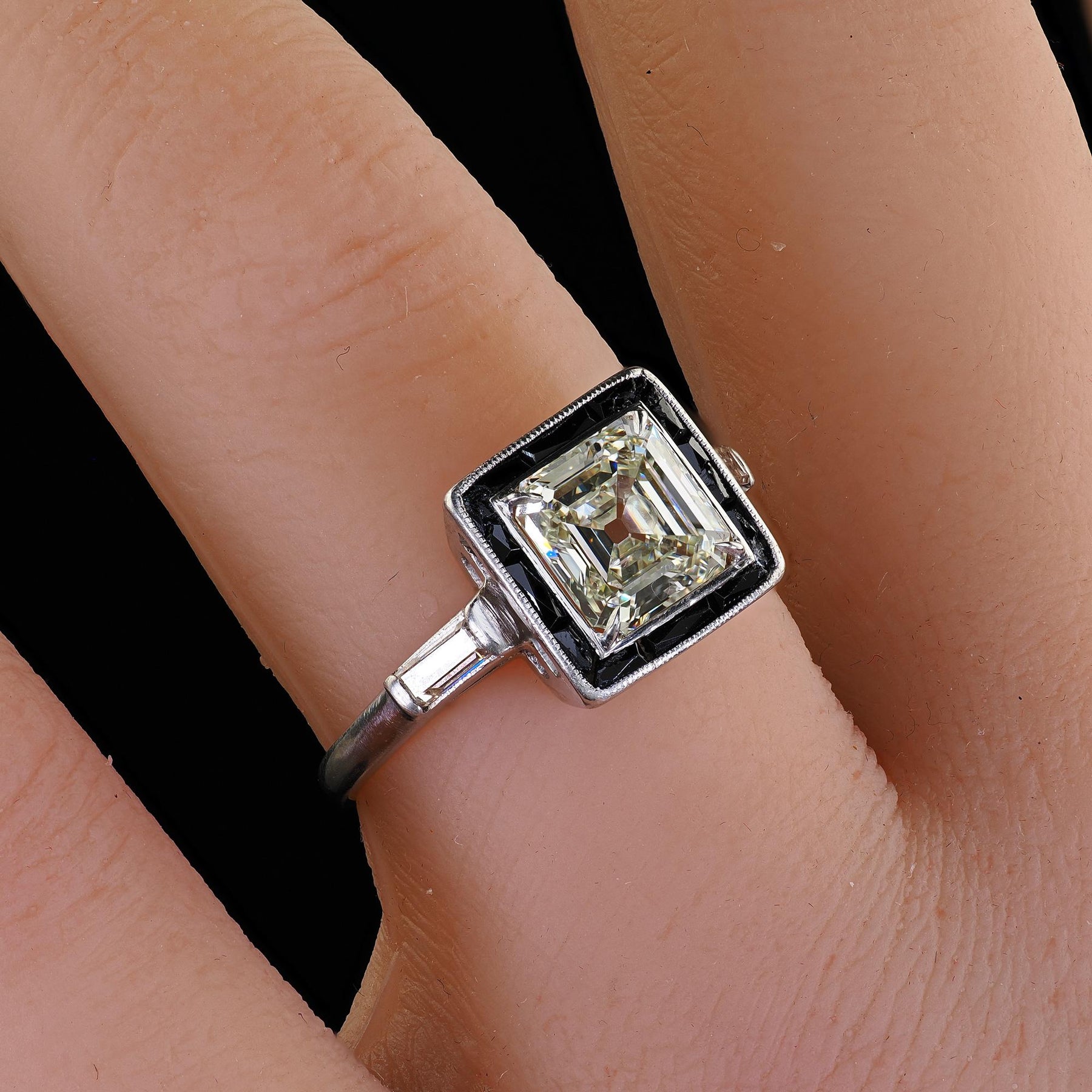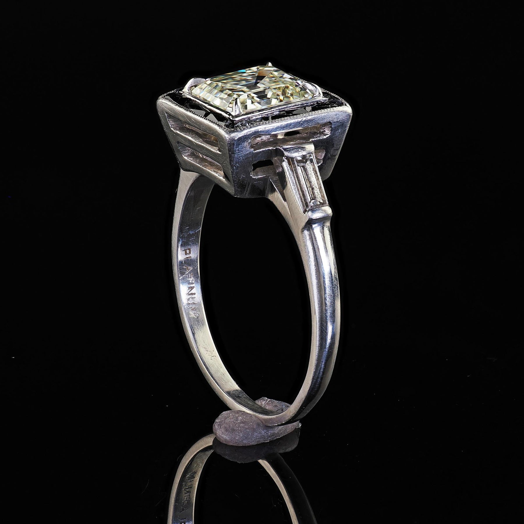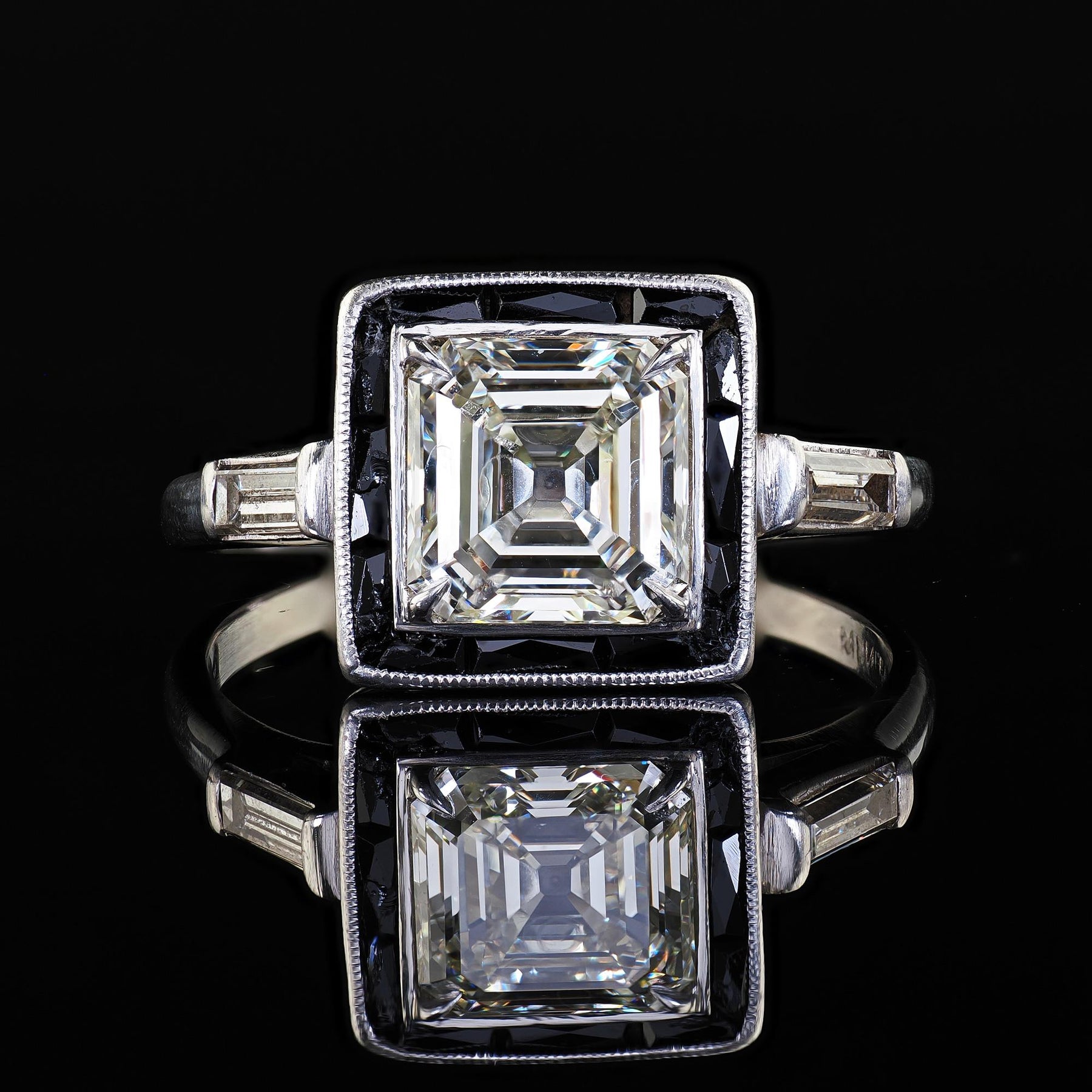 Beautiful Antique Art Deco Platinum Asscher Cut Diamond Onyx Halo Engagement Ring - GIA. This incredible Art Deco emerald cut diamond and onyx engagement ring is crafted in platinum. This amazing ring features an Asscher cut diamond in the center that has a GIA report. The diamond is set in a beautiful Art Deco mounting that has French cut onyx set around the stone as a halo. The shank has a baguette diamond on each side and is in great condition. The onyx halo has abrasions and small cracks on a few stones but does not affect the integrity of the ring.