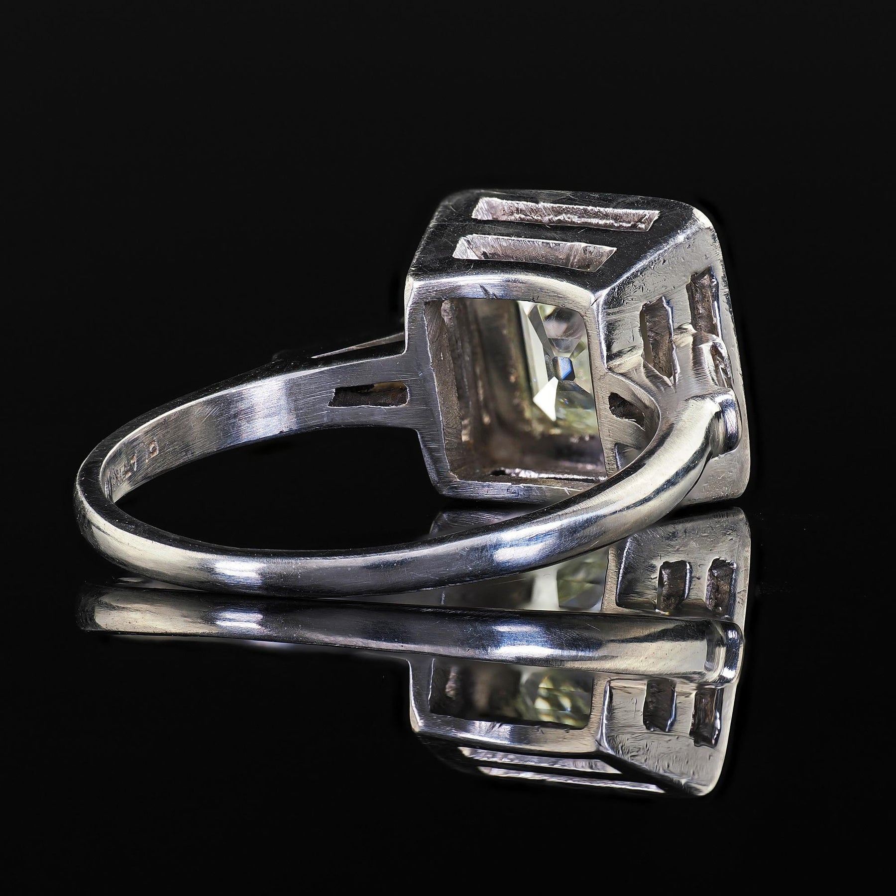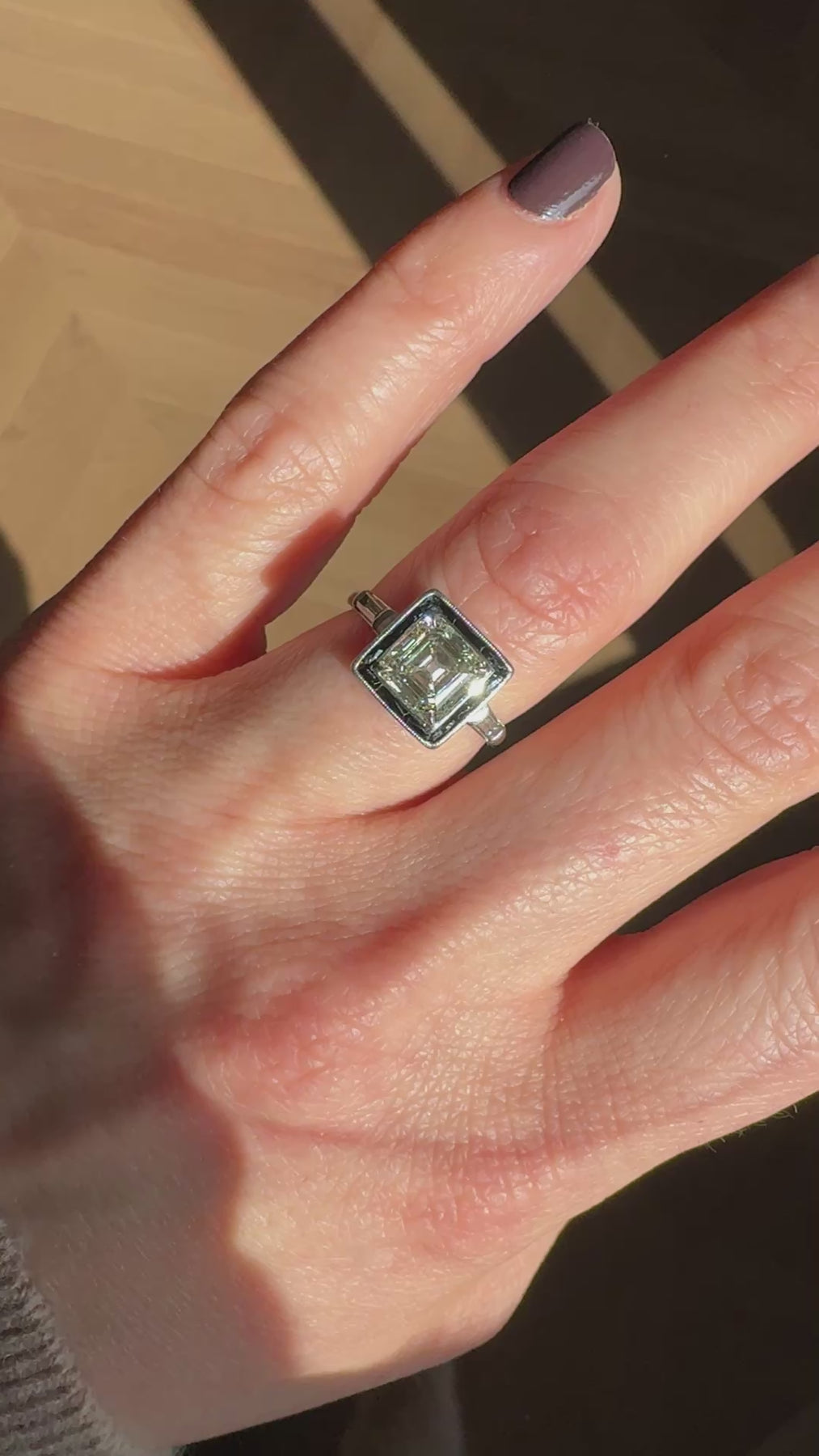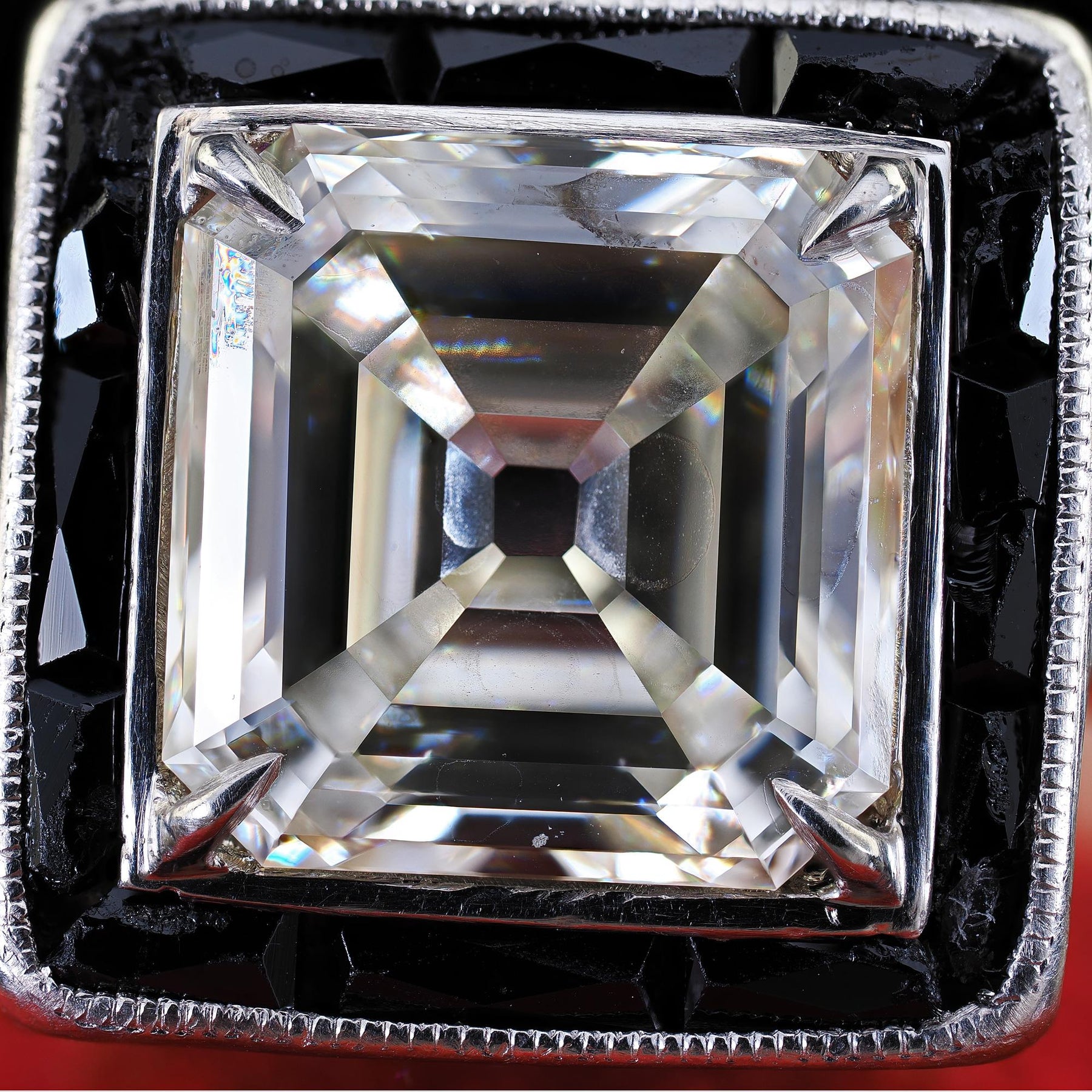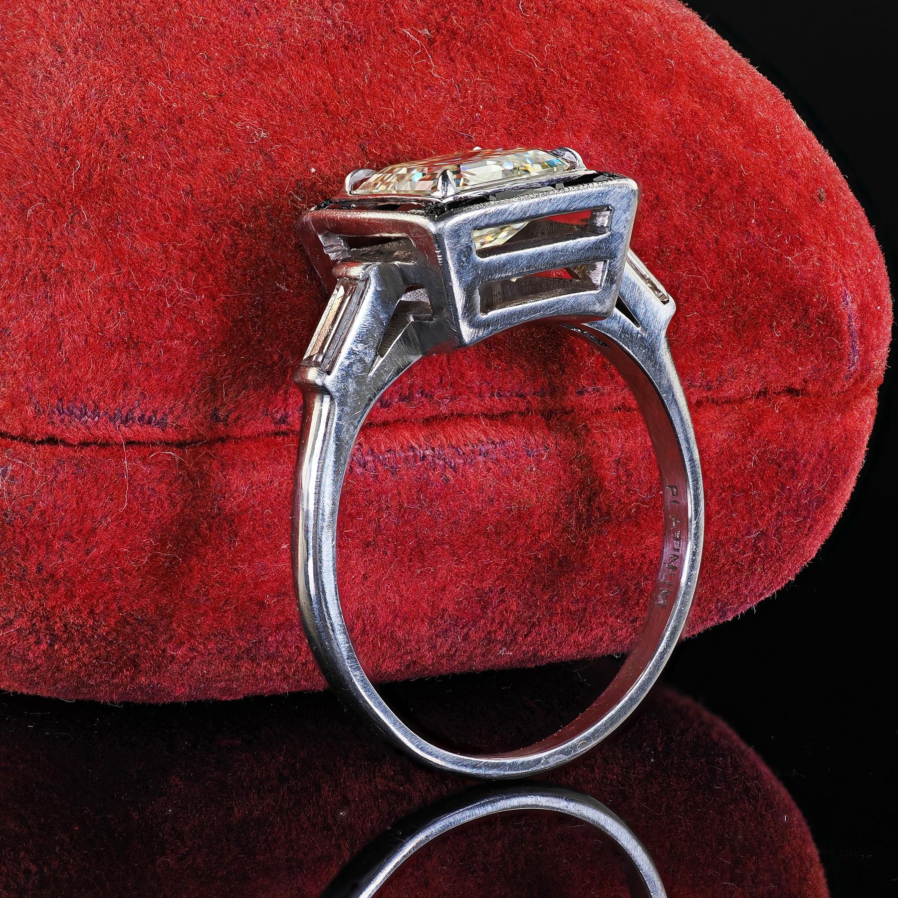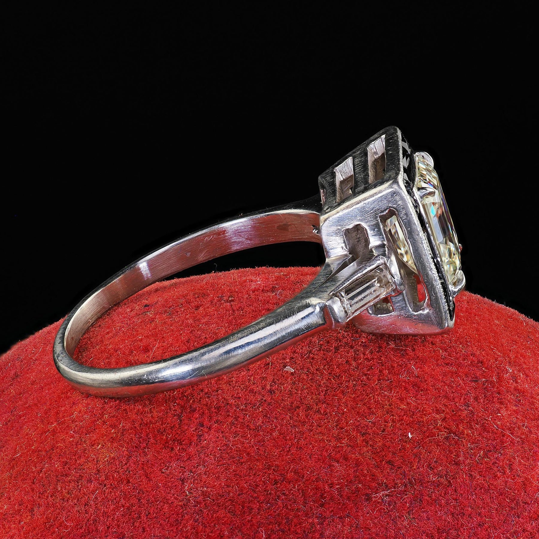 Beautiful Antique Art Deco Platinum Asscher Cut Diamond Onyx Halo Engagement Ring - GIA. This incredible Art Deco emerald cut diamond and onyx engagement ring is crafted in platinum. This amazing ring features an Asscher cut diamond in the center that has a GIA report. The diamond is set in a beautiful Art Deco mounting that has French cut onyx set around the stone as a halo. The shank has a baguette diamond on each side and is in great condition. The onyx halo has abrasions and small cracks on a few stones but does not affect the integrity of the ring.