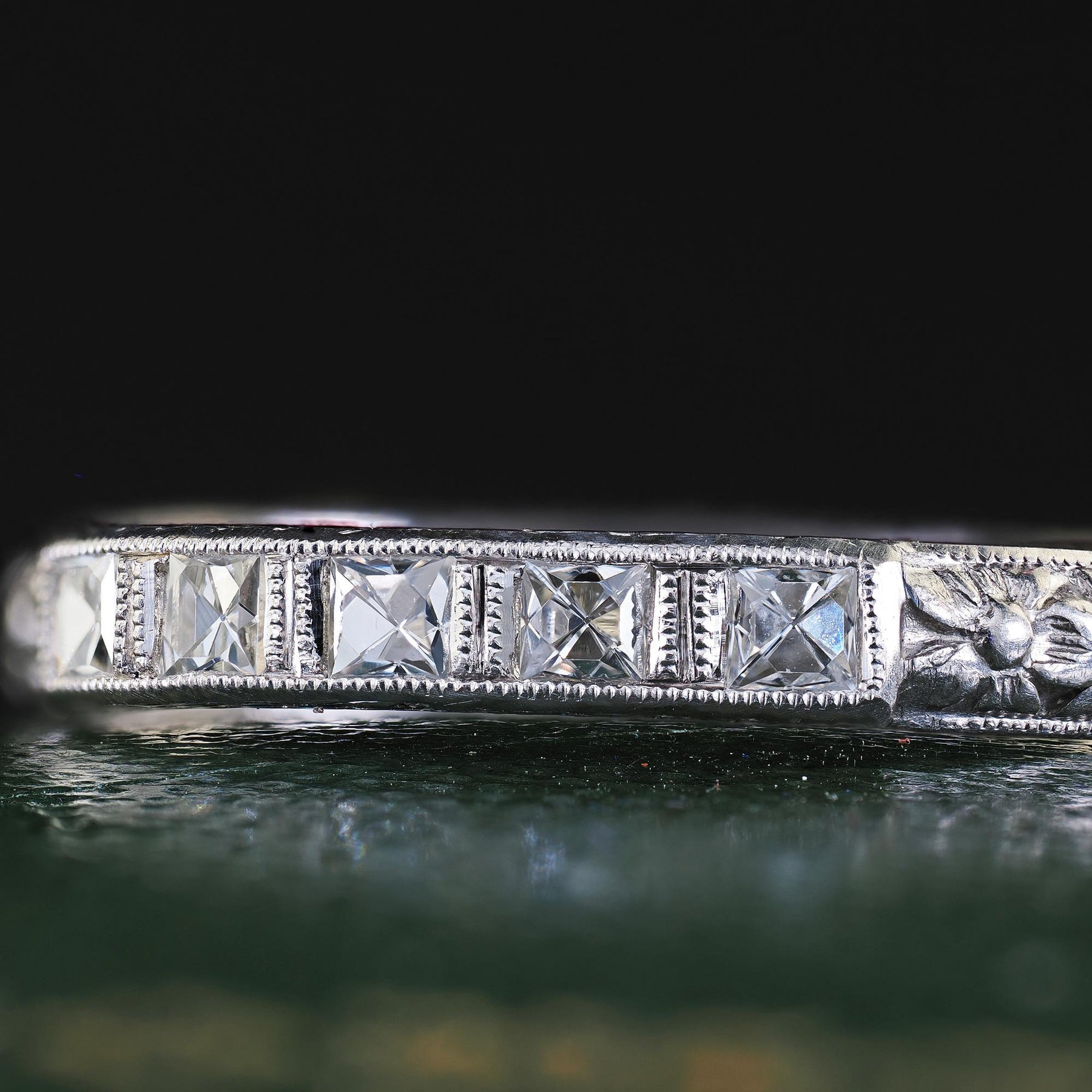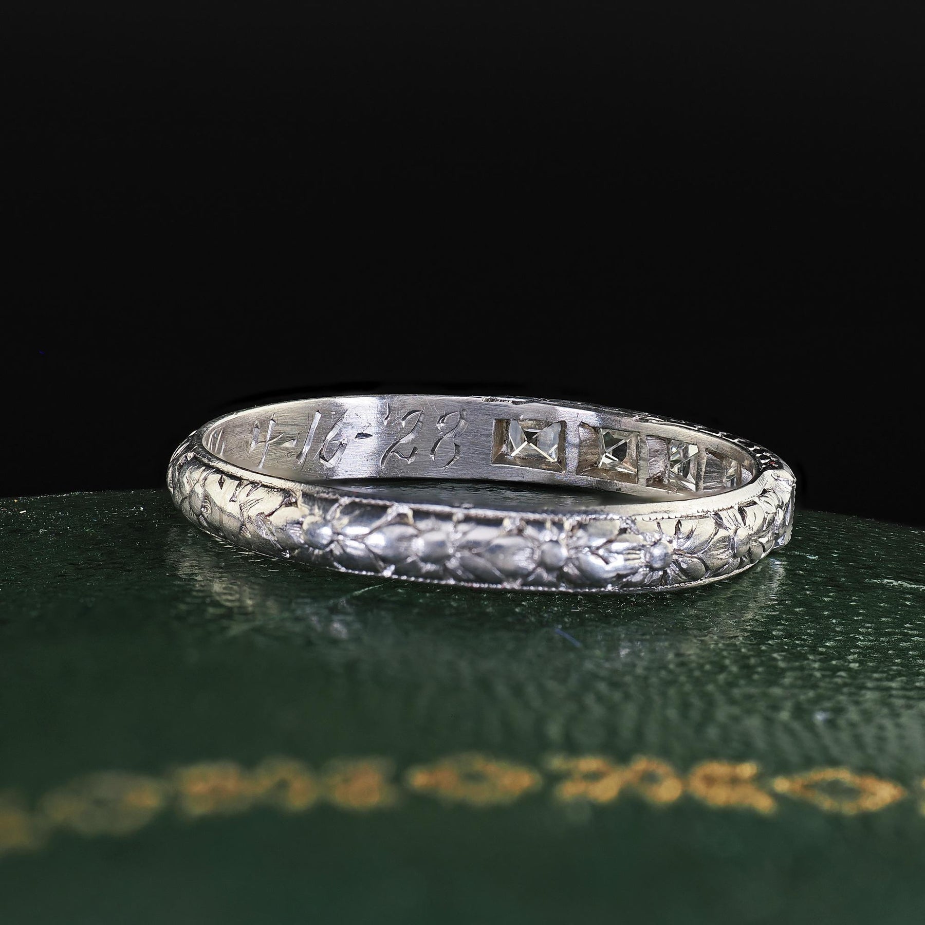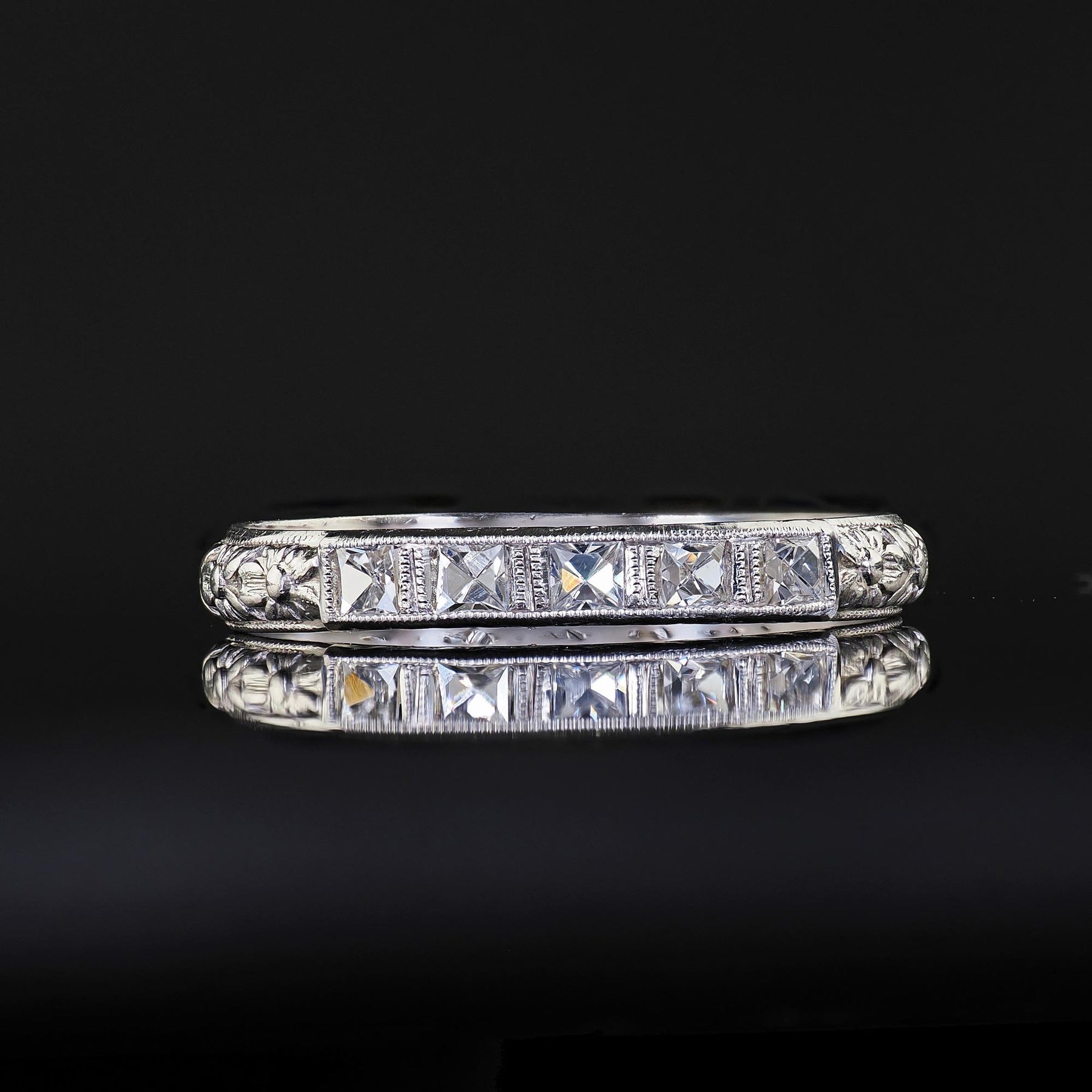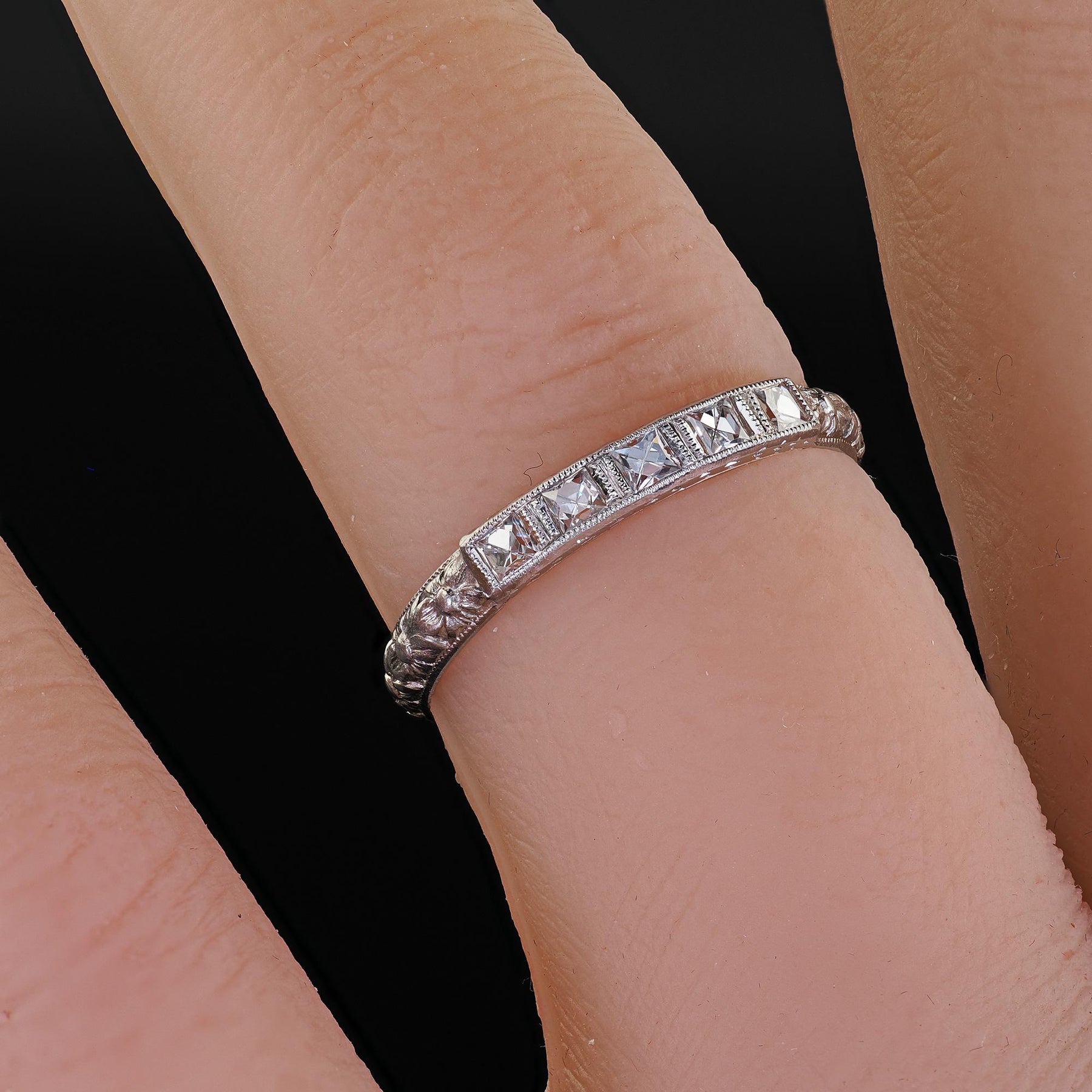 Antique Art Deco Platinum French Cut Diamond Engraved Wedding Band