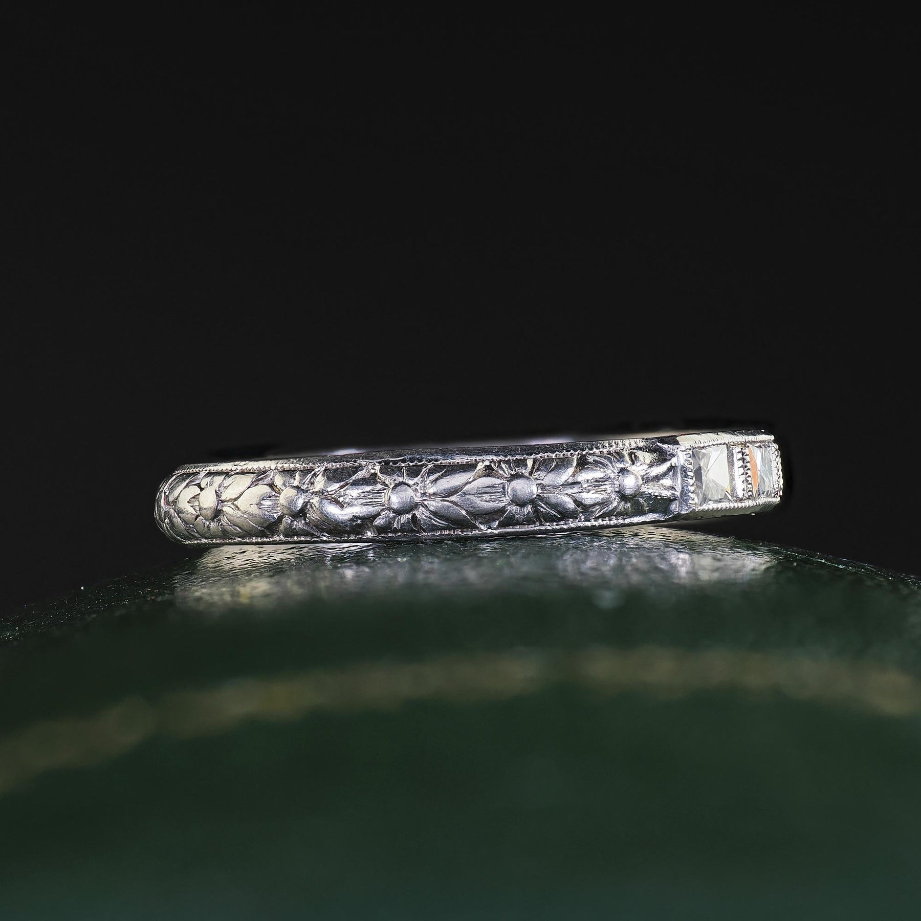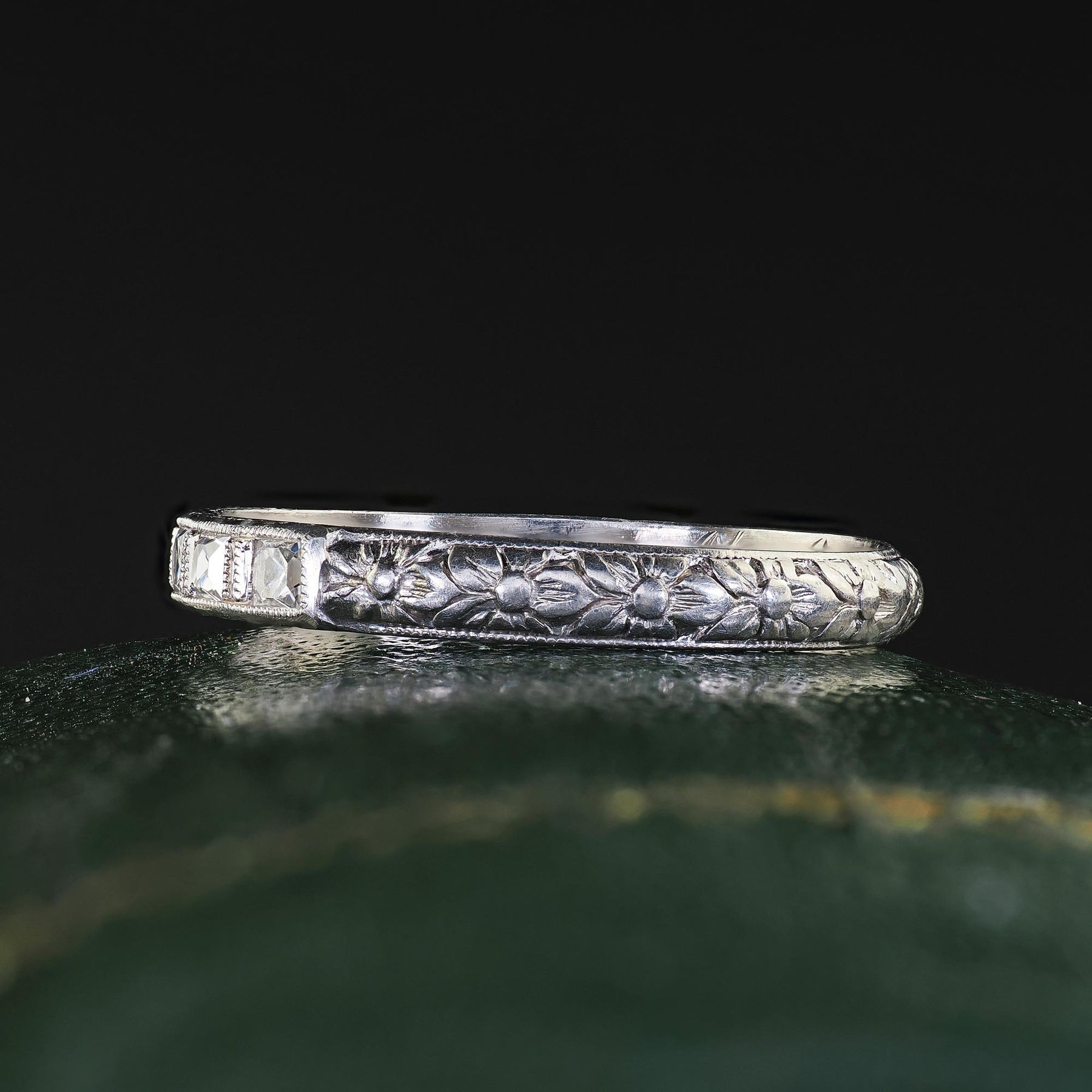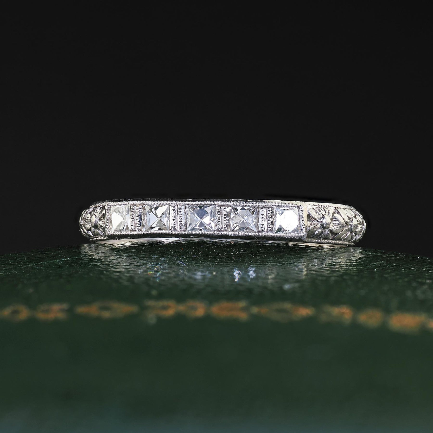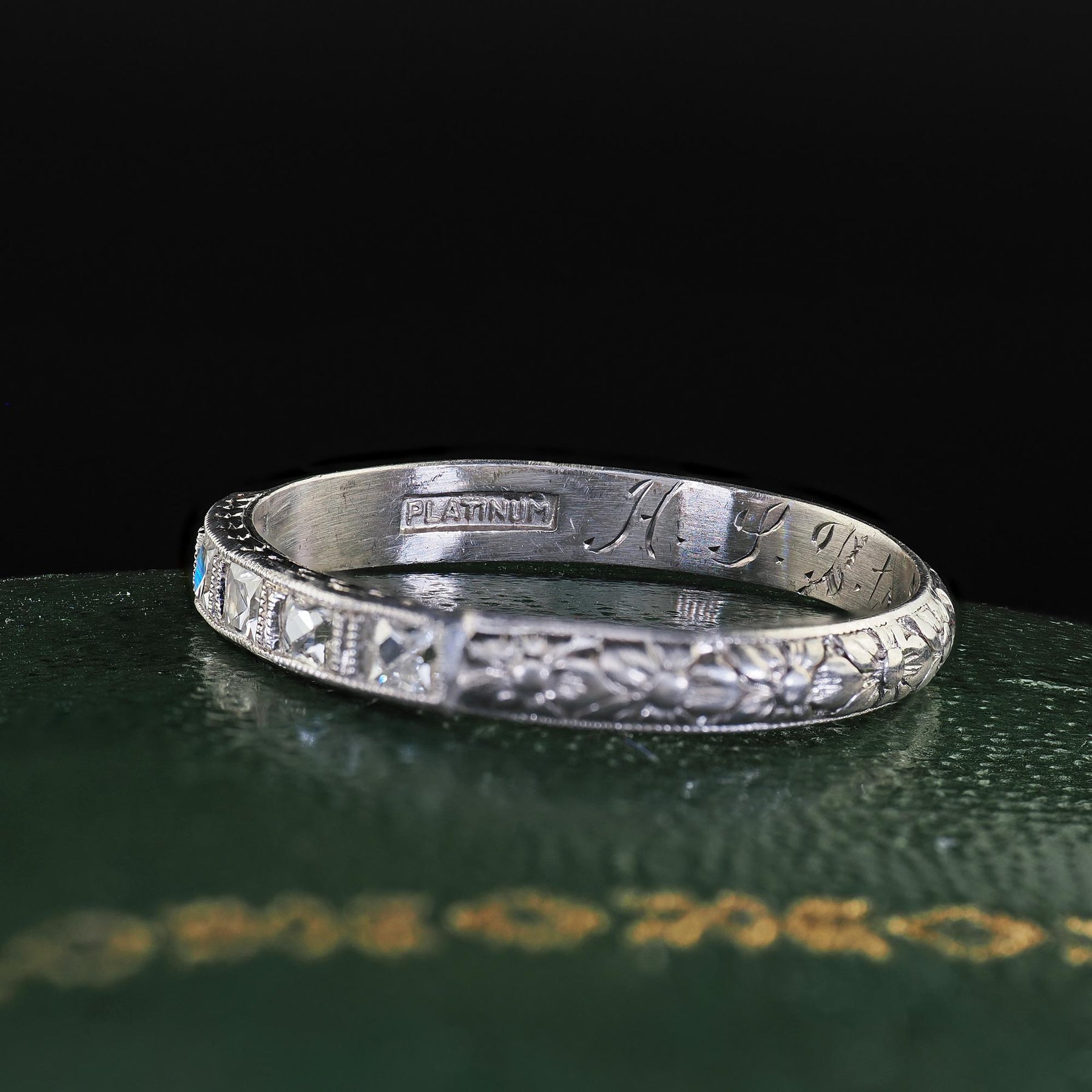 Antique Art Deco Platinum French Cut Diamond Engraved Wedding Band