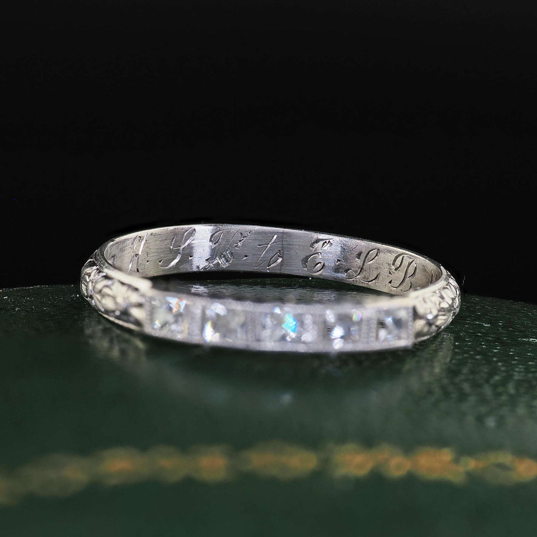 Beautiful Antique Art Deco Platinum French Cut Diamond Engraved Wedding Band. This gorgeous Art Deco French cut diamond wedding band is crafted in platinum. The ring features gorgeous French cut diamonds set on top of a beautiful engraved band. The inside of the band is engraved "H. S. T. to E. L. B. 4-16-28". The ring is in great condition and sits low on the finger.