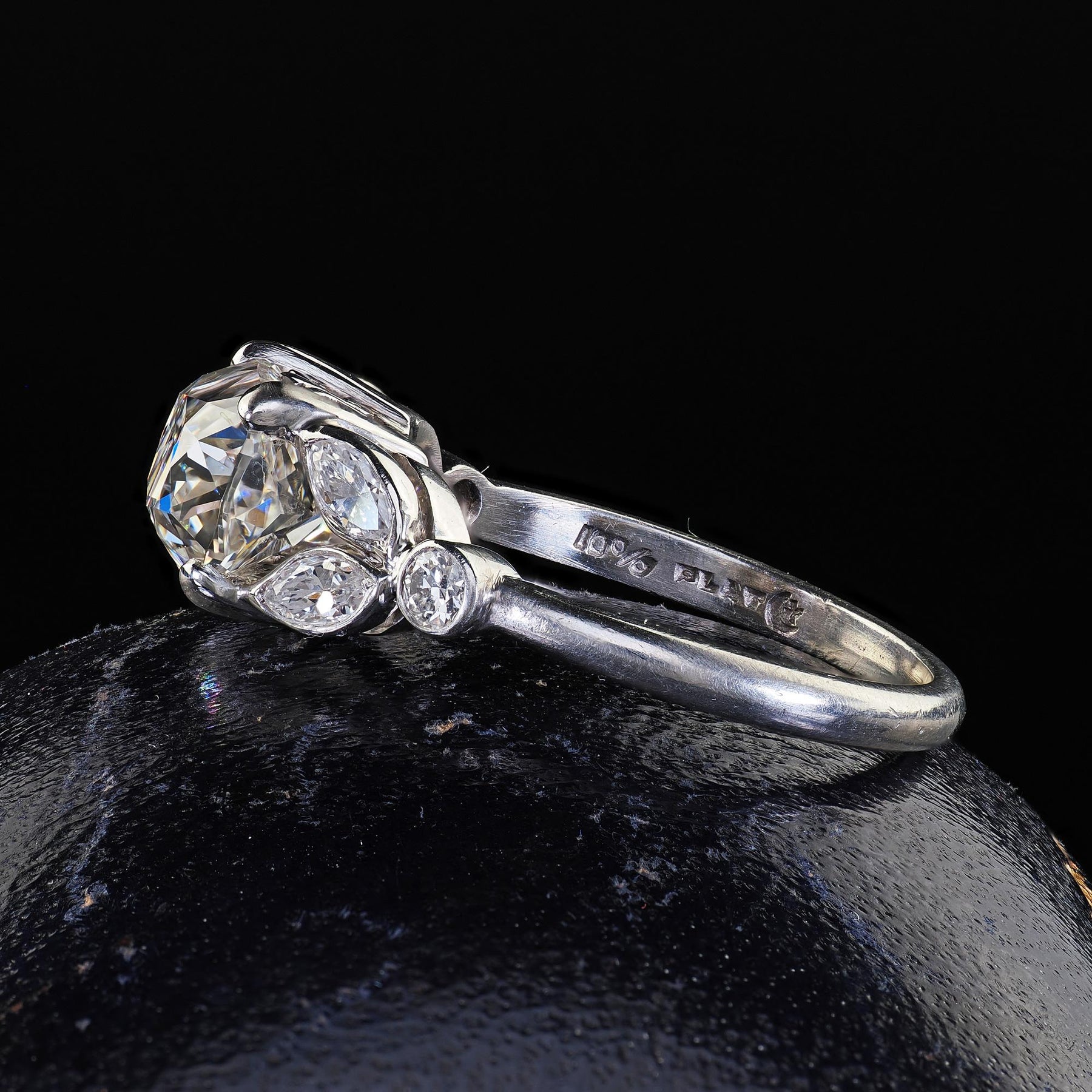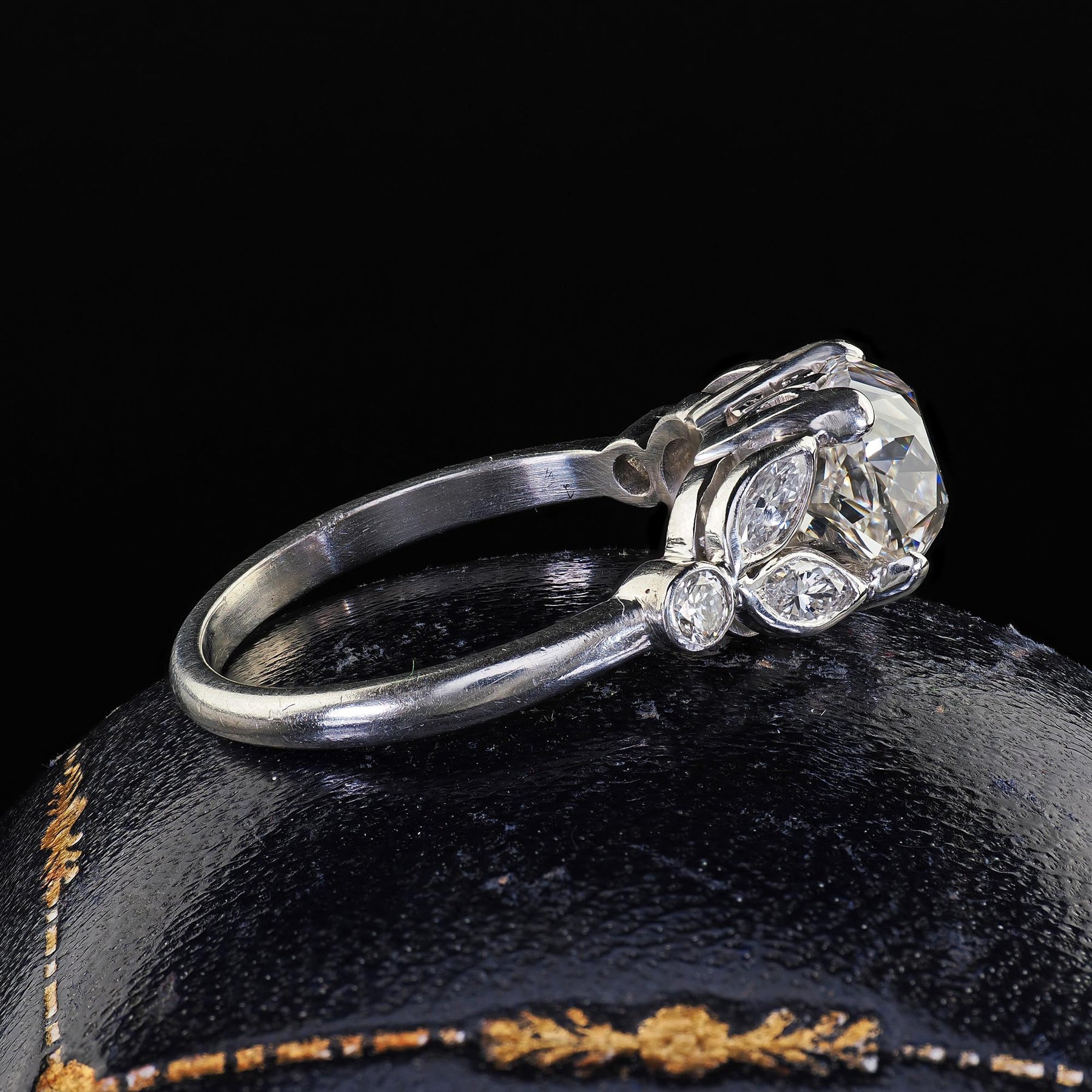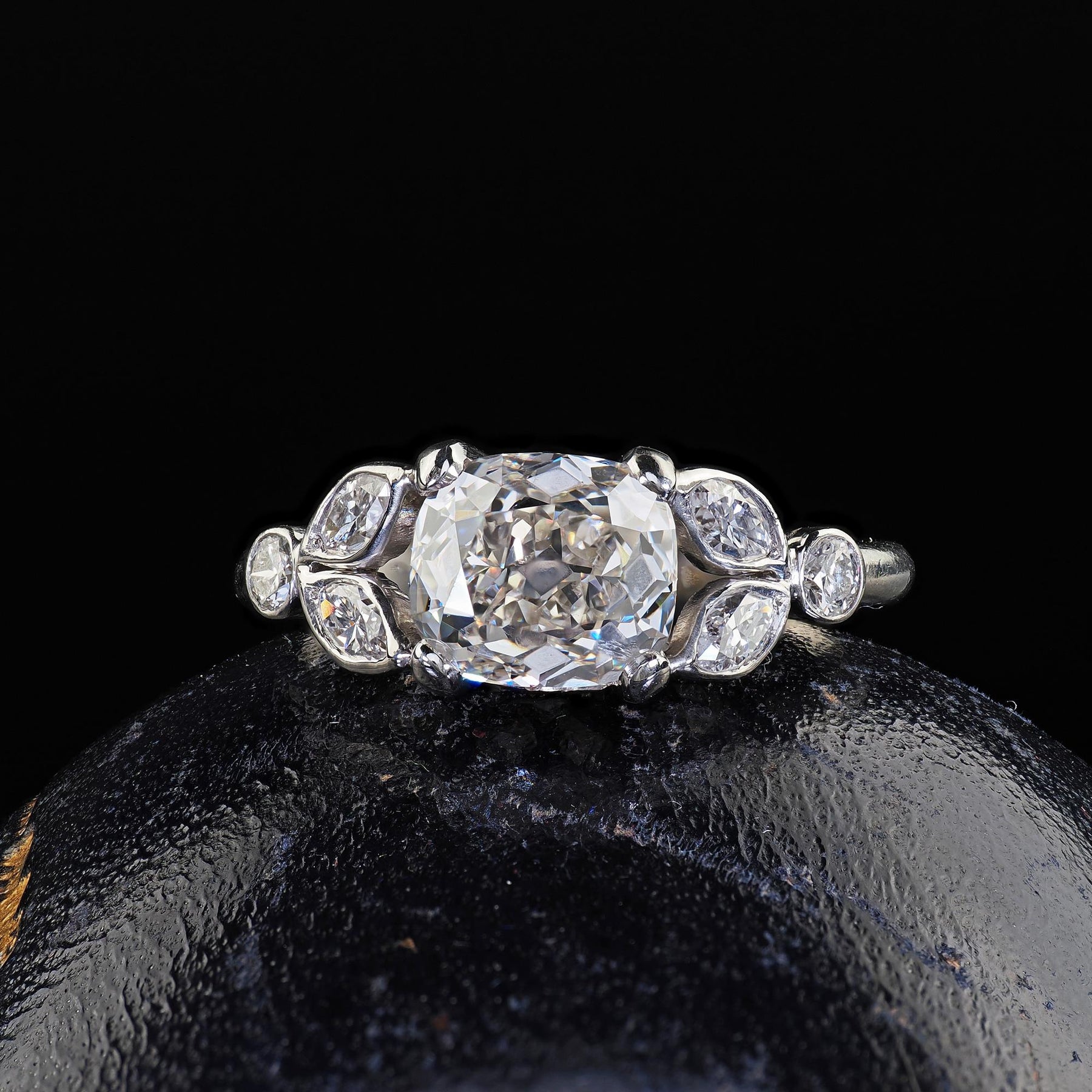 Beautiful Antique Art Deco Platinum Old Mine Cut Diamond Marquise Engagement Ring - GIA. This gorgeous antique old mine diamond and marquise engagement ring is crafted in platinum. This beautiful ring features an old mine cut diamond in the center that has a GIA report. This gorgeous diamond is set in a beautiful Art Deco mounting that has marquise set on the sides. The ring is in great condition and is gorgeous when worn.