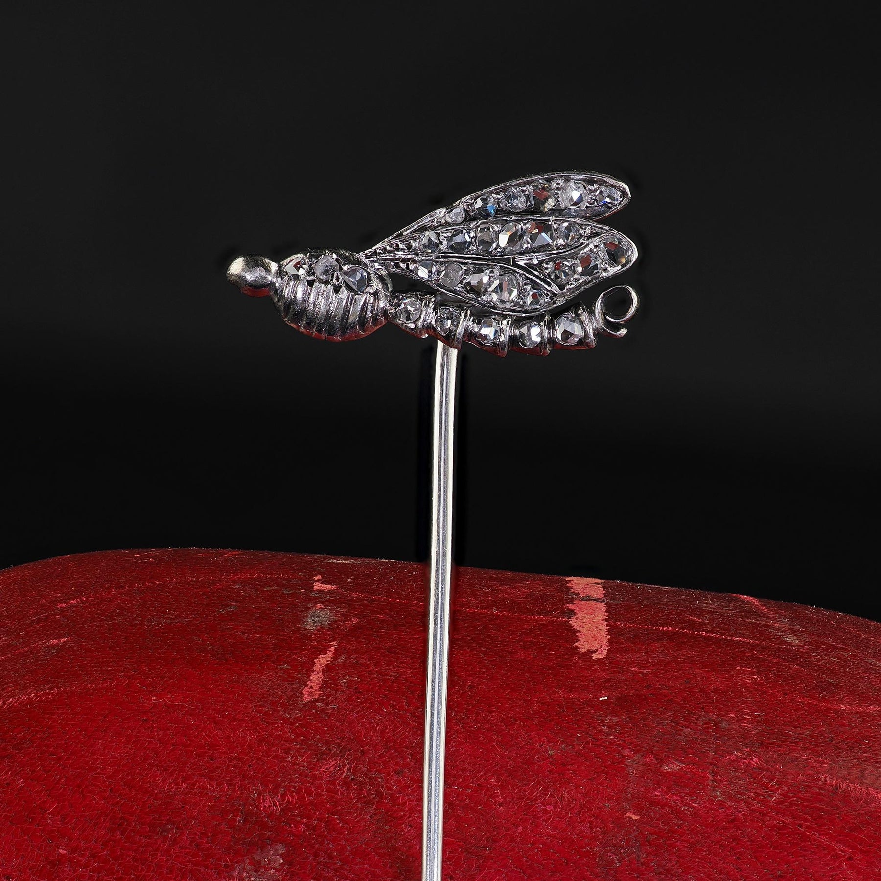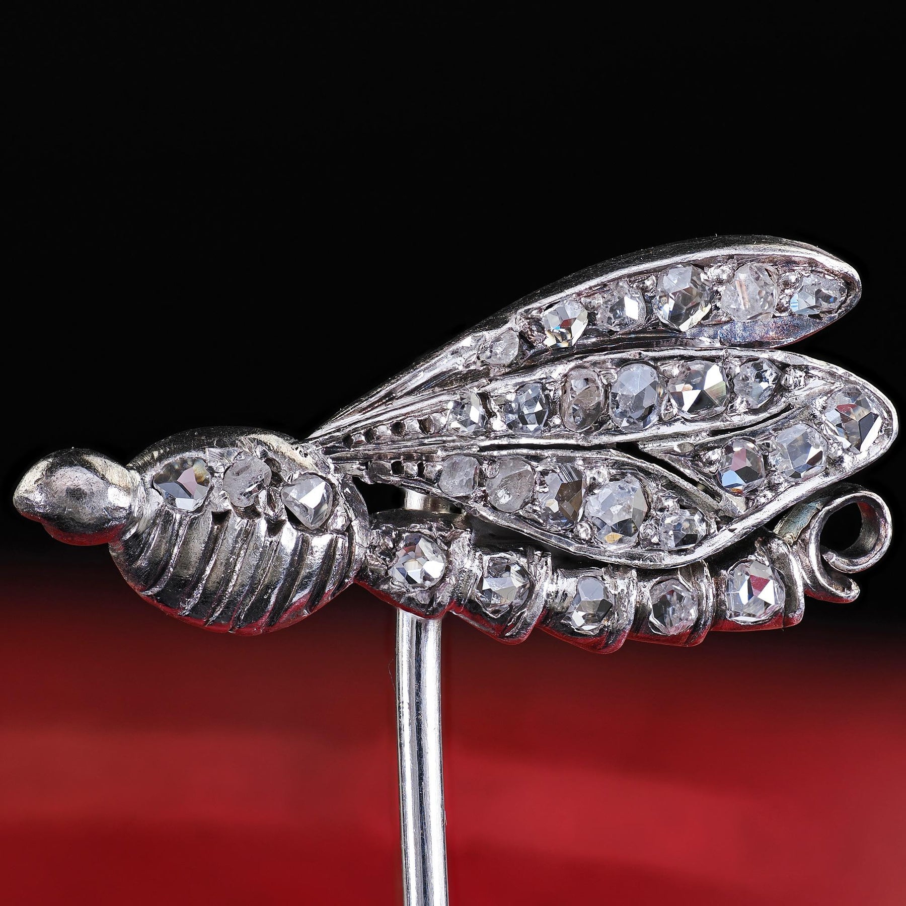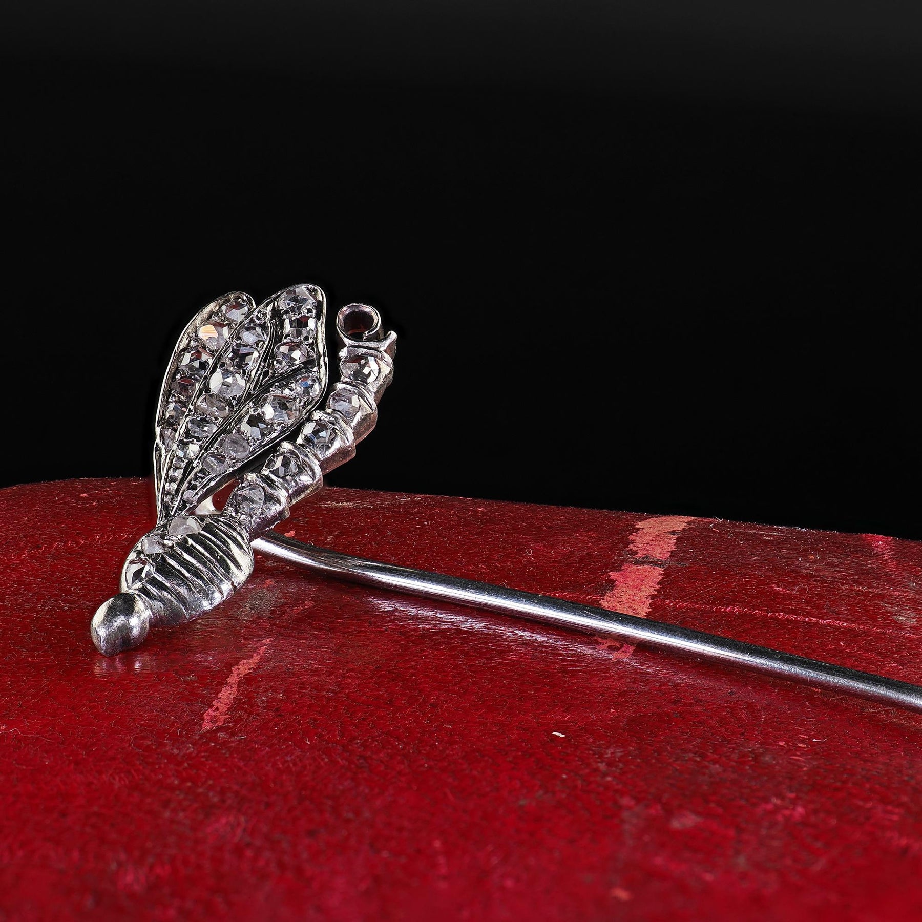 Antique Edwardian 18K White Gold Platinum Rose Cut Diamond Dragon Fly Stick Pin