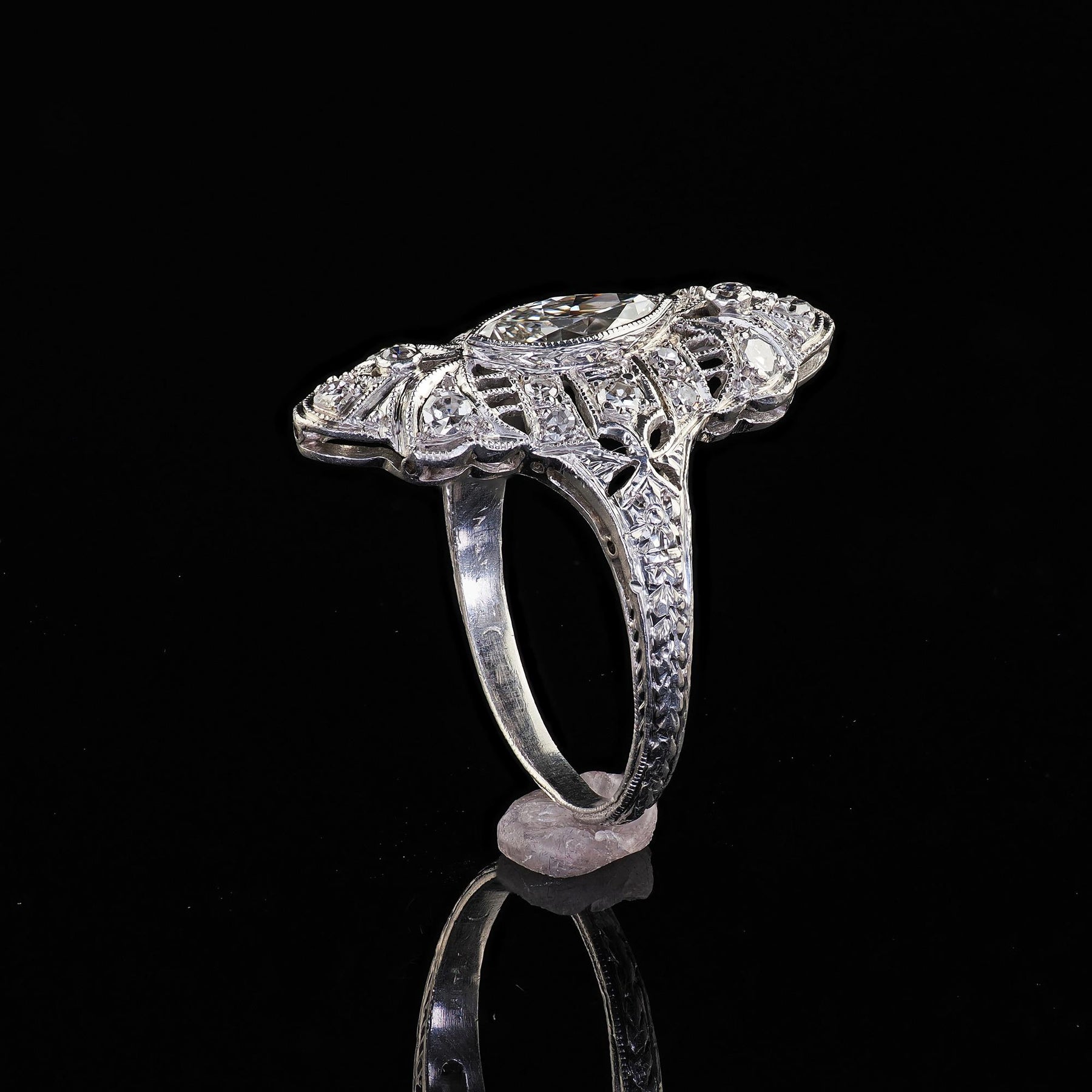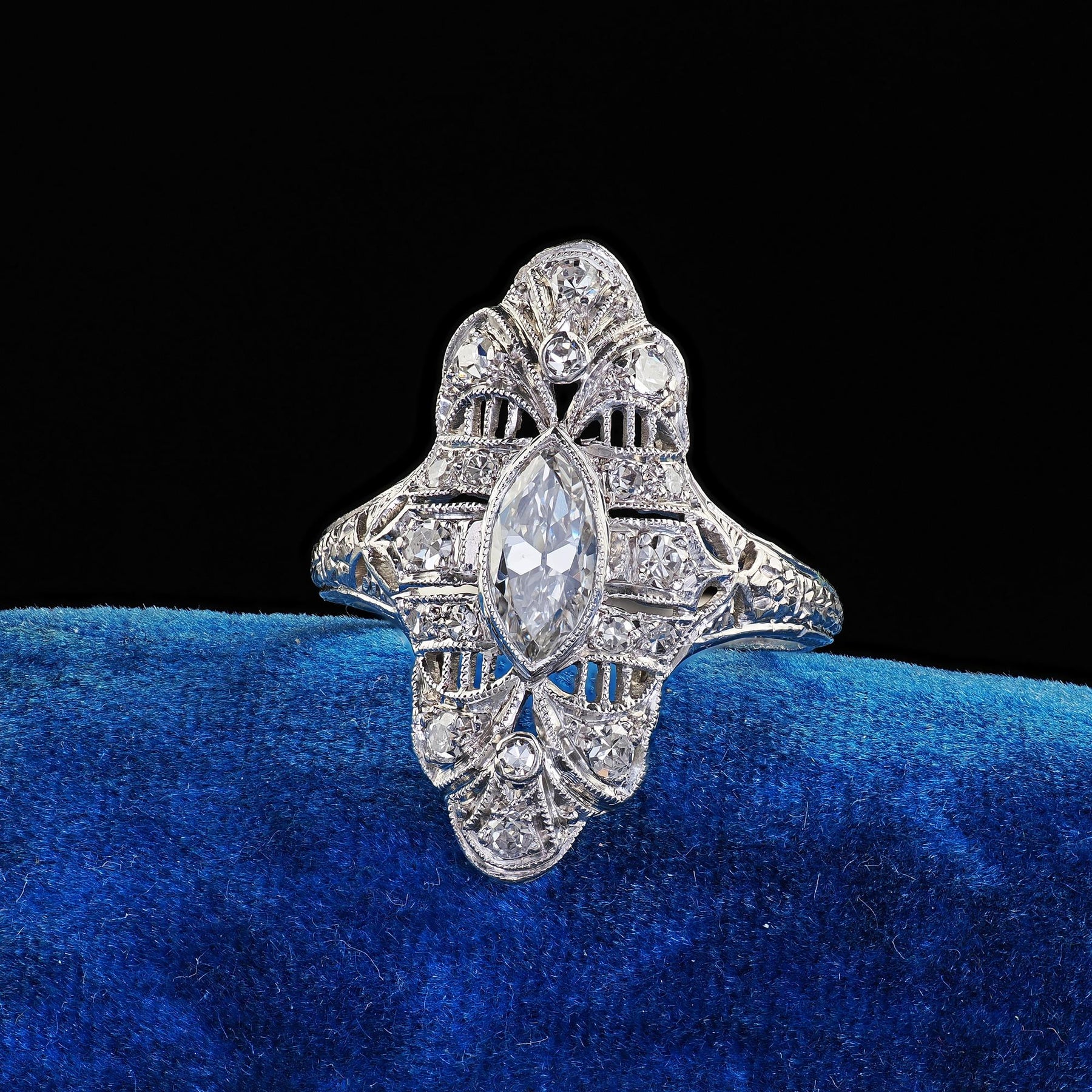 Beautiful Antique Edwardian Platinum Old Cut Diamond Filigree Shield Cocktail Ring - GIA. This incredible Edwardian old cut diamond marquise filigree shield ring is crafted in platinum. The ring features a bright marquise diamond in the center that has a GIA report. The ring features filigree on the ring with a gorgeous floral design. The ring is in great condition and sits low on the finger.