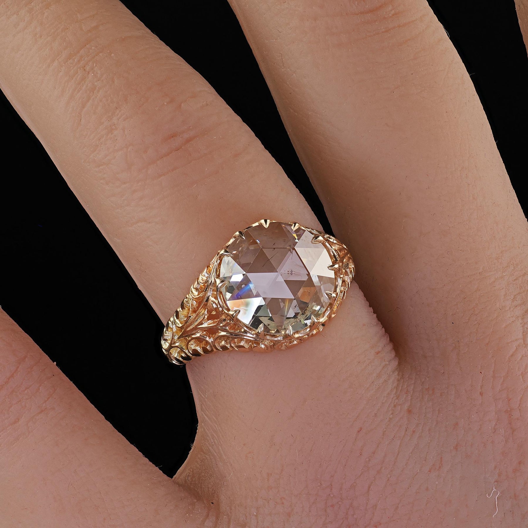 Beautiful Antique Victorian 14K Gold Rose Cut Diamond Filigree Engagement Ring - GIA. This incredible Victorian rose cut diamond filigree engagement ring is crafted in 14k yellow gold. This amazing ring features a large domed rose cut diamond that has a GIA report. The diamond is set in a gorgeous filigree Victorian mounting that has a branch-like design that wraps around the stone. The ring sits low on the finger and is in great condition.