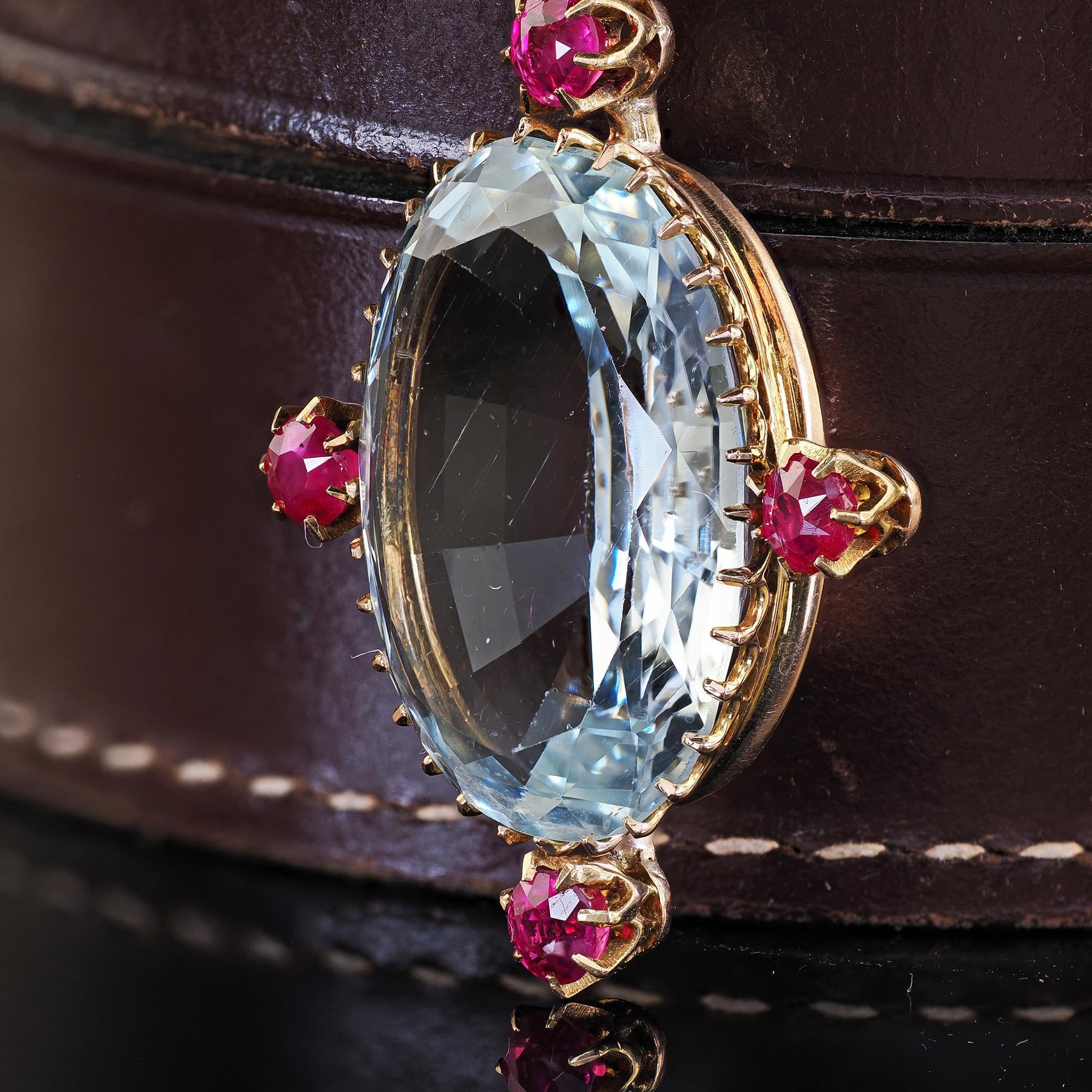 Beautiful Antique Victorian 14K Yellow Gold Aquamarine and Burma Ruby Drop Pendant. This incredible Victorian aquamarine and Burma ruby drop pendant is crafted in 14k yellow gold. This pendant features a large aquamarine in the center with four old cut Burmese rubies around it. The pendant is in great condition and sits beautifully when worn.