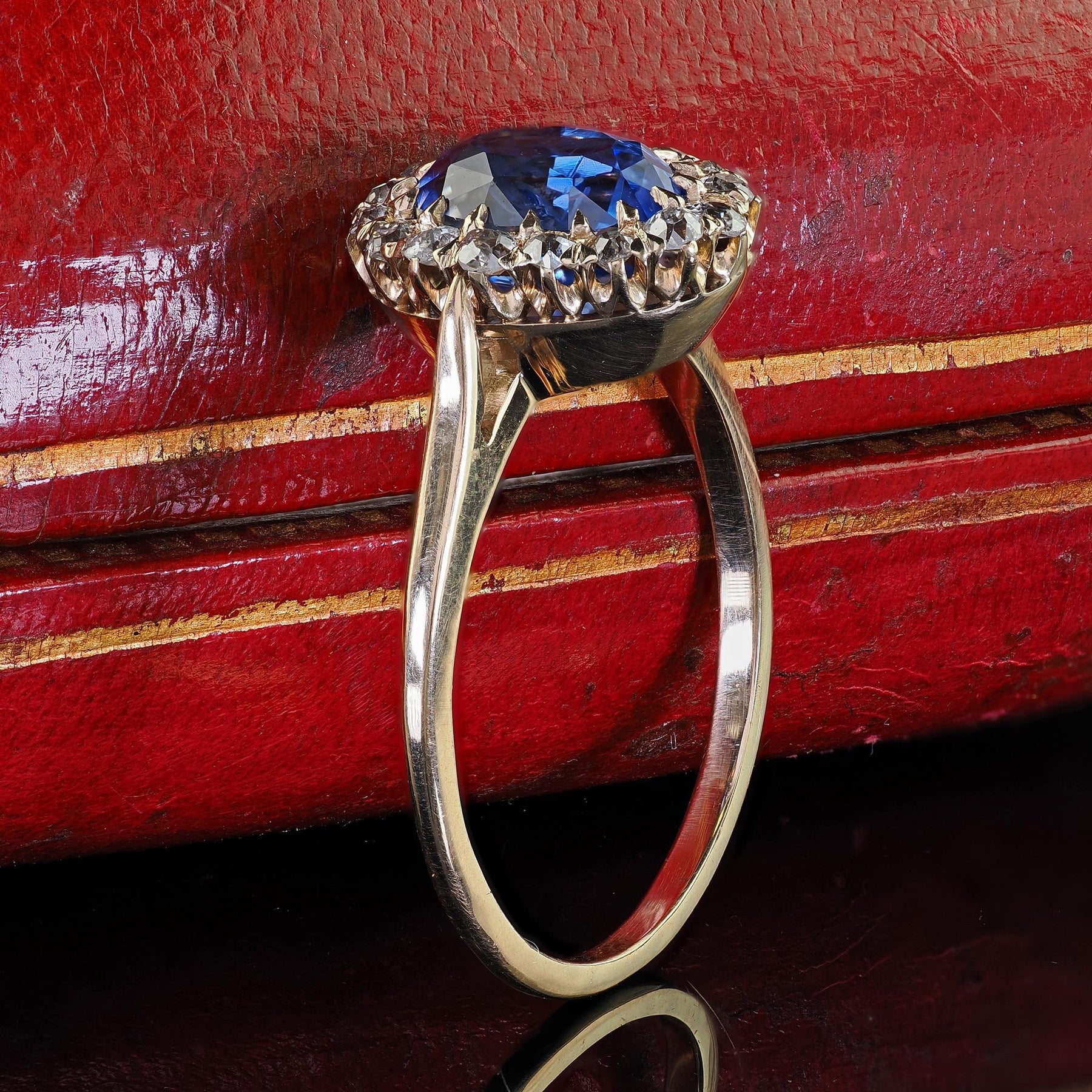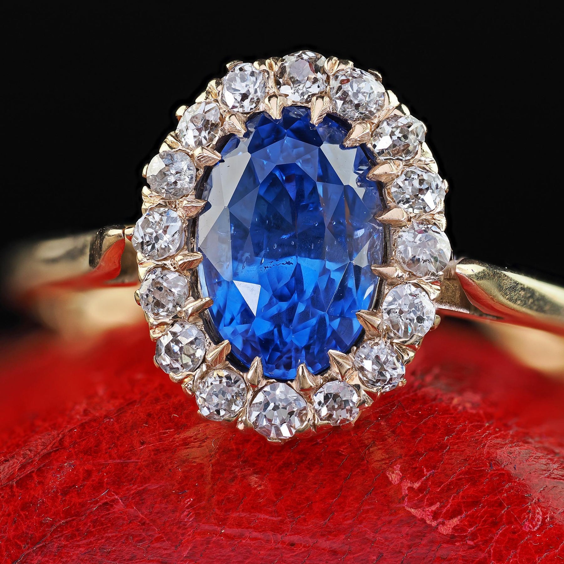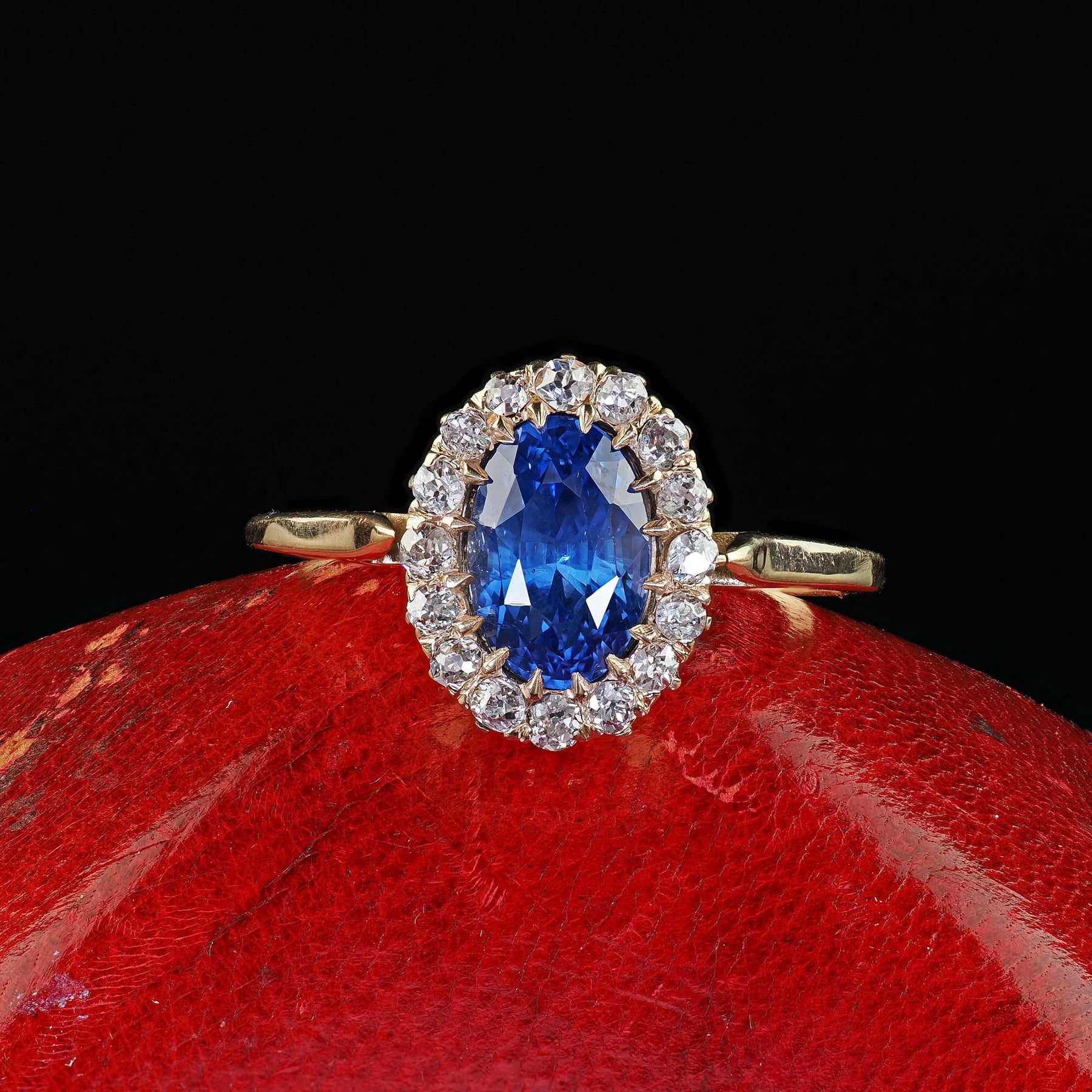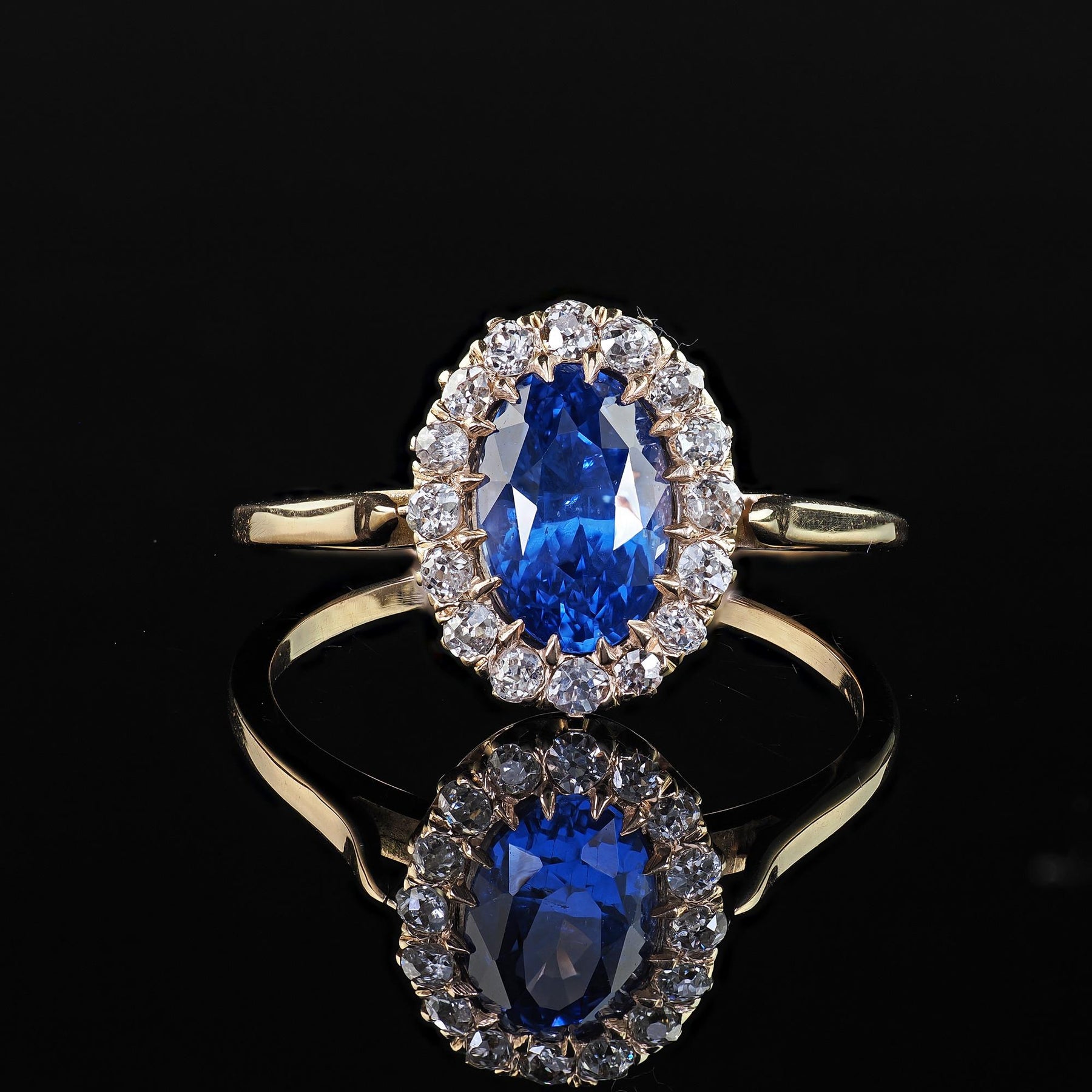 Beautiful Antique Victorian 14K Yellow Gold Ceylon Sapphire Diamond Engagement Ring - GIA. This beautiful Victorian Ceylon no heat diamond cluster engagement ring is crafted in 14k yellow gold. This beautiful ring features a bright cornflower blue sapphire in the center and has a GIA report. The sapphire is surrounded by old cut diamonds and is set in a beautiful Victorian mounting.