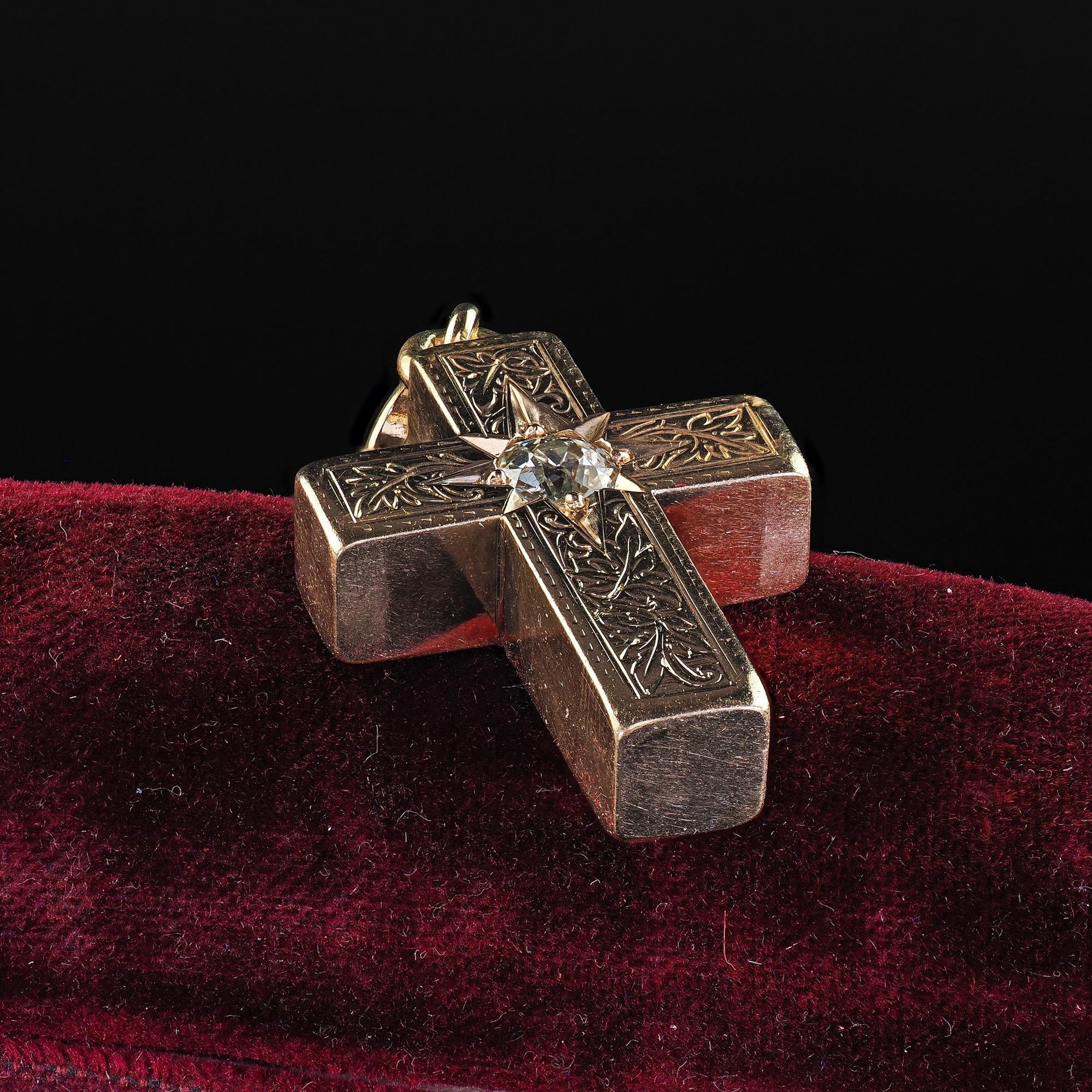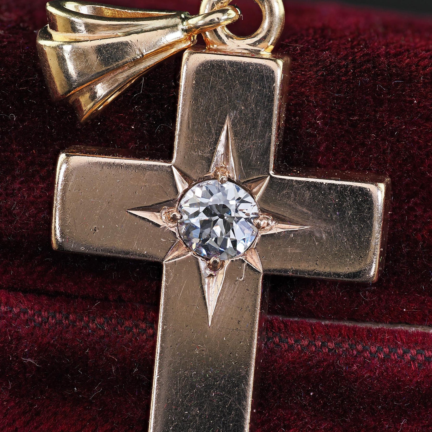 Beautiful Antique Victorian 14K Yellow Gold Old Euro Diamond Double Sided Cross Pendant. This incredible Victorian old European cut diamond double sided cross is crafted in 14k yellow gold. This beautiful pendant features an old European cut diamond set on both sides of the cross! One side of the pendant has engravings with a large old Euro diamond and the other side is plain with another large old Euro diamond. The pendant has a three dimensional design and has considerable weight to it.