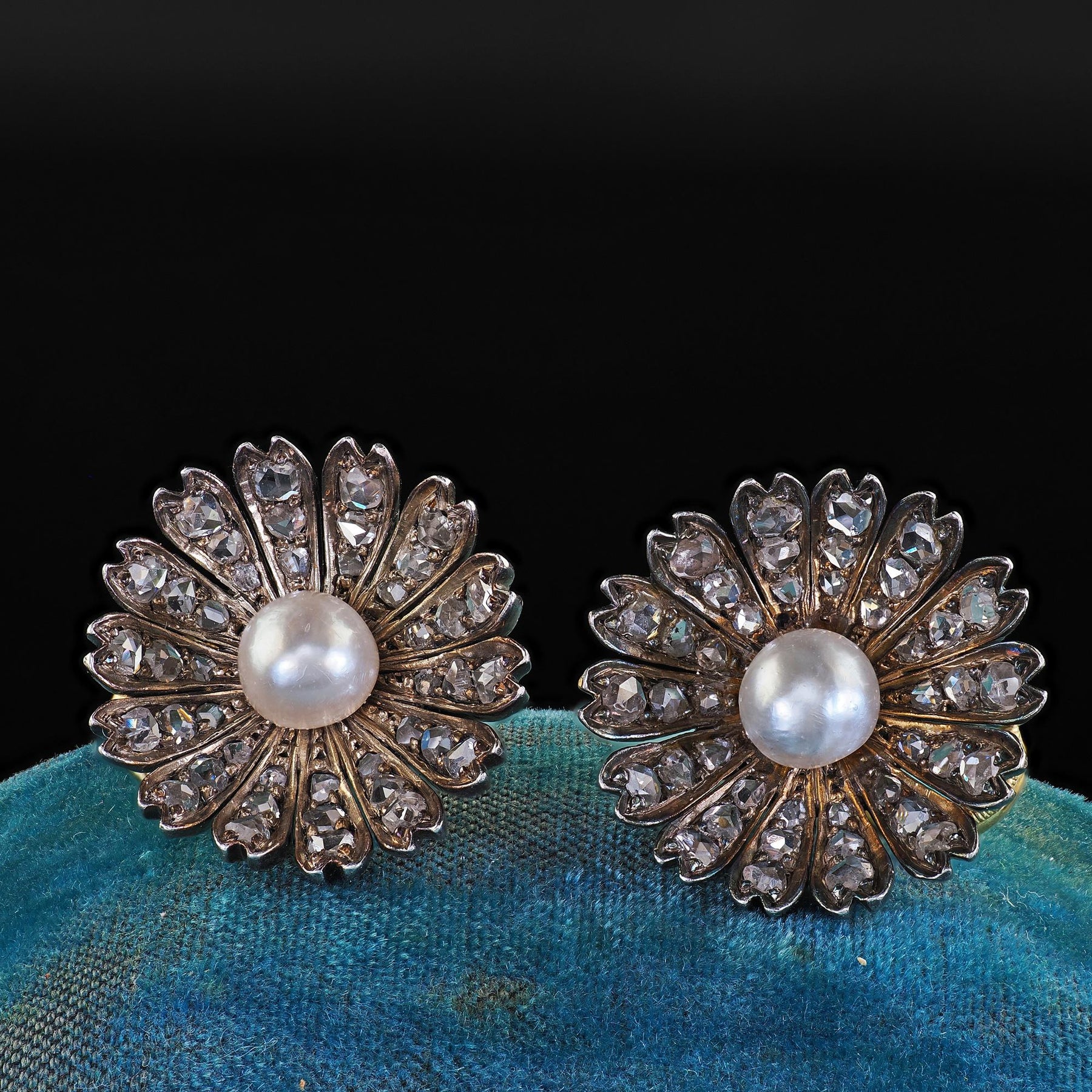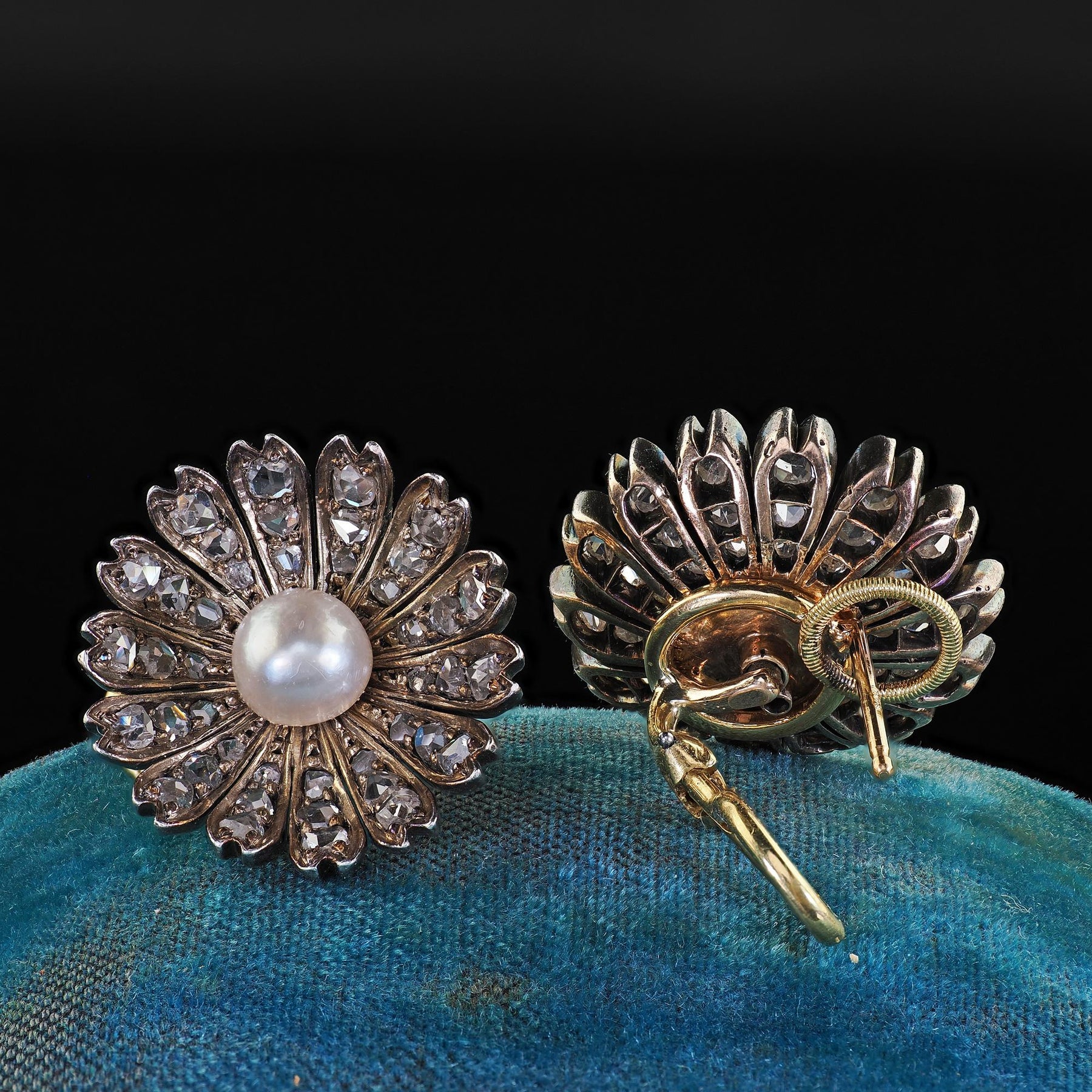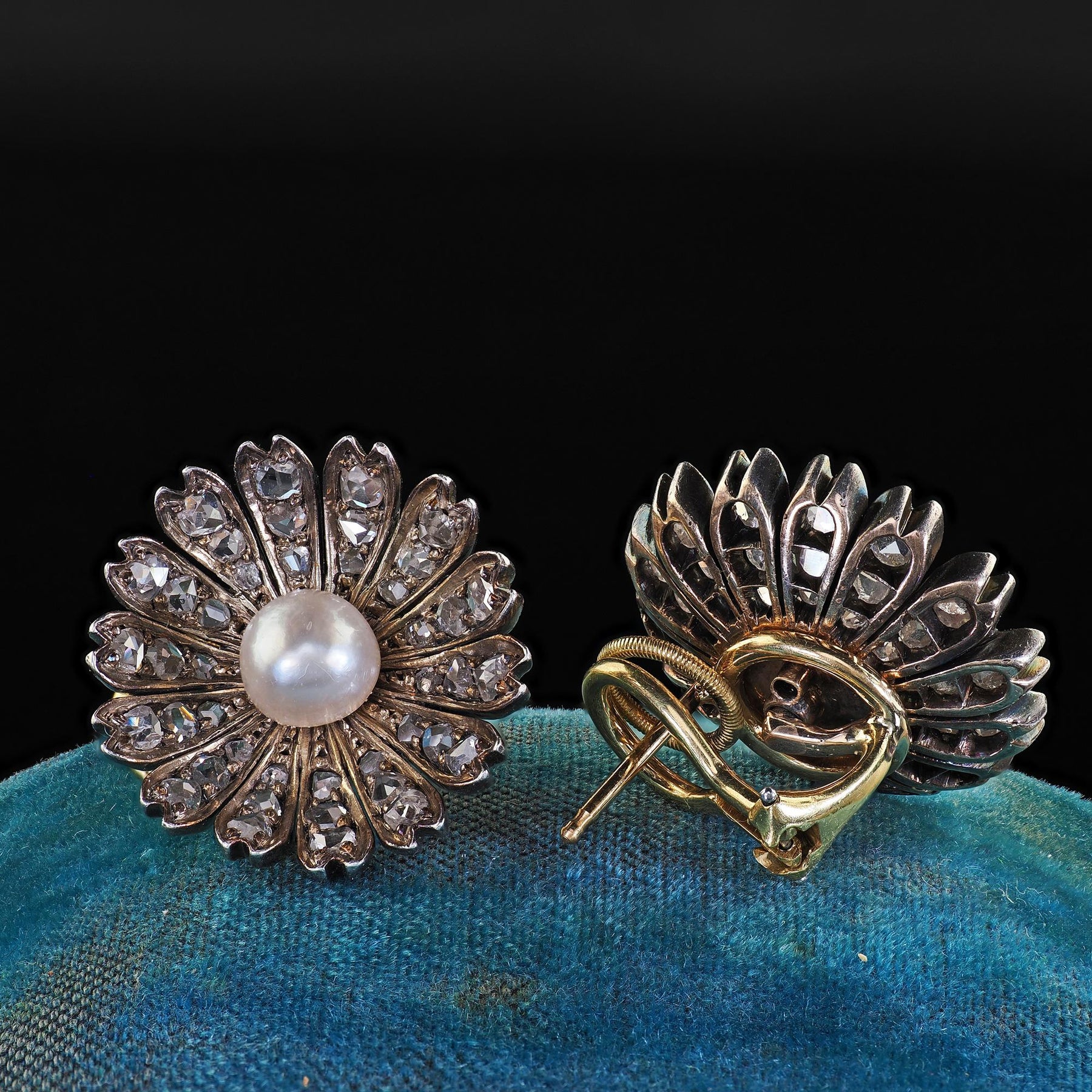Beautiful Antique Victorian 18K/14K Gold and Silver Rose Cut Diamond Pearl Floral Earrings. These beautiful Victorian rose cut diamond and pearl earrings are crafted in 14k/18K yellow gold and silver top. These gorgeous earrings feature rose cut diamonds set throughout the petals of the floral design with a natural pearl in the center of each earring. The backings of the earrings are 18k yellow gold while the main floral part of the earrings have 14k yellow gold back with silver top. The earrings are in great condition and sit beautifully when worn.