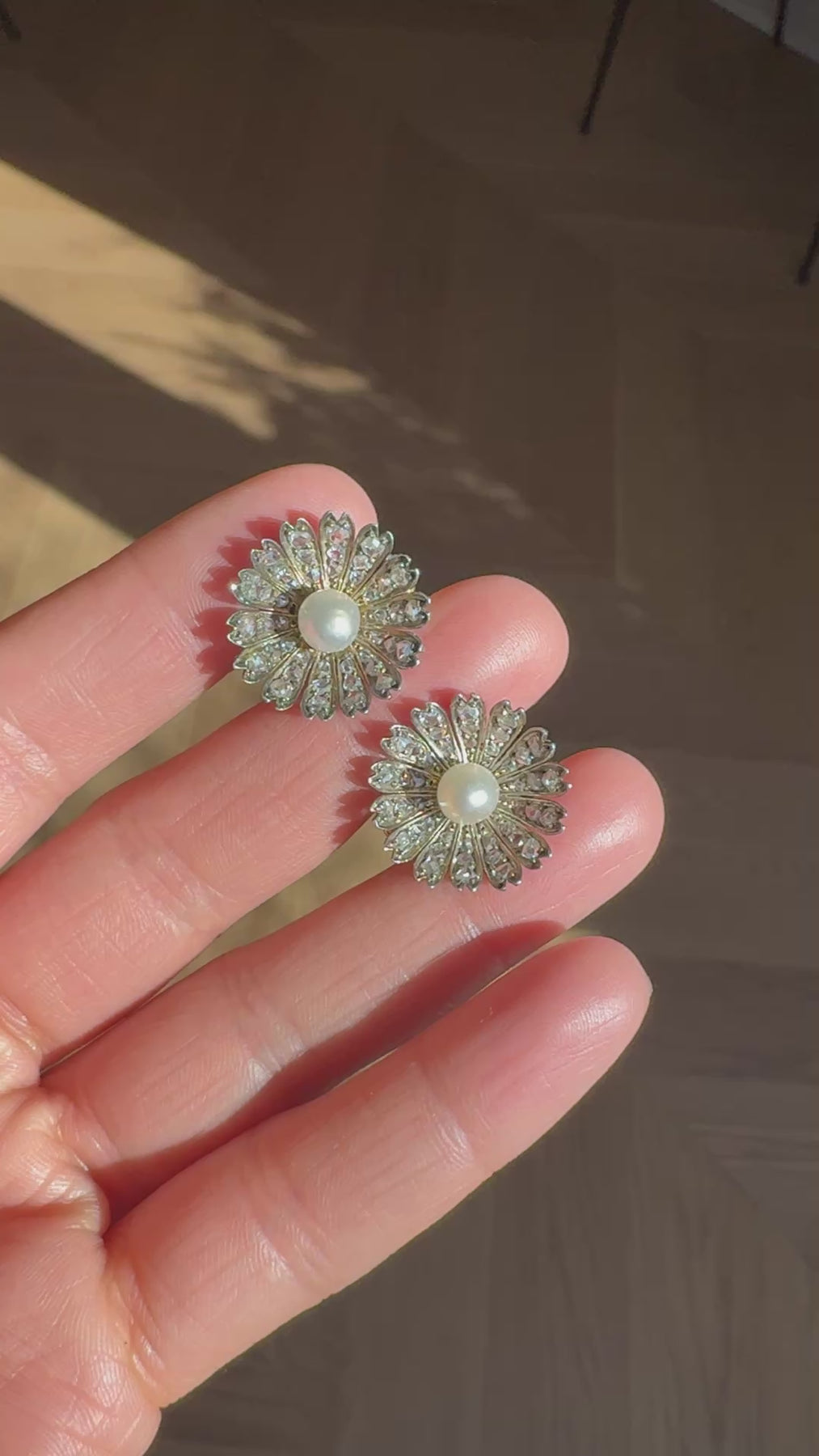 Antique Victorian 18K/14K Gold and Silver Rose Cut Diamond Pearl Floral Earrings