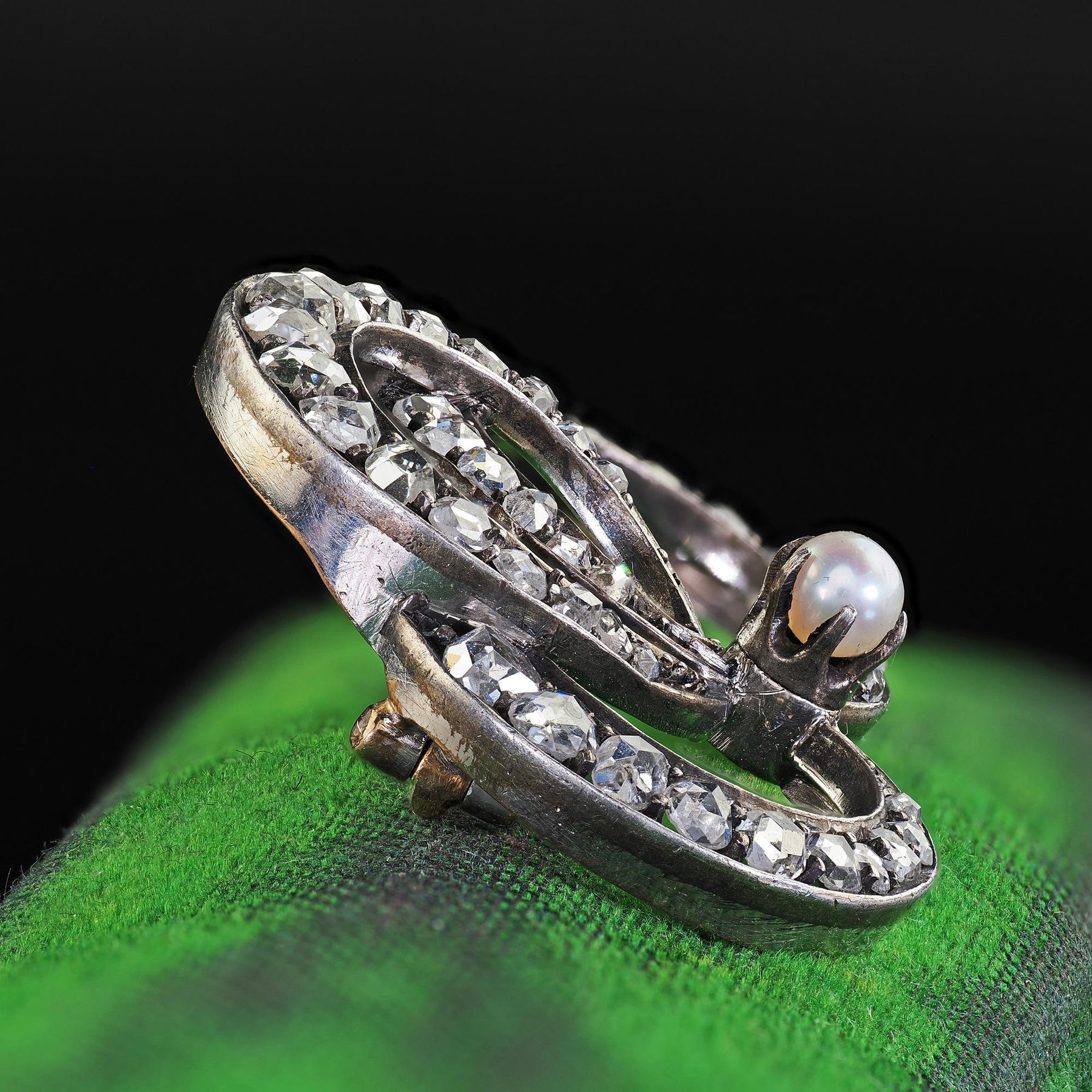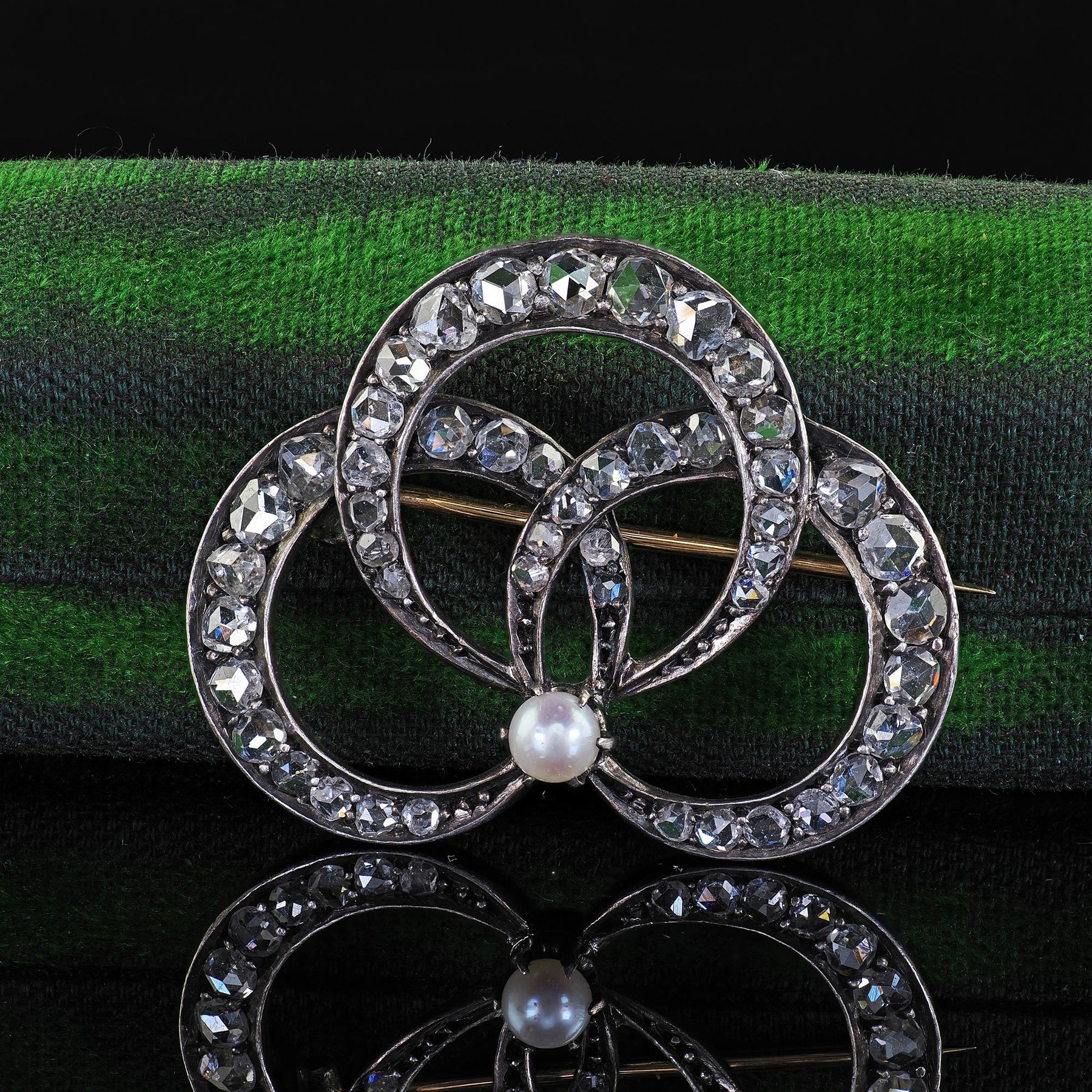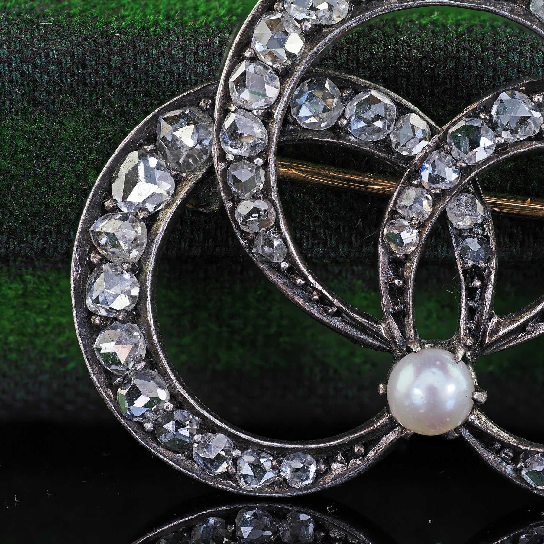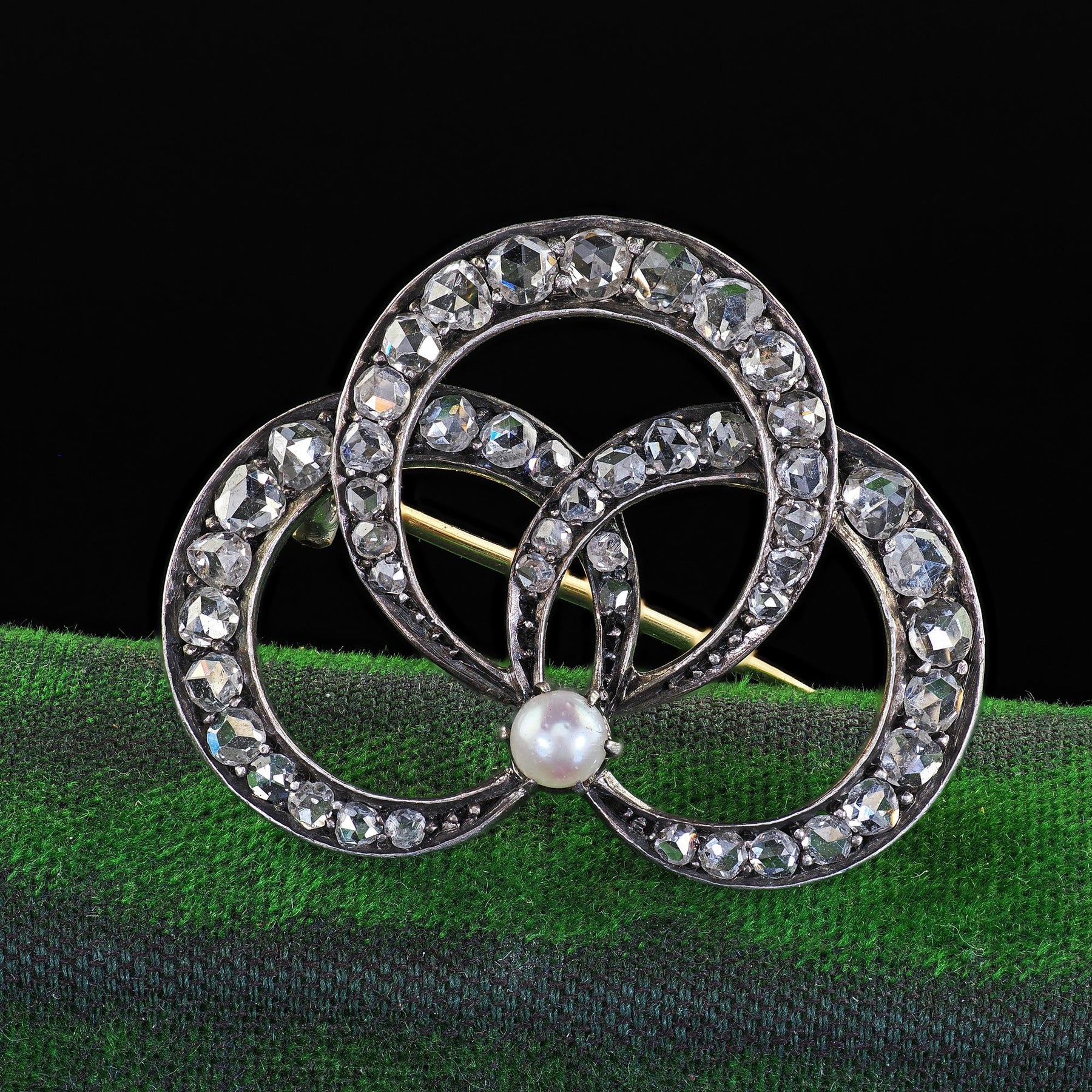 Antique Victorian 18K Gold and Silver Rose Cut Diamond and Pearl Pin Brooch