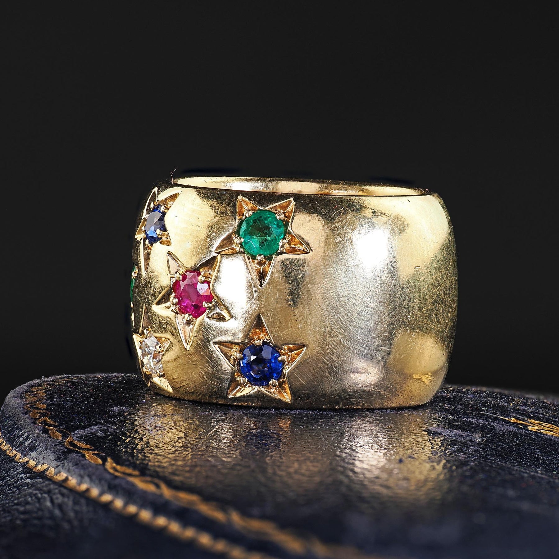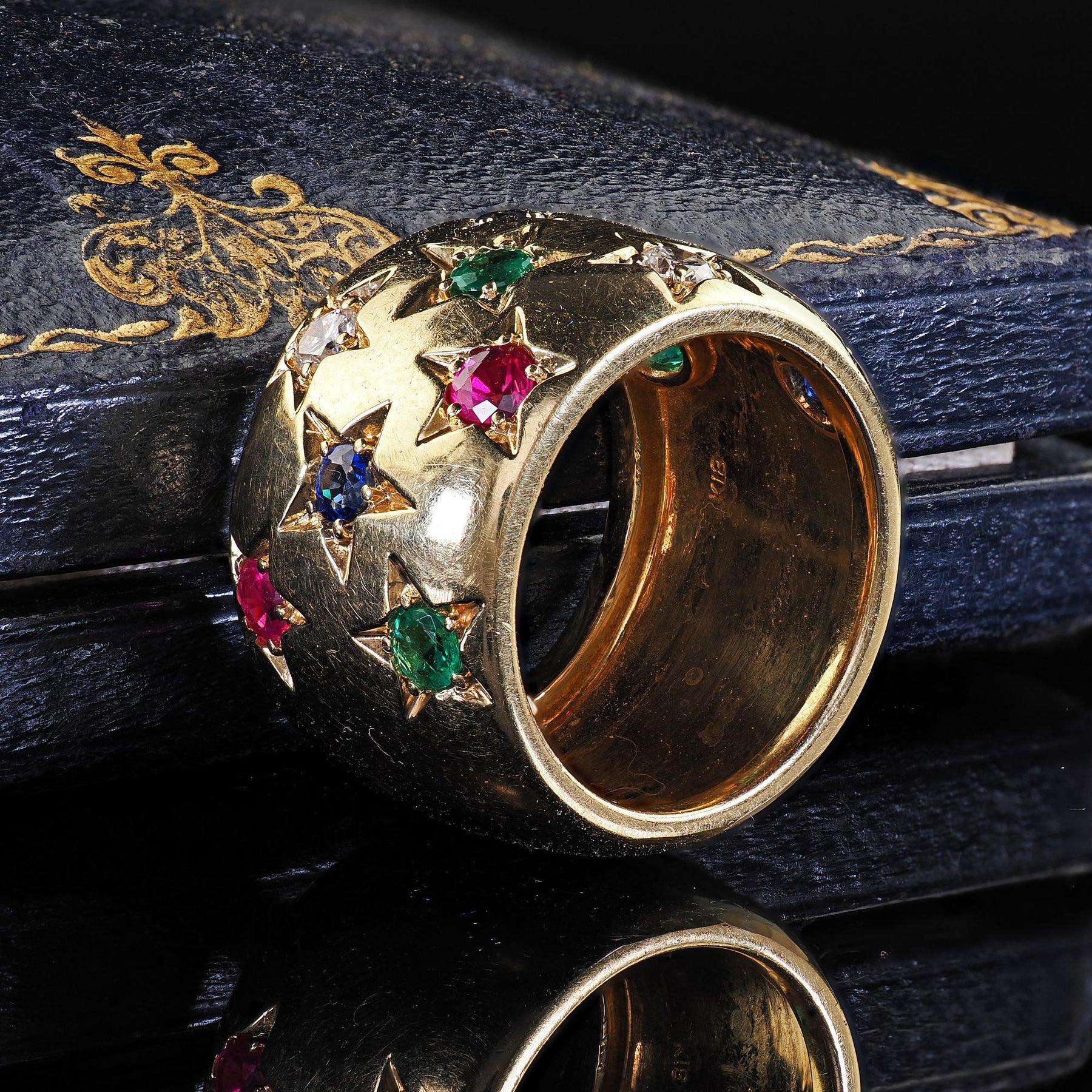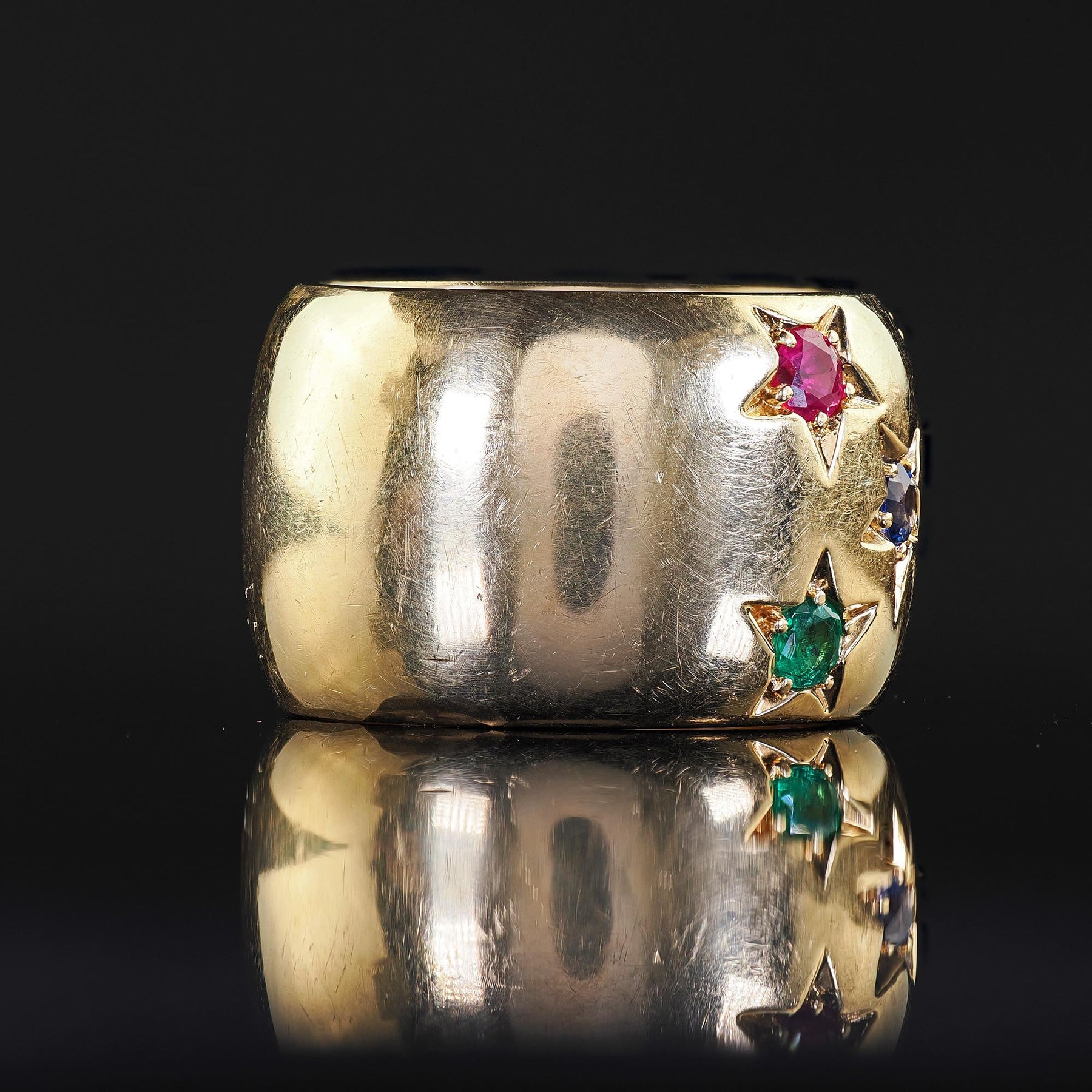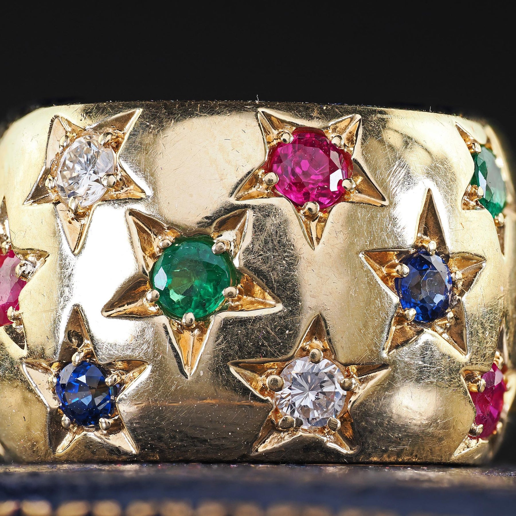 Vintage Estate 18K Yellow Gold Diamond Ruby Emerald Sapphire Star Set Wide Band