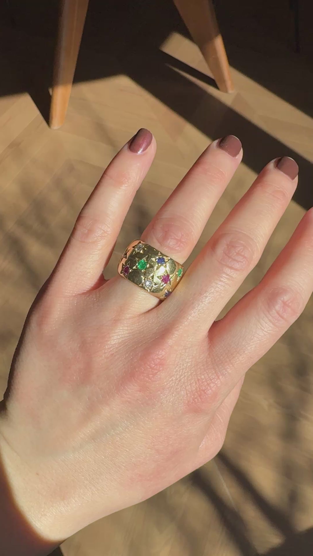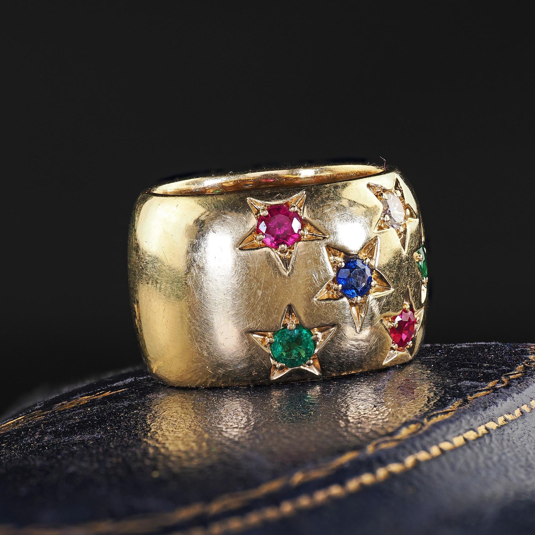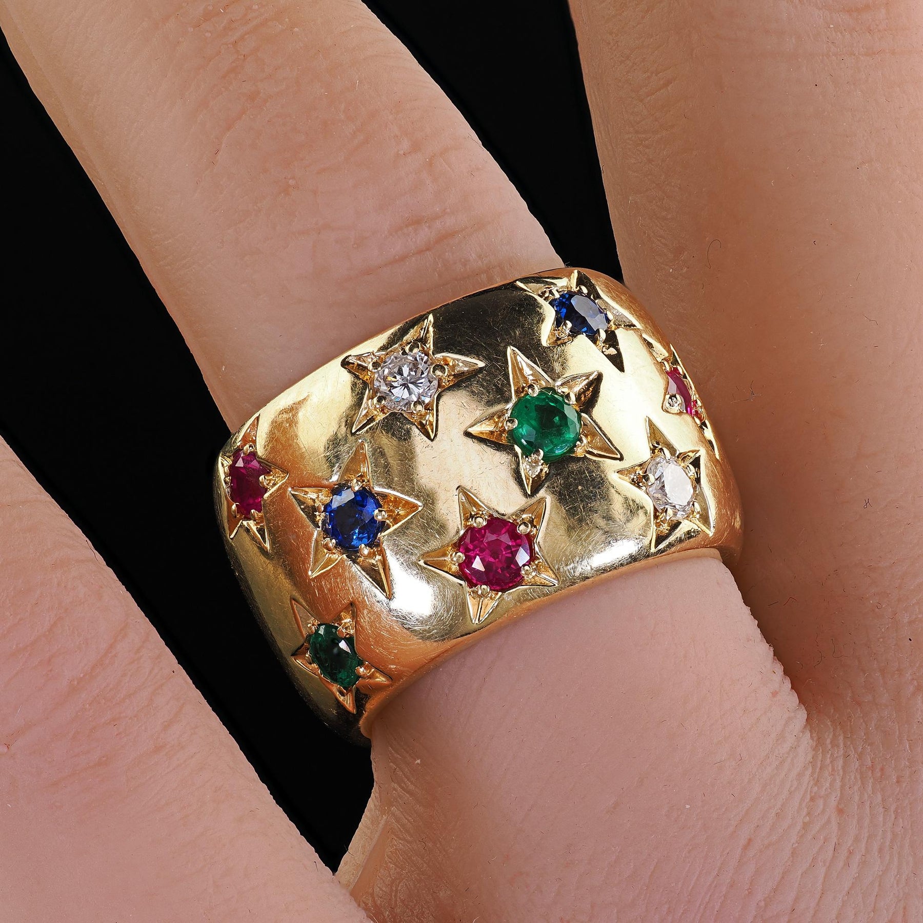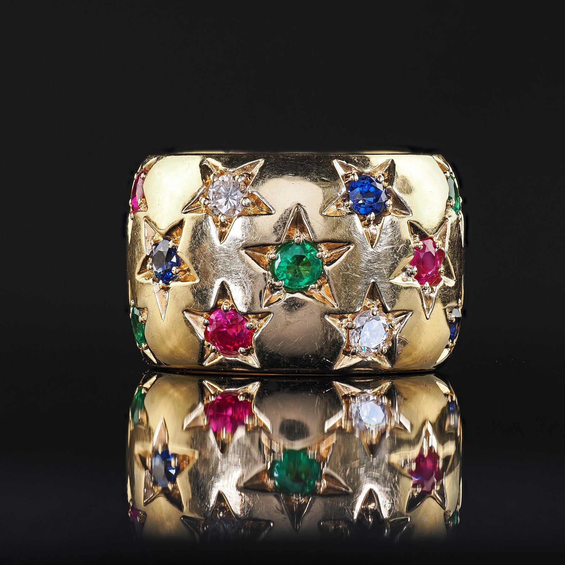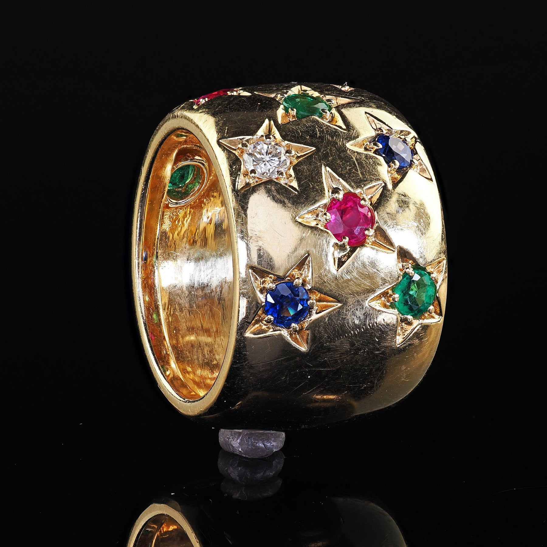 Vintage Estate 18K Yellow Gold Diamond Ruby Emerald Sapphire Star Set Wide Band