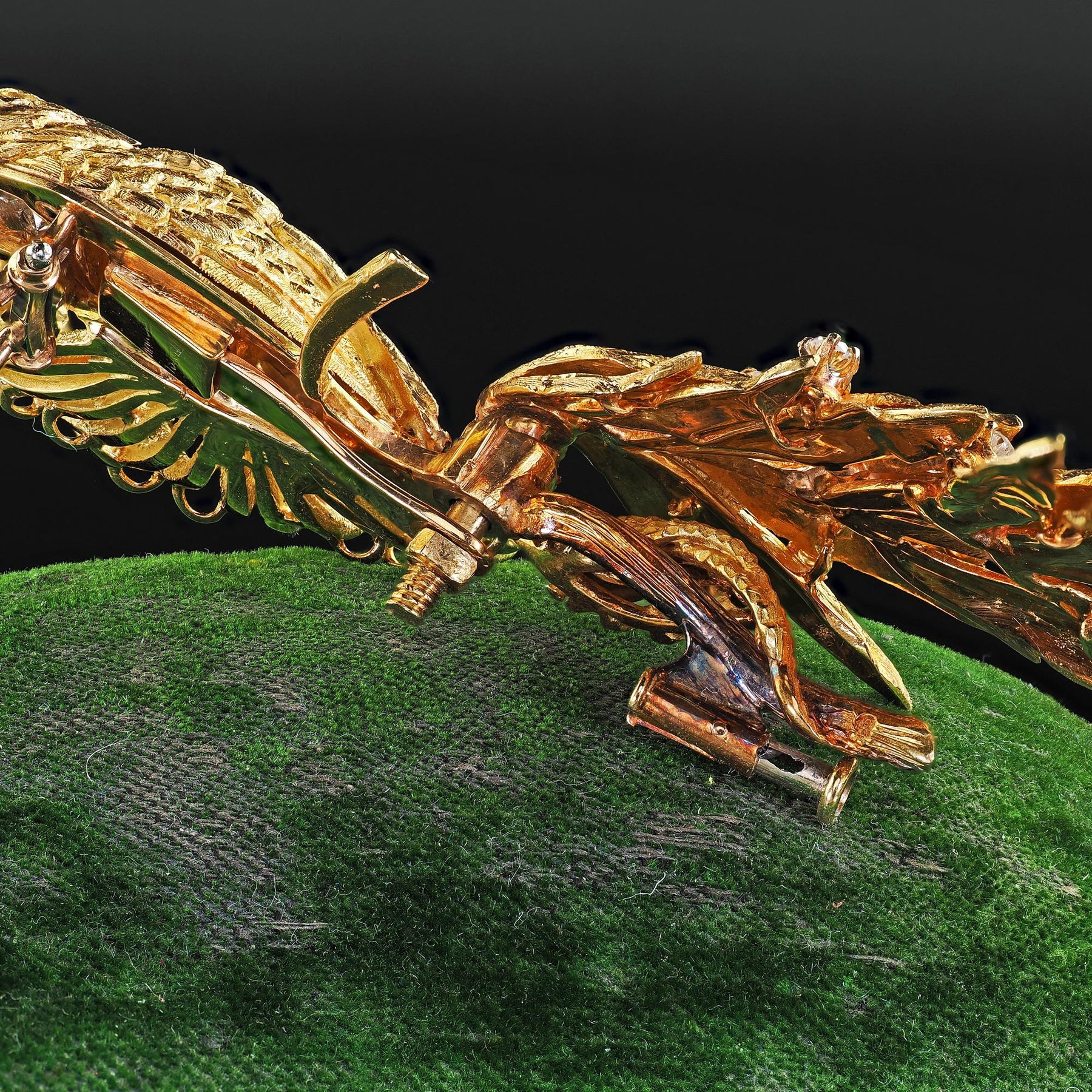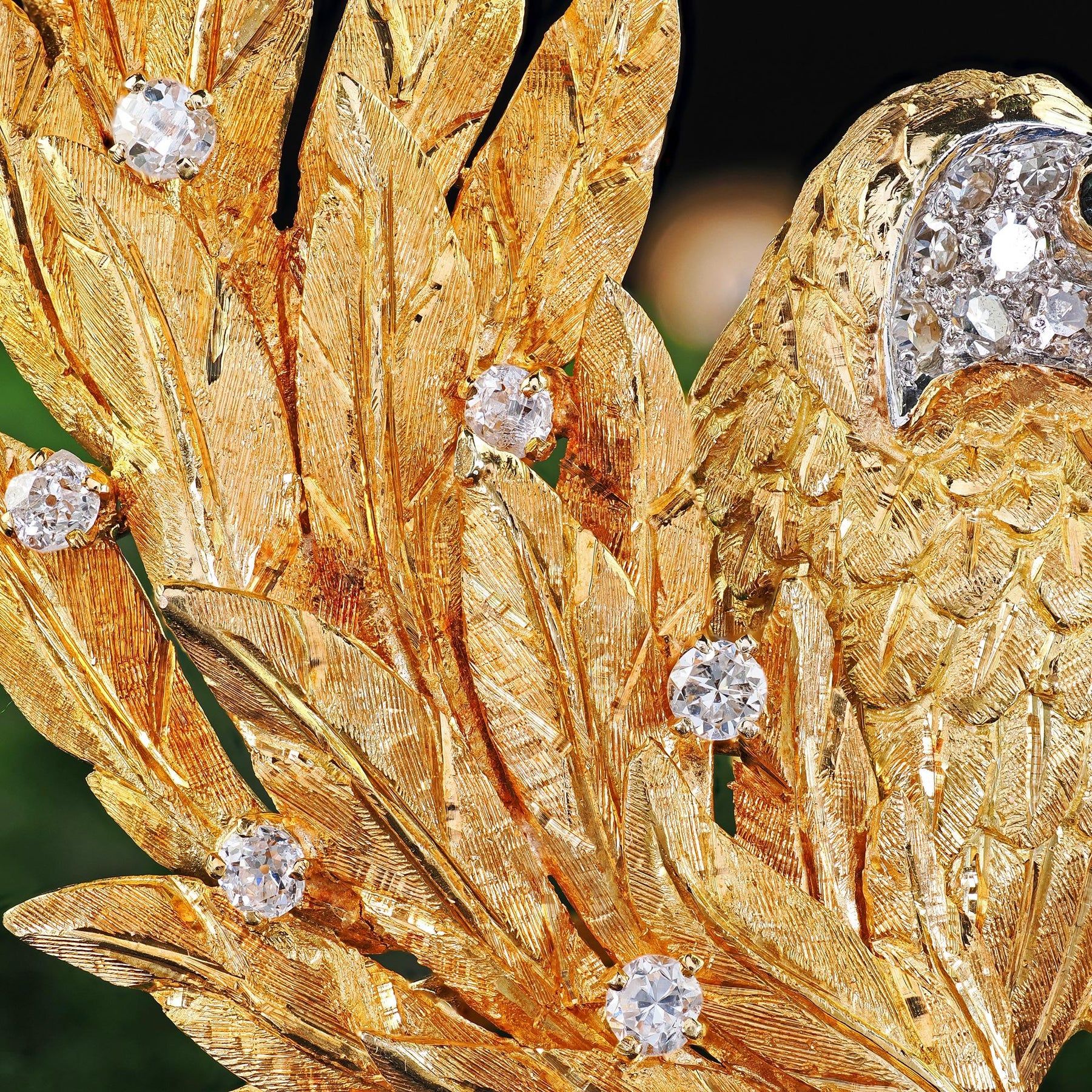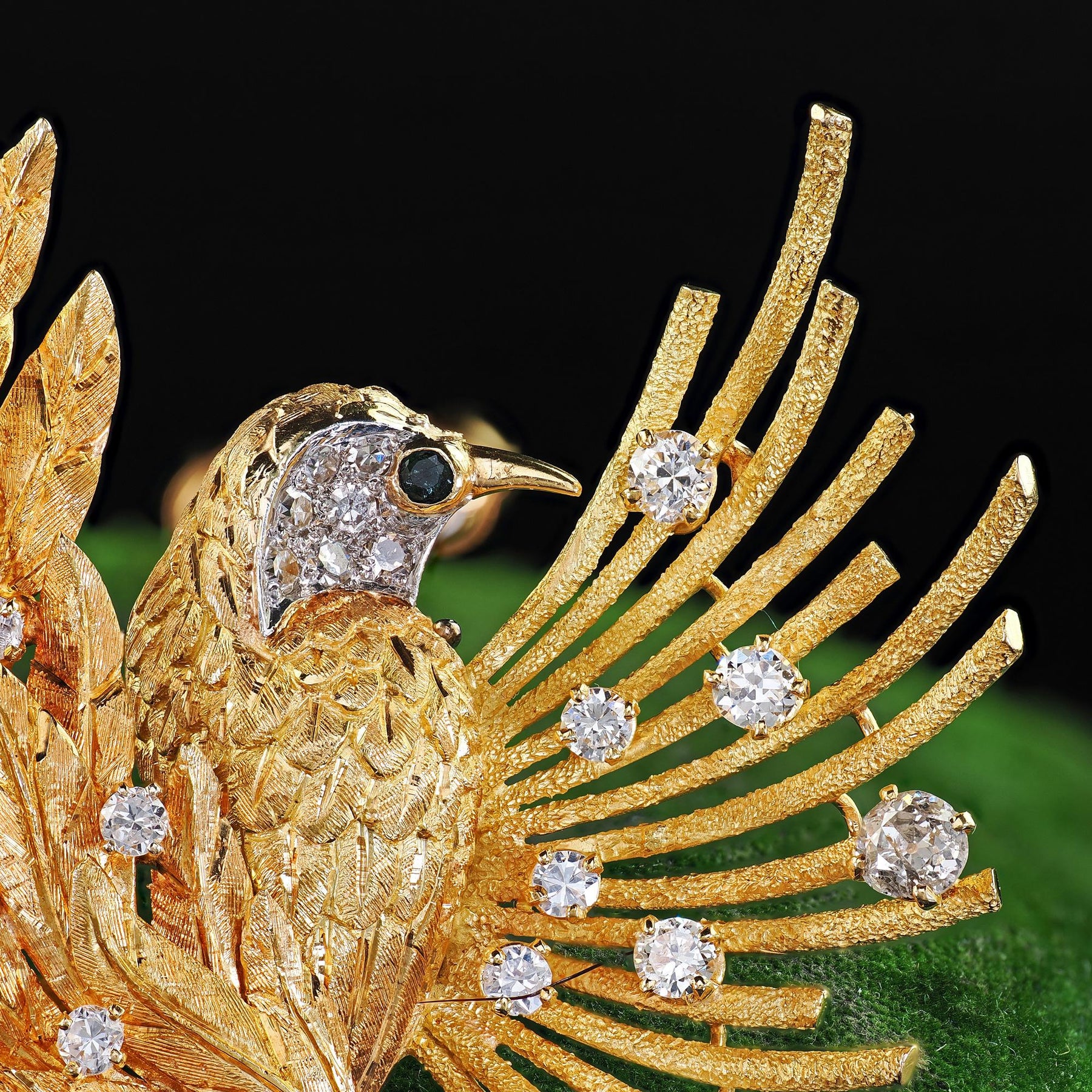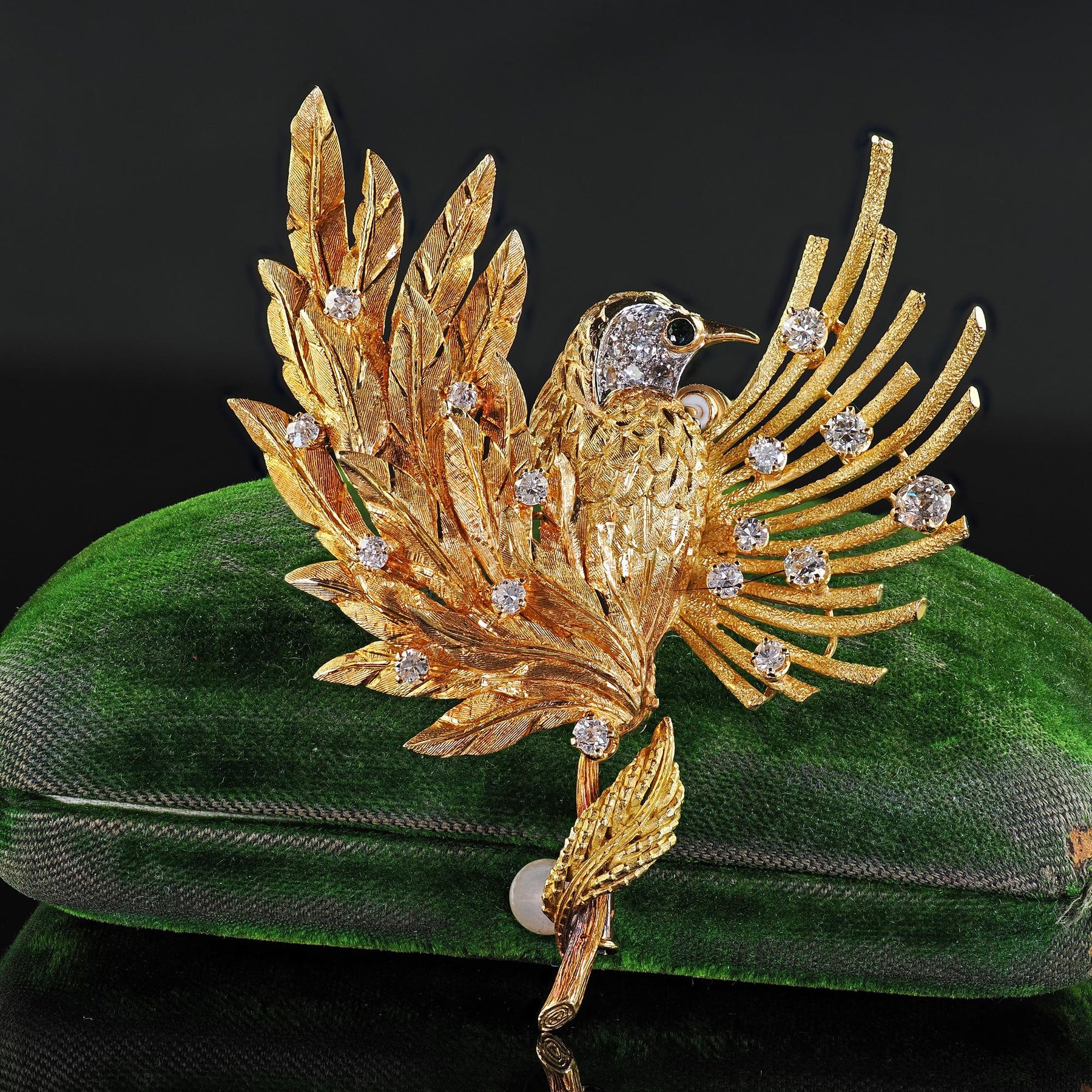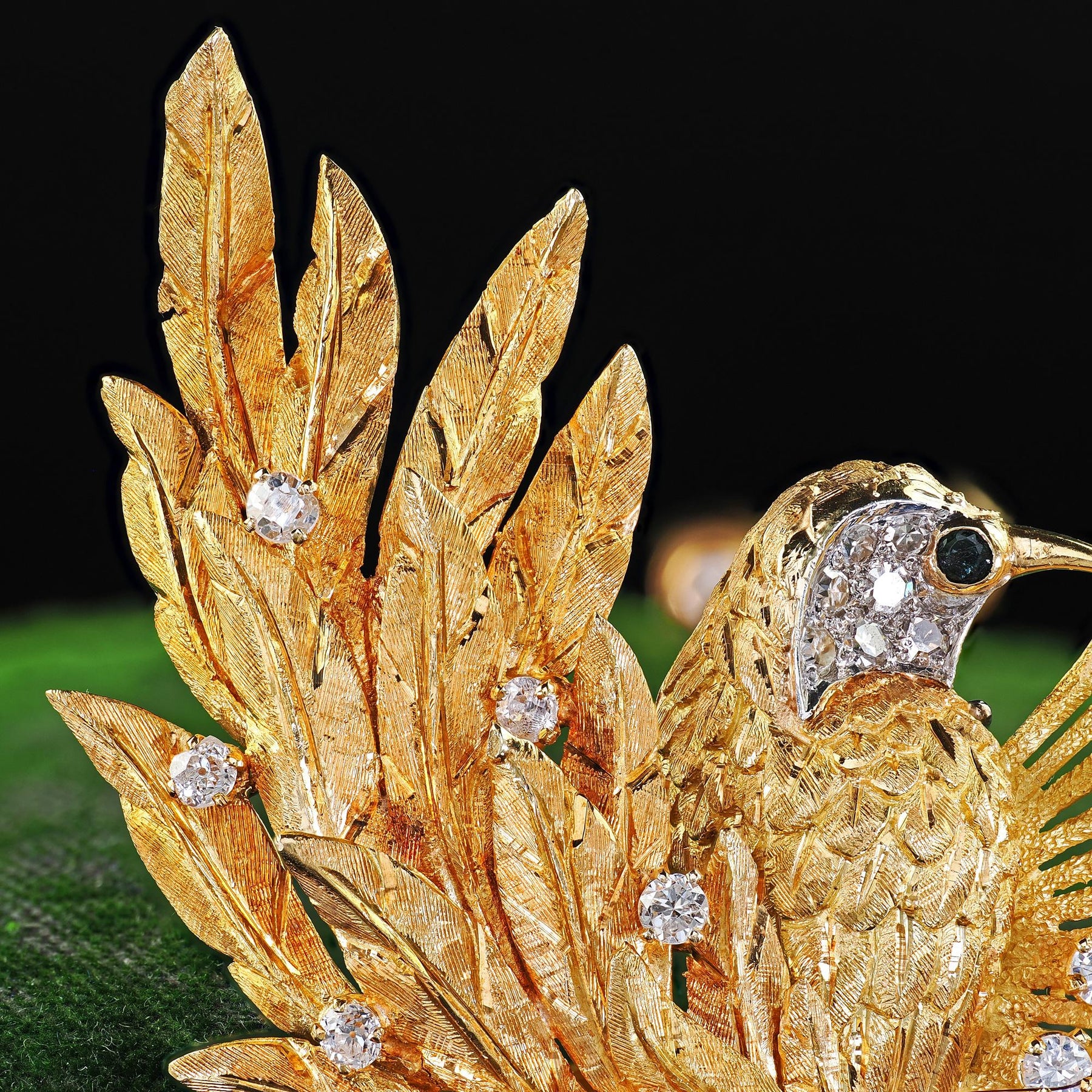 Beautiful Vintage Estate French 18K Yellow Gold Old Cut Diamond Bird of Paradise Pin. This incredible vintage estate French bird of paradise bird pin is crafted in 18k yellow gold. This incredible pin features old cut diamonds set throughout the bird and feathers with a natural sapphire as the eye. The pin itself has incredible detail and textures on the bird and feathers. The tail of the bird articulates below it, showcasing its beauty. The bird shows perched on a branch and has the French hallmark on the pin. The pin is in great condition and has slight oxidation on the gold due to the age.