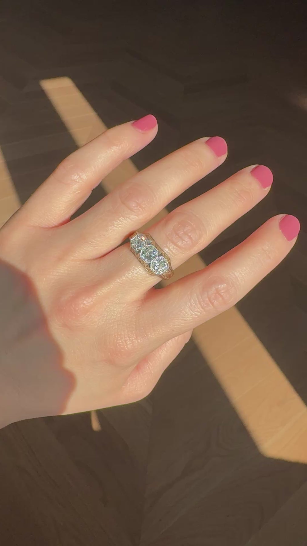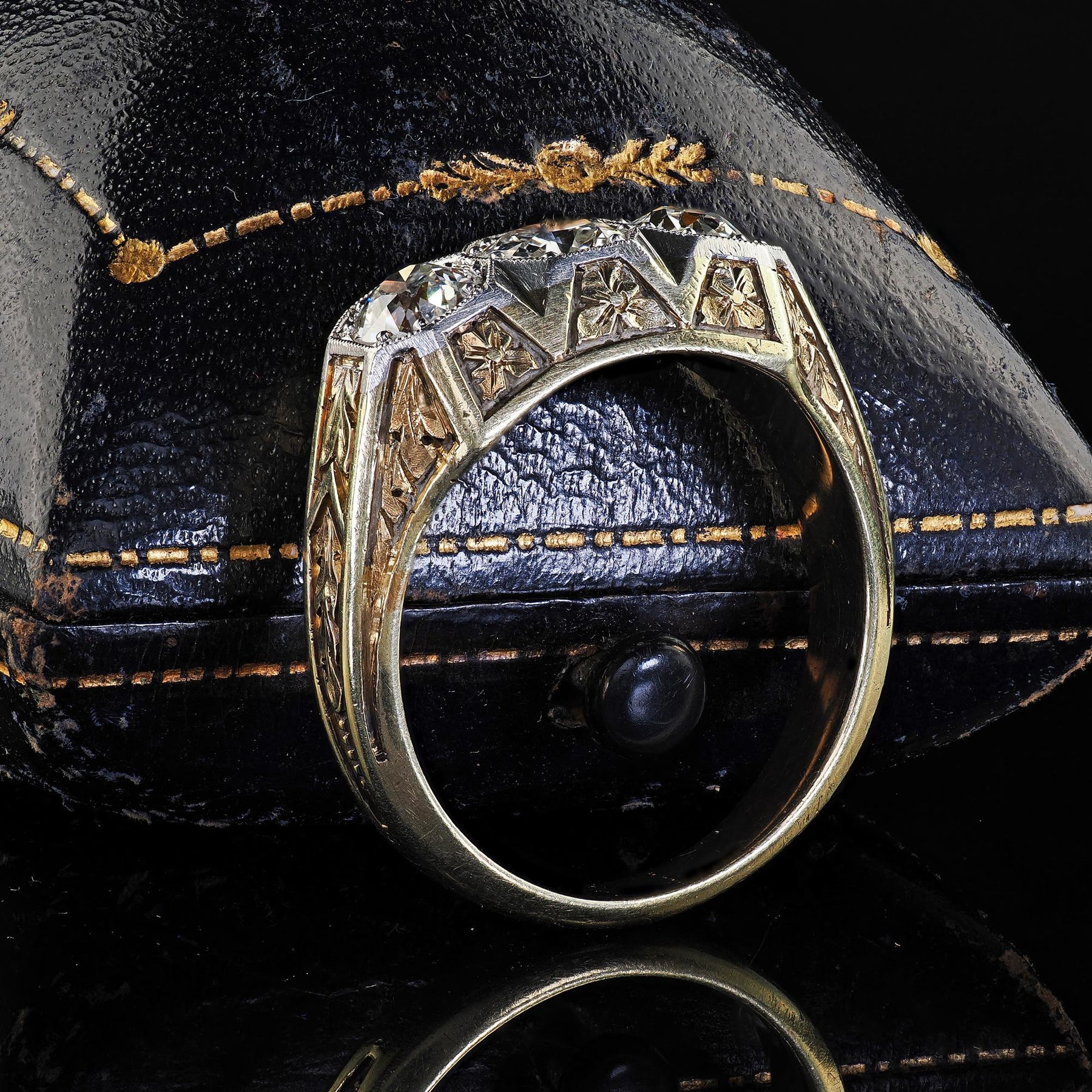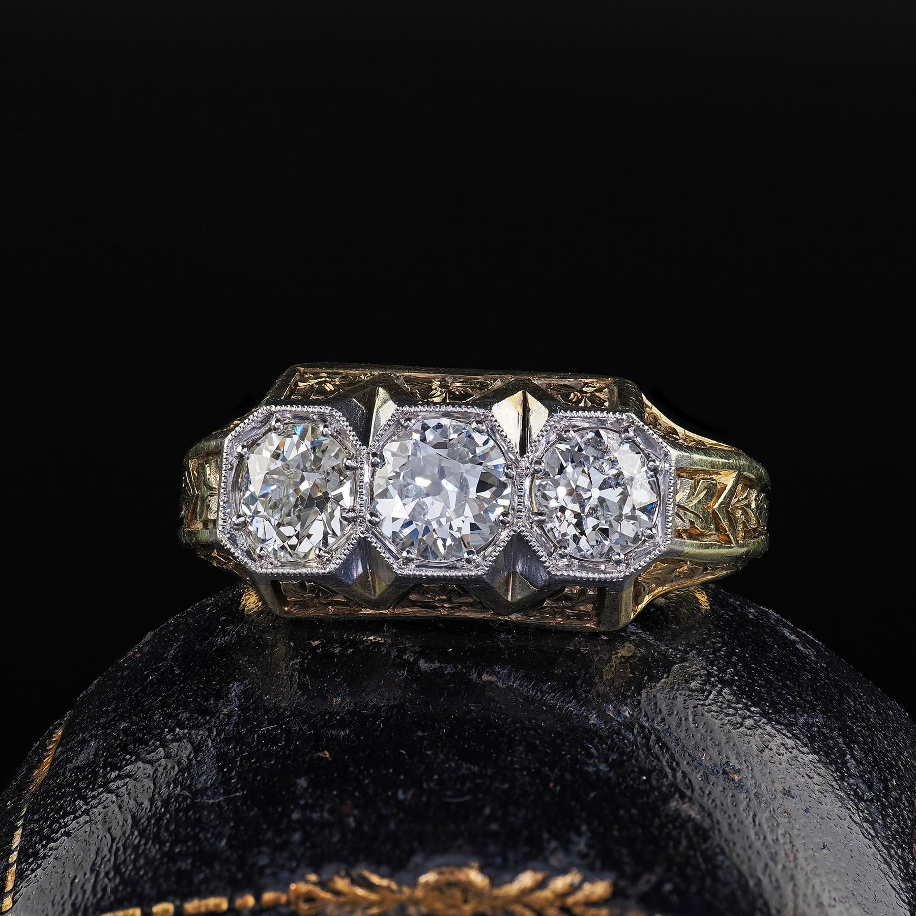 Antique Art Deco 14K Yellow Gold Old European Diamond Three Stone Engraved Ring