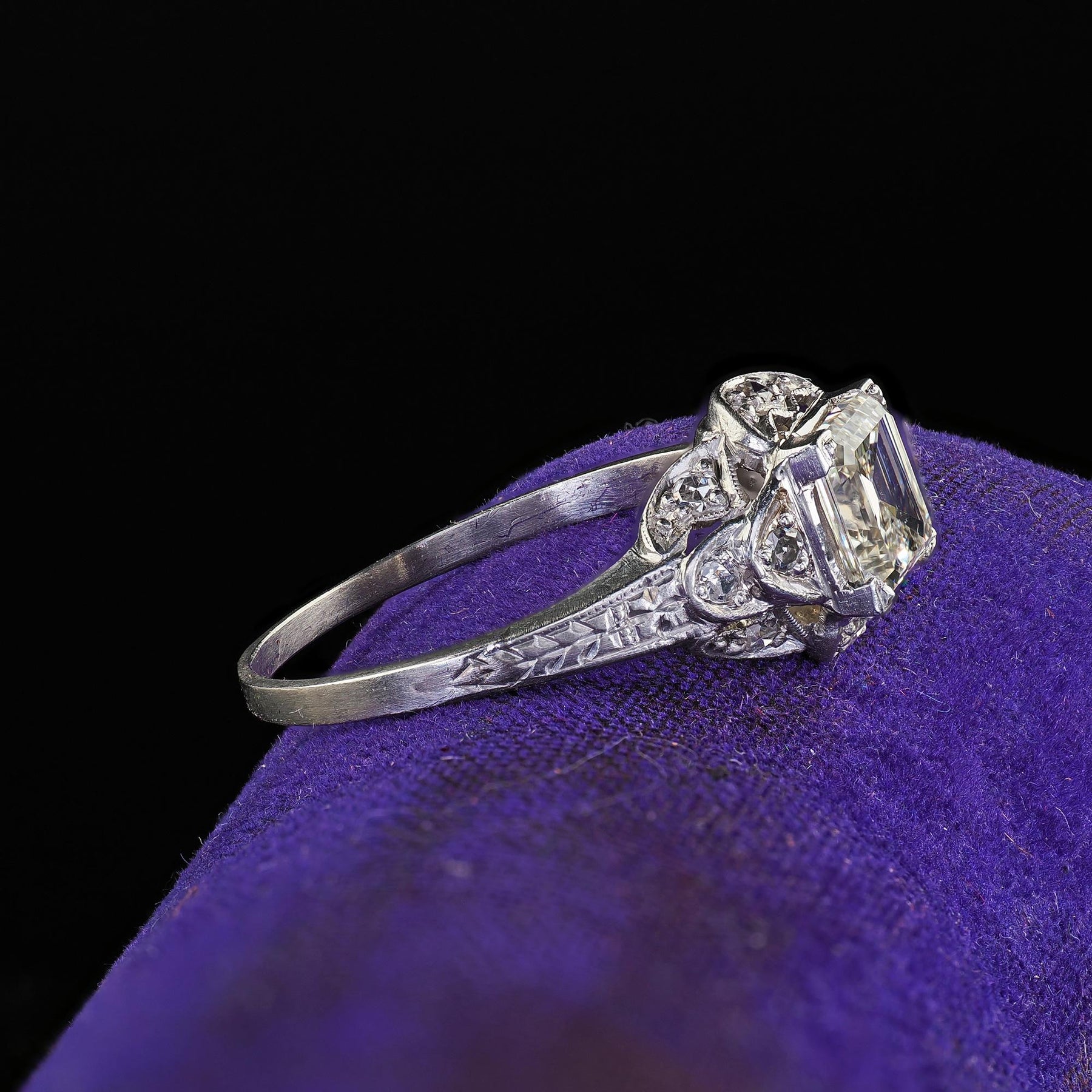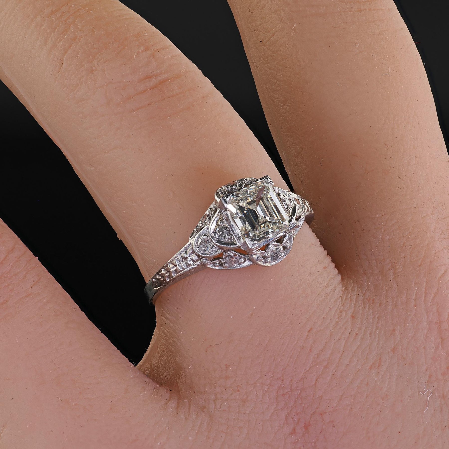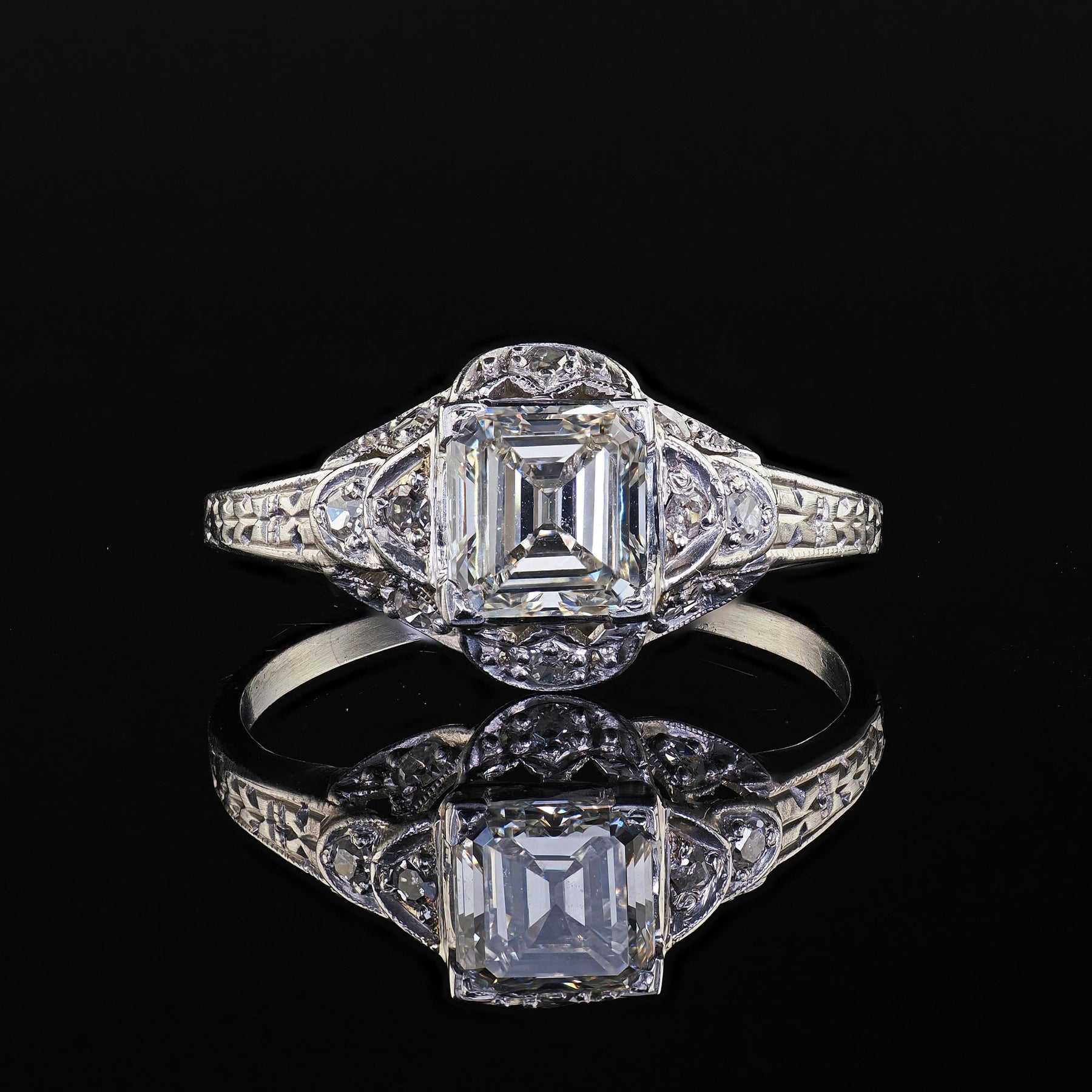 Beautiful Antique Art Deco Platinum Old Emerald Cut Diamond Engagement Ring - GIA. This gorgeous Art Deco old emerald cut diamond engagement ring is crafted in platinum. The ring features an old square emerald cut diamond that comes with a GIA report. The diamond is set in a beautiful Art Deco mounting that has gorgeous engravings and filigree designs around the ring. The ring sits low on the finger and is in good condition.