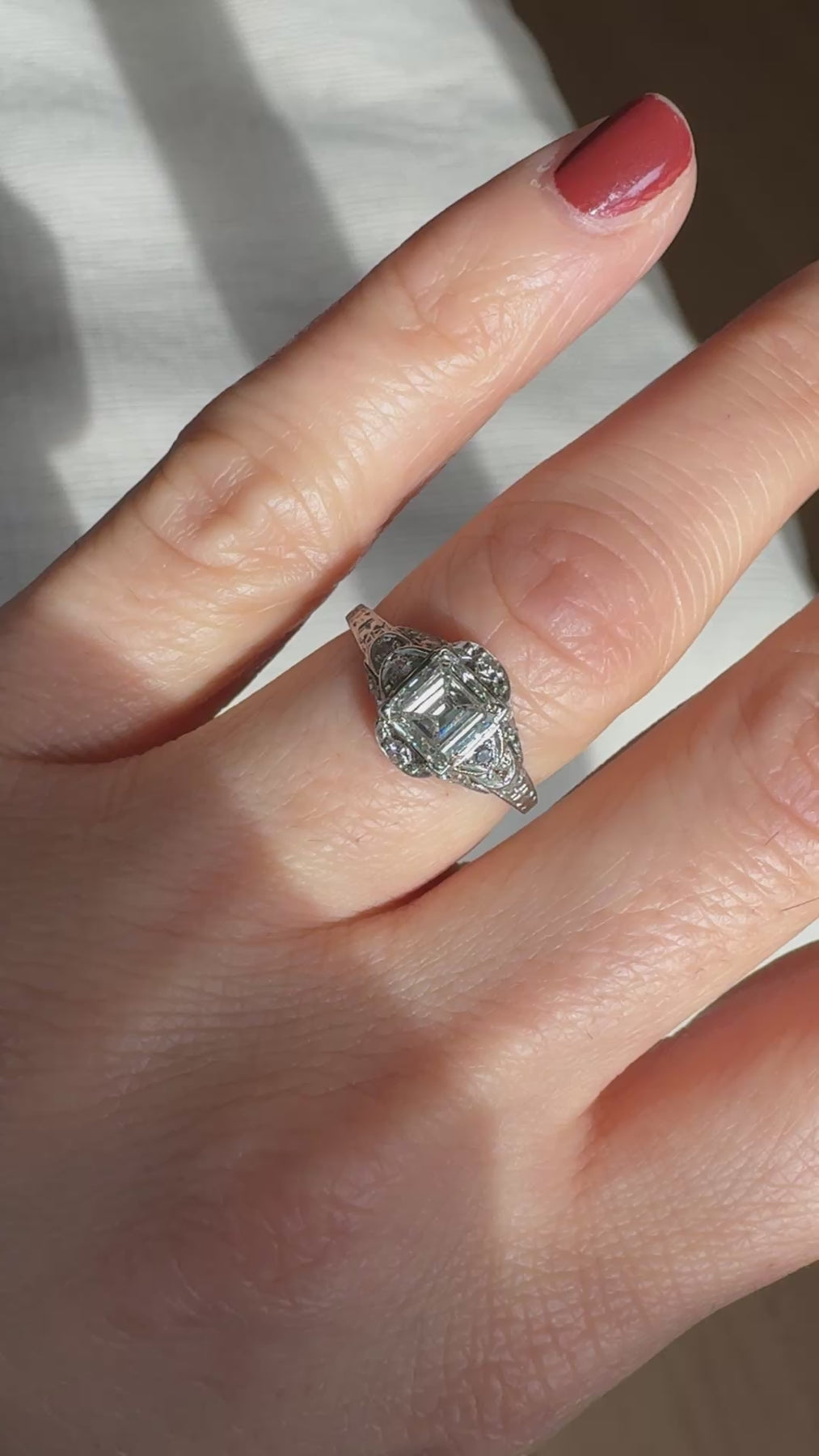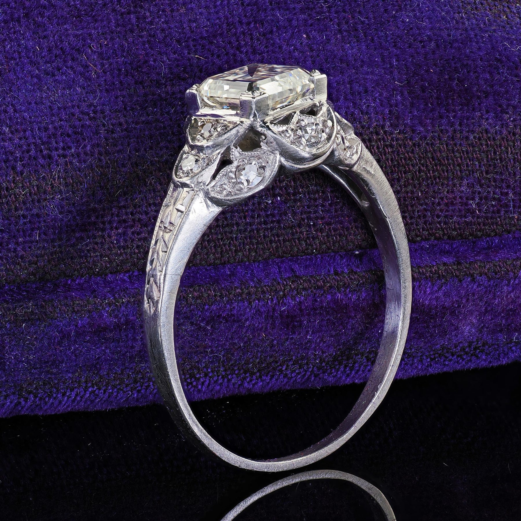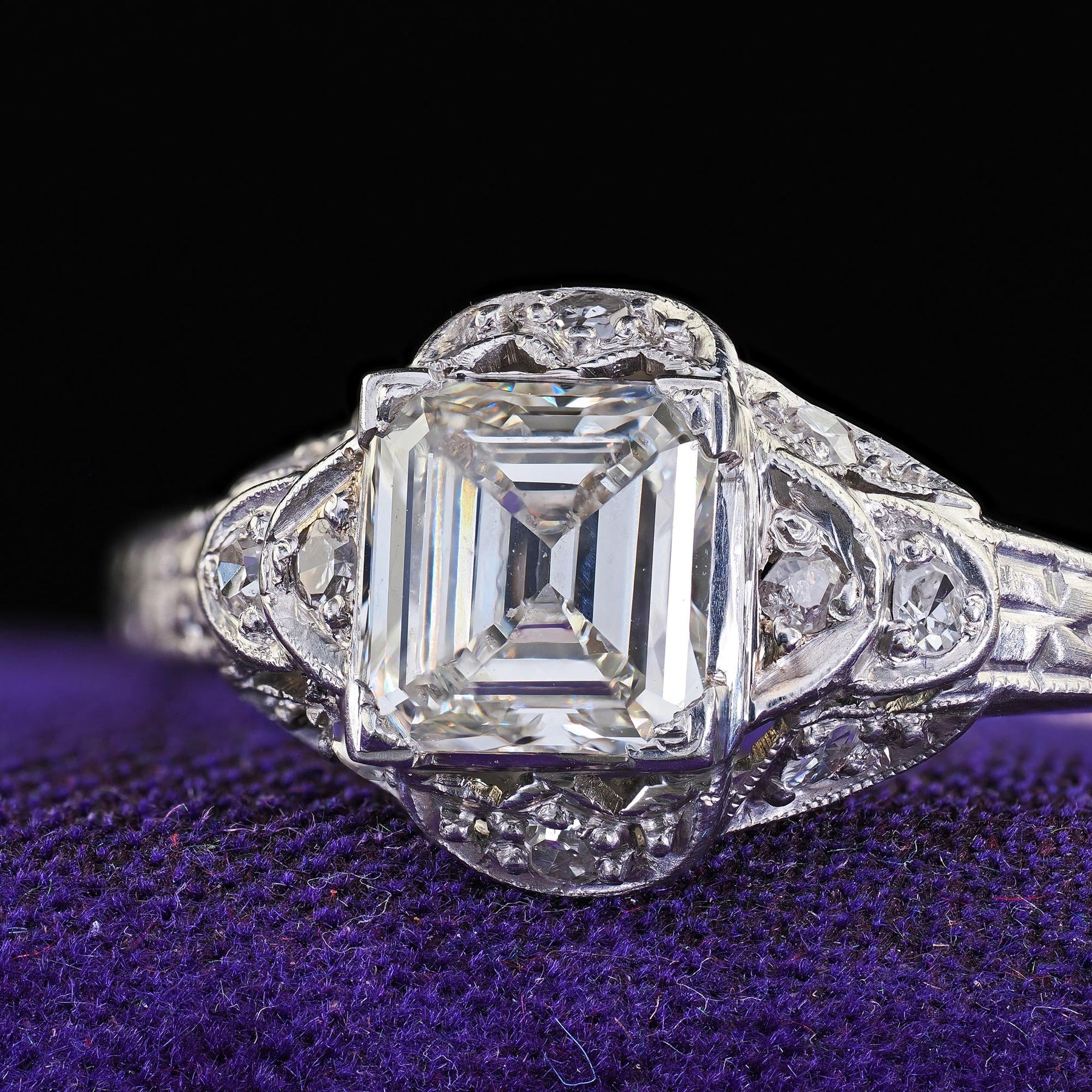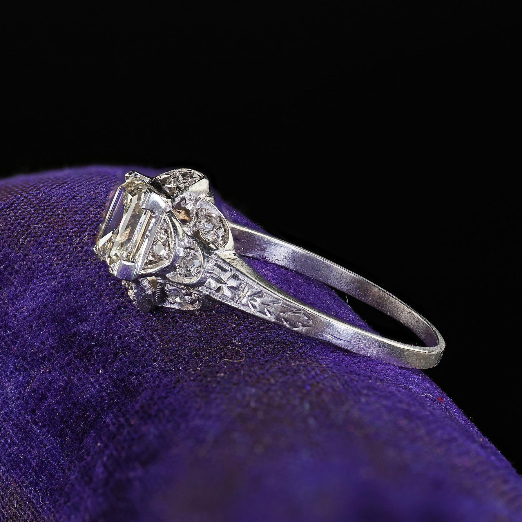 Beautiful Antique Art Deco Platinum Old Emerald Cut Diamond Engagement Ring - GIA. This gorgeous Art Deco old emerald cut diamond engagement ring is crafted in platinum. The ring features an old square emerald cut diamond that comes with a GIA report. The diamond is set in a beautiful Art Deco mounting that has gorgeous engravings and filigree designs around the ring. The ring sits low on the finger and is in good condition.