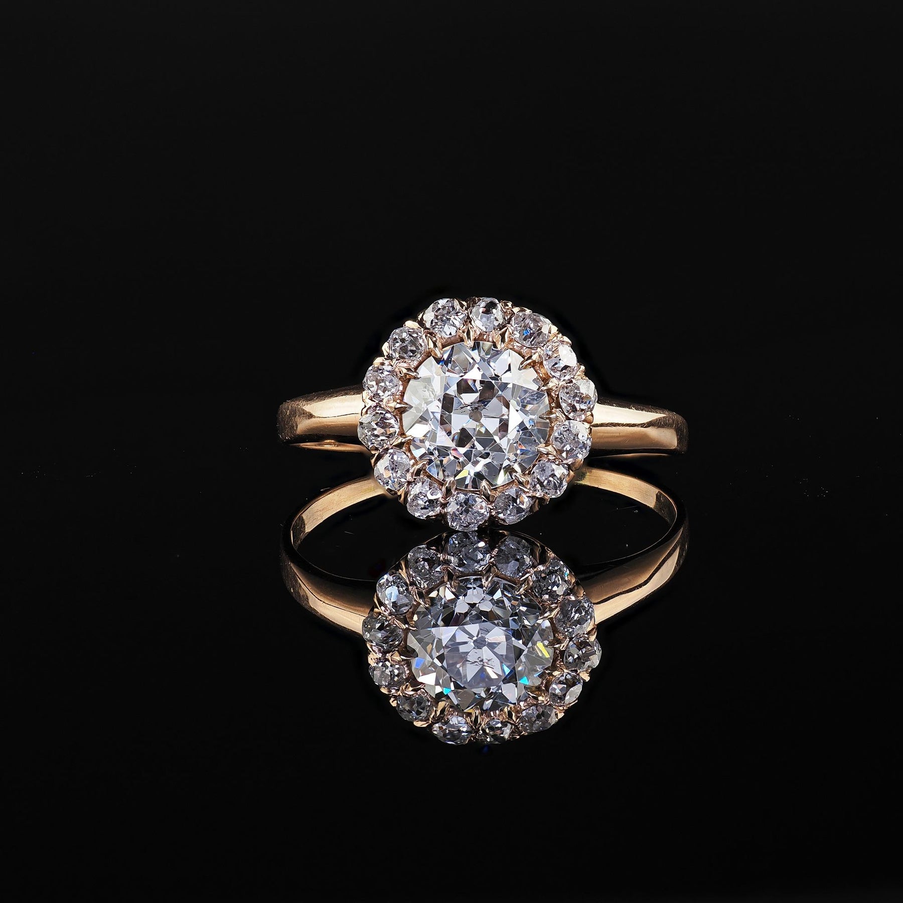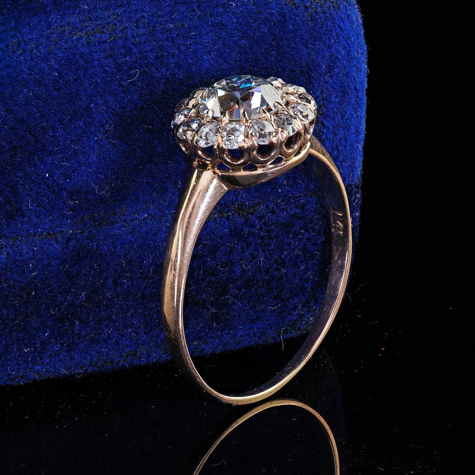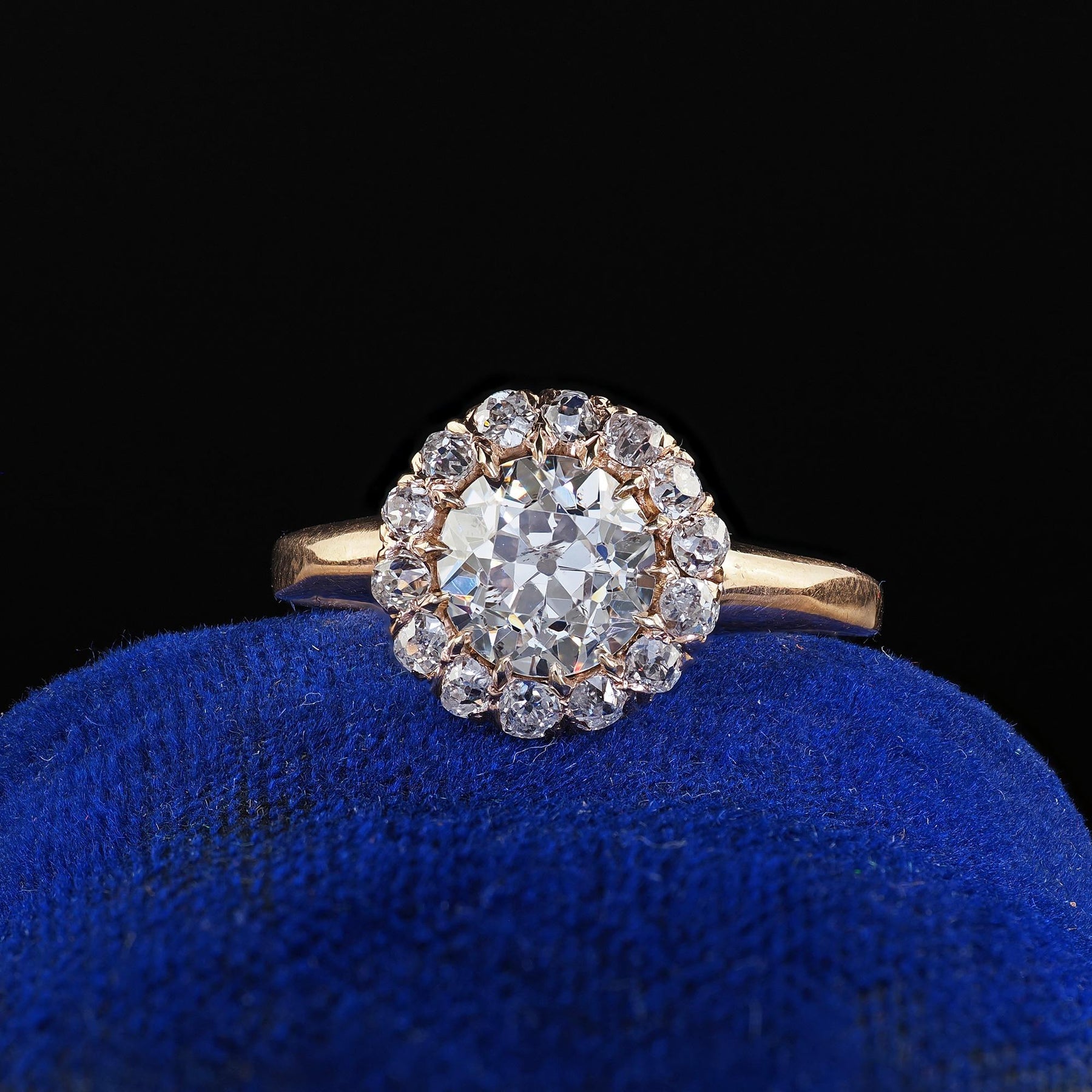 Beautiful Antique Art Deco 14K Yellow Gold Old Euro Diamond Cluster Engagement Ring - GIA. This gorgeous Art Deco old European cut diamond cluster engagement ring is crafted in 14k yellow gold. This beautiful ring features an old cut diamond that has a GIA report. The diamond is set in the center of a classic Art Deco mounting that has old European cut diamonds set around it. The ring is in great condition and sits low on the finger.