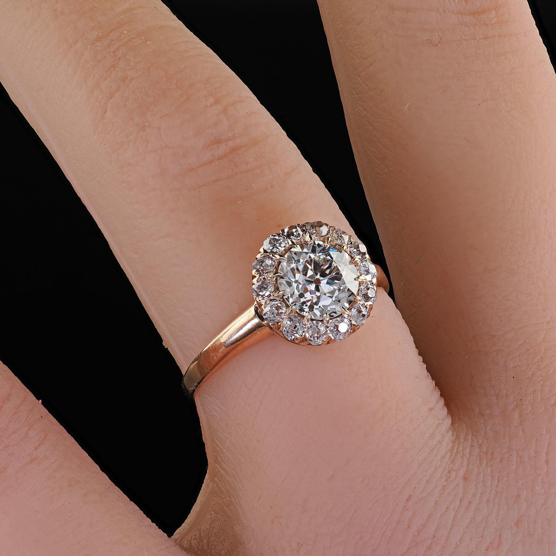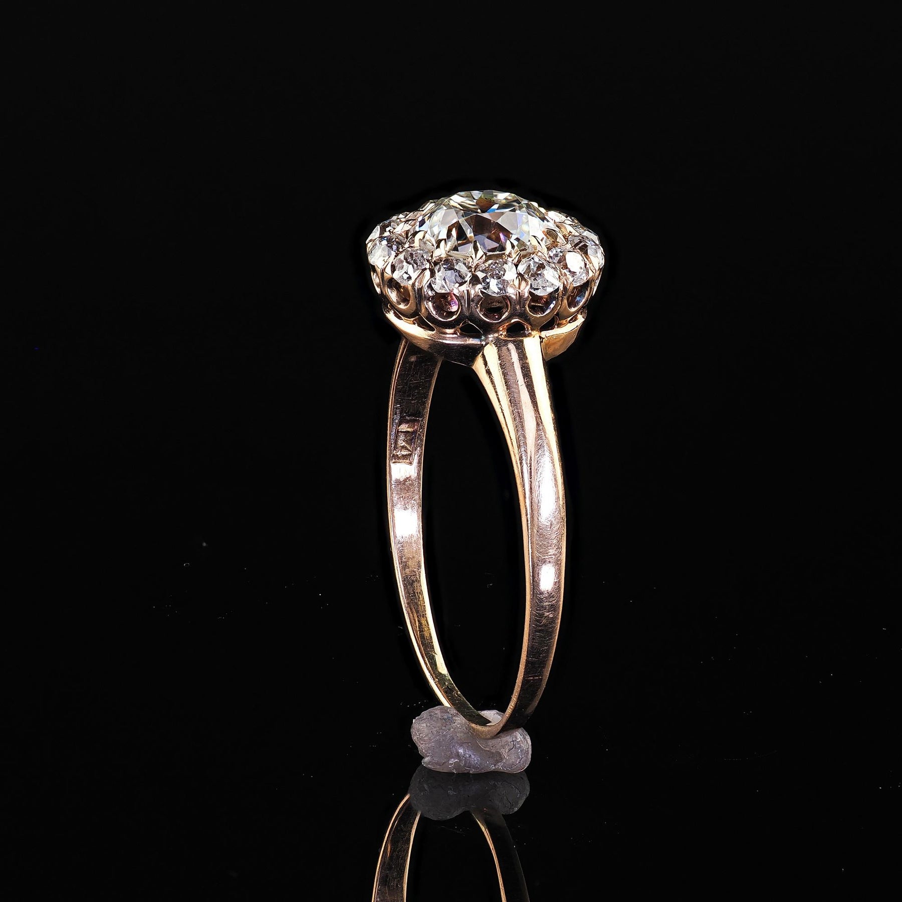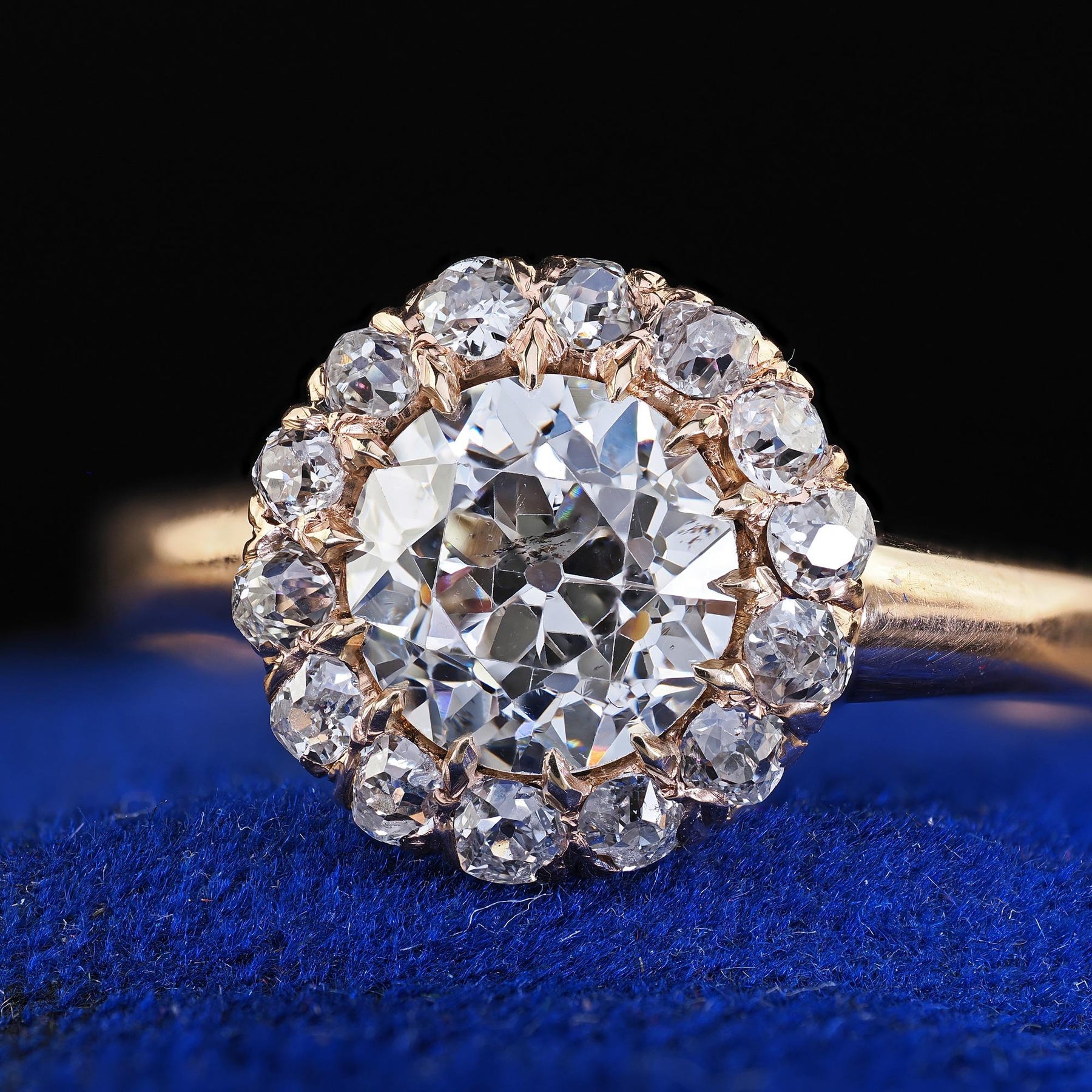 Beautiful Antique Art Deco 14K Yellow Gold Old Euro Diamond Cluster Engagement Ring - GIA. This gorgeous Art Deco old European cut diamond cluster engagement ring is crafted in 14k yellow gold. This beautiful ring features an old cut diamond that has a GIA report. The diamond is set in the center of a classic Art Deco mounting that has old European cut diamonds set around it. The ring is in great condition and sits low on the finger.