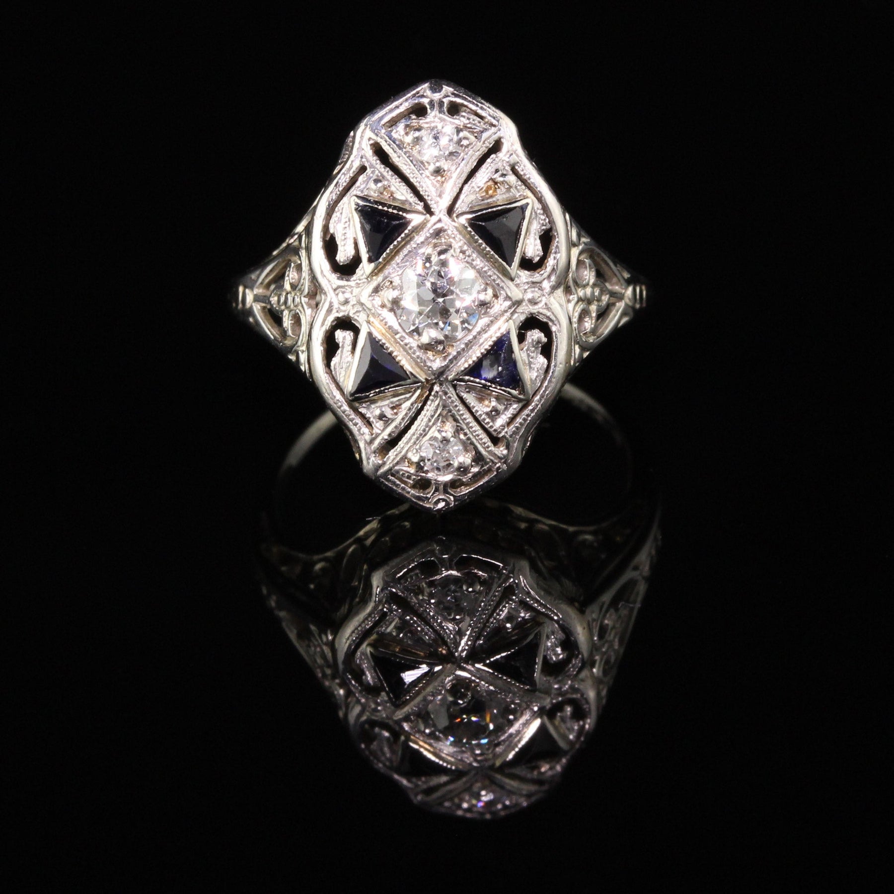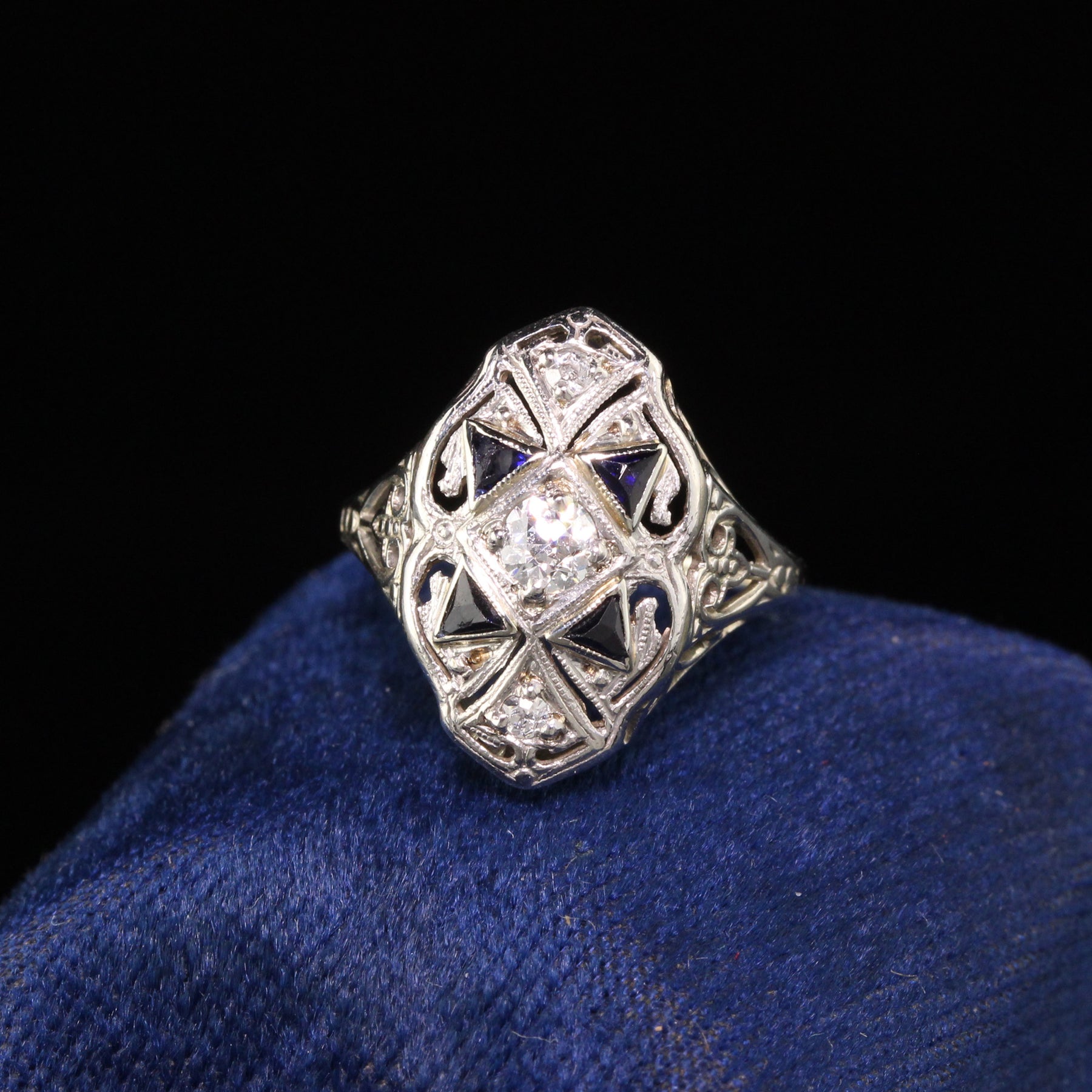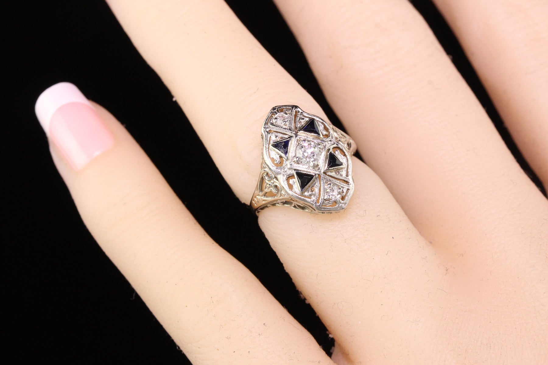 Gorgeous Antique Art Deco 18K White Gold Diamond and Sapphire Shield Ring. This beautiful art deco shield ring features amazing old european cut diamonds and sapphires on a filigree white gold art deco ring.