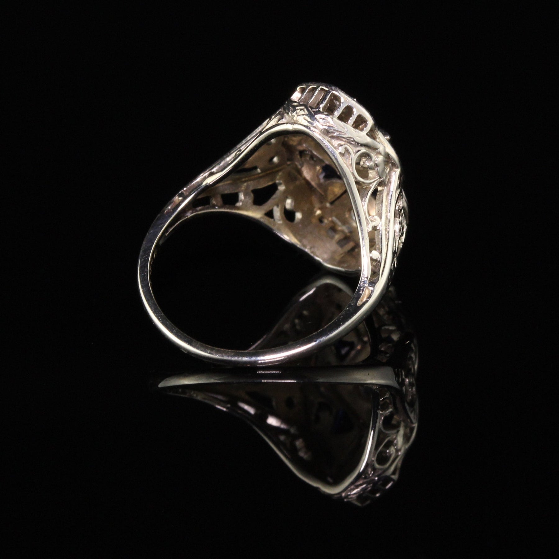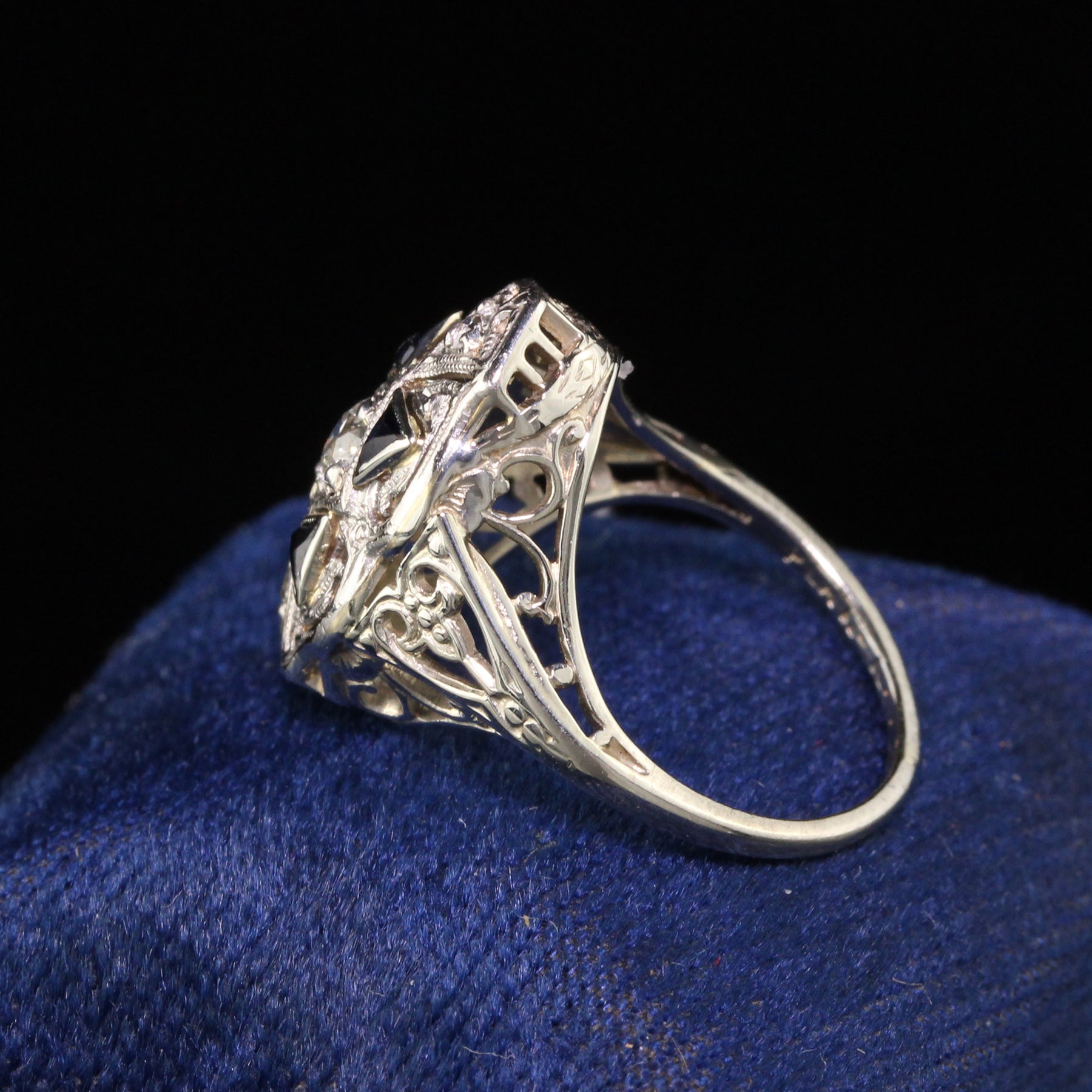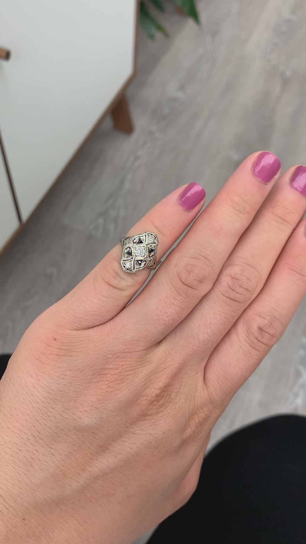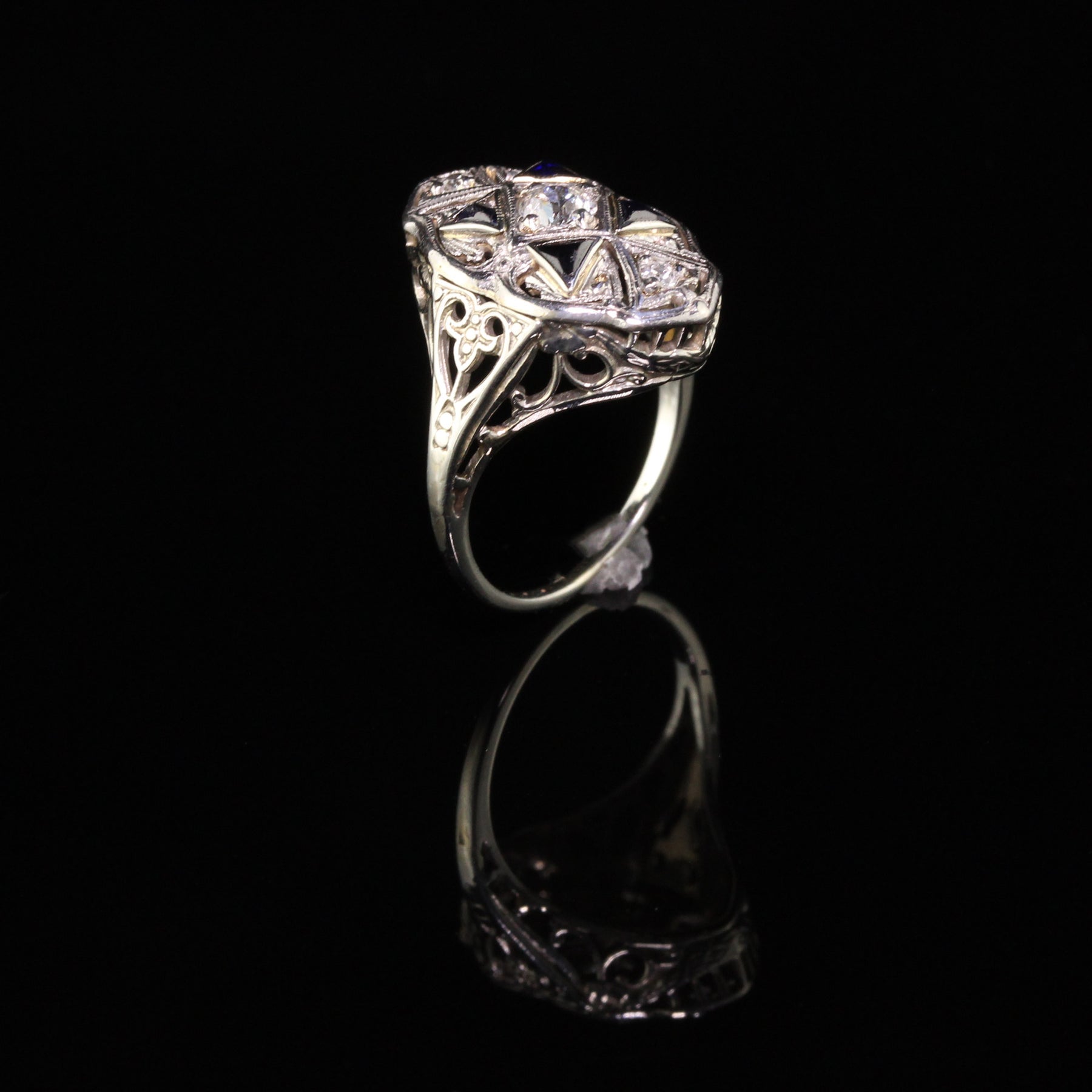 Gorgeous Antique Art Deco 18K White Gold Diamond and Sapphire Shield Ring. This beautiful art deco shield ring features amazing old european cut diamonds and sapphires on a filigree white gold art deco ring.