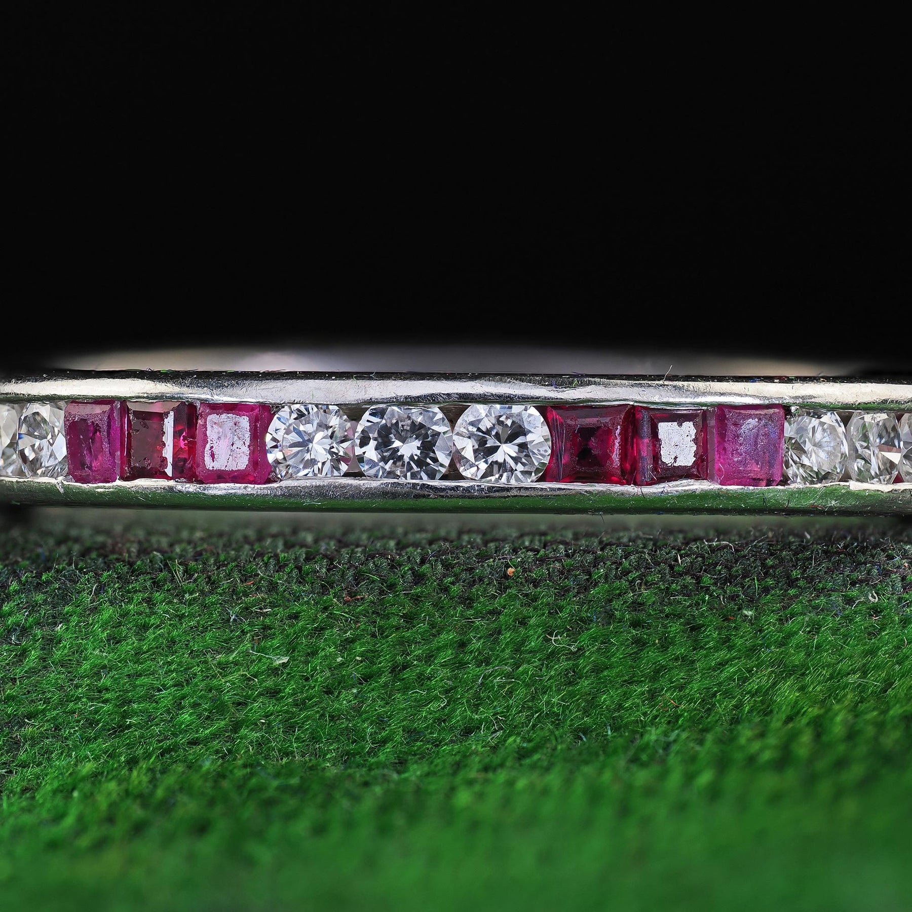 Beautiful Vintage Retro Platinum Diamond and Ruby Eternity Wedding Band - Size 6 1/2. This incredible Retro diamond and ruby wedding band is crafted in platinum. This beautiful ring features round cut diamonds and rubies alternating around the entire ring. The rubies have mild abrasions on them but do not detract from its beauty and color. The ring sits beautifully on the finger and is in good condition.